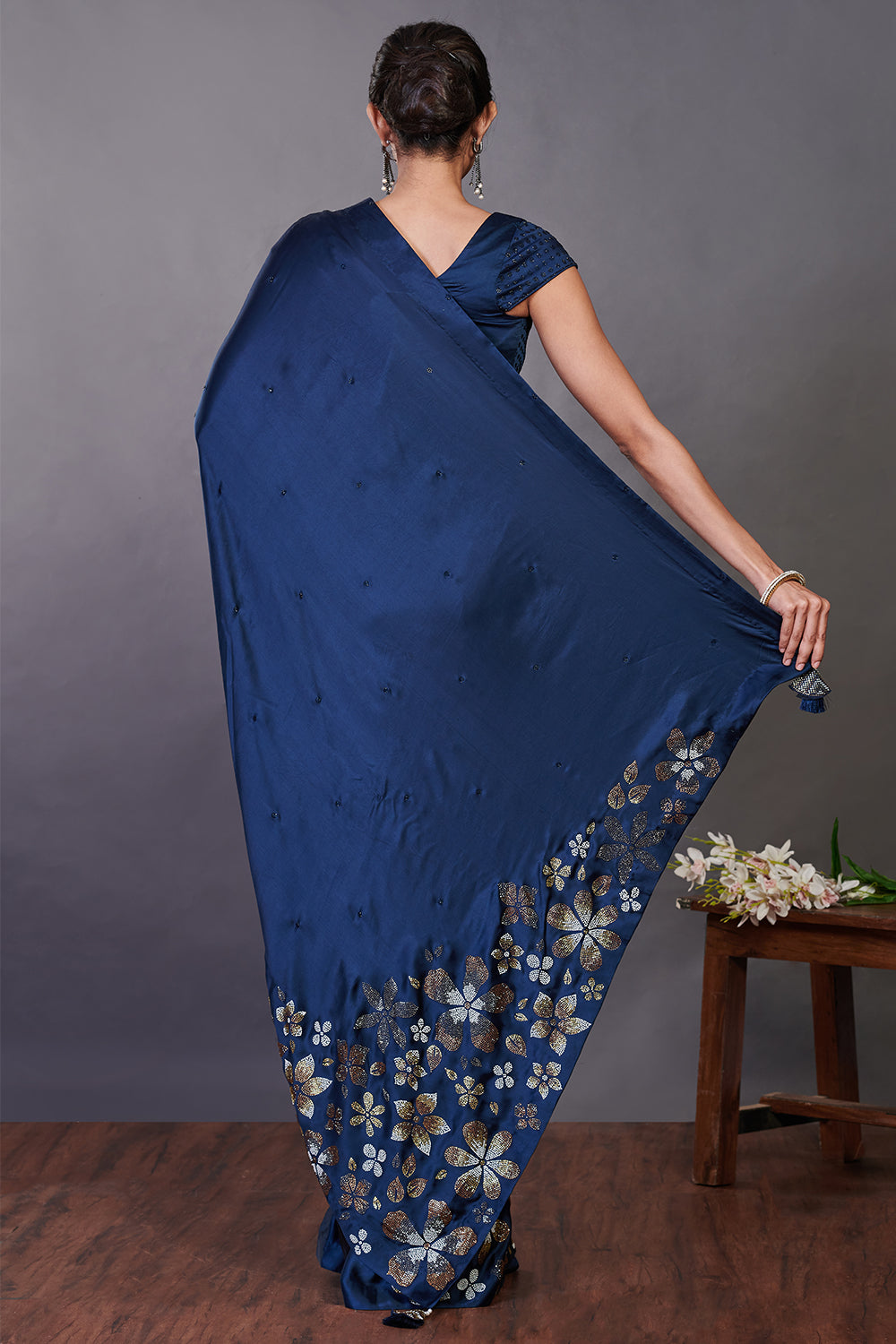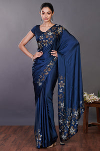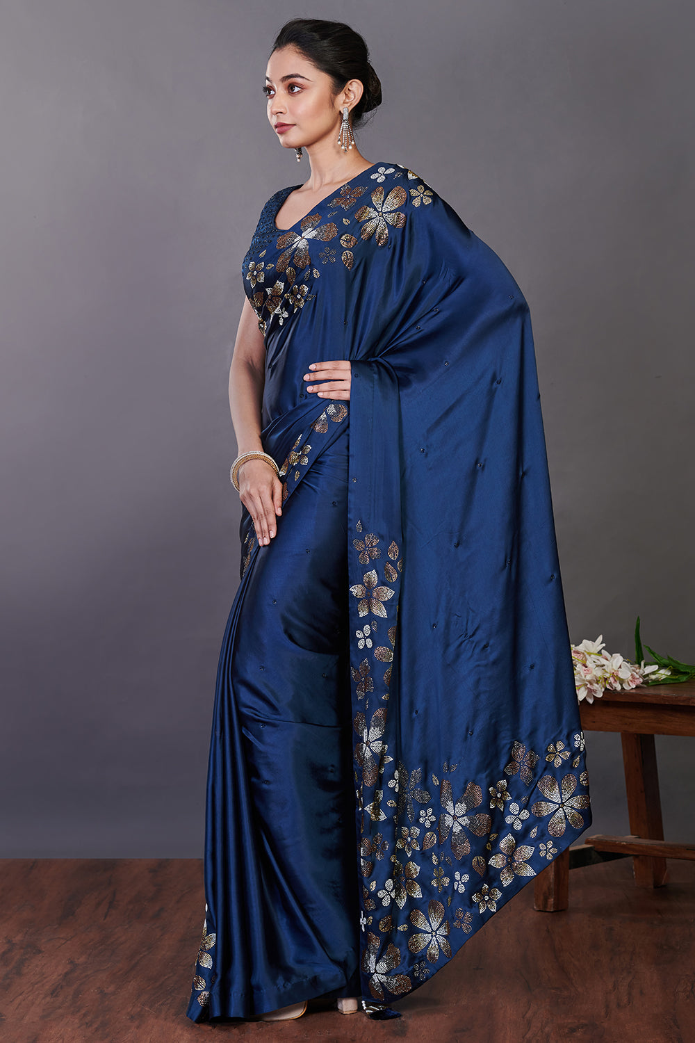 Beautiful blue satin saree with Swarovski work floral motifs. It comes with a matching saree blouse. Shop designer saris online in USA from Pure Elegance.