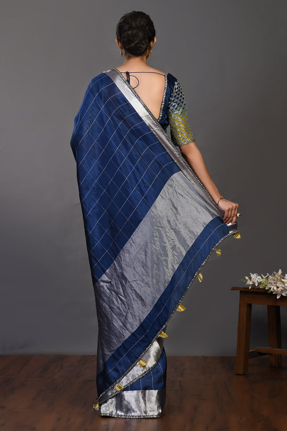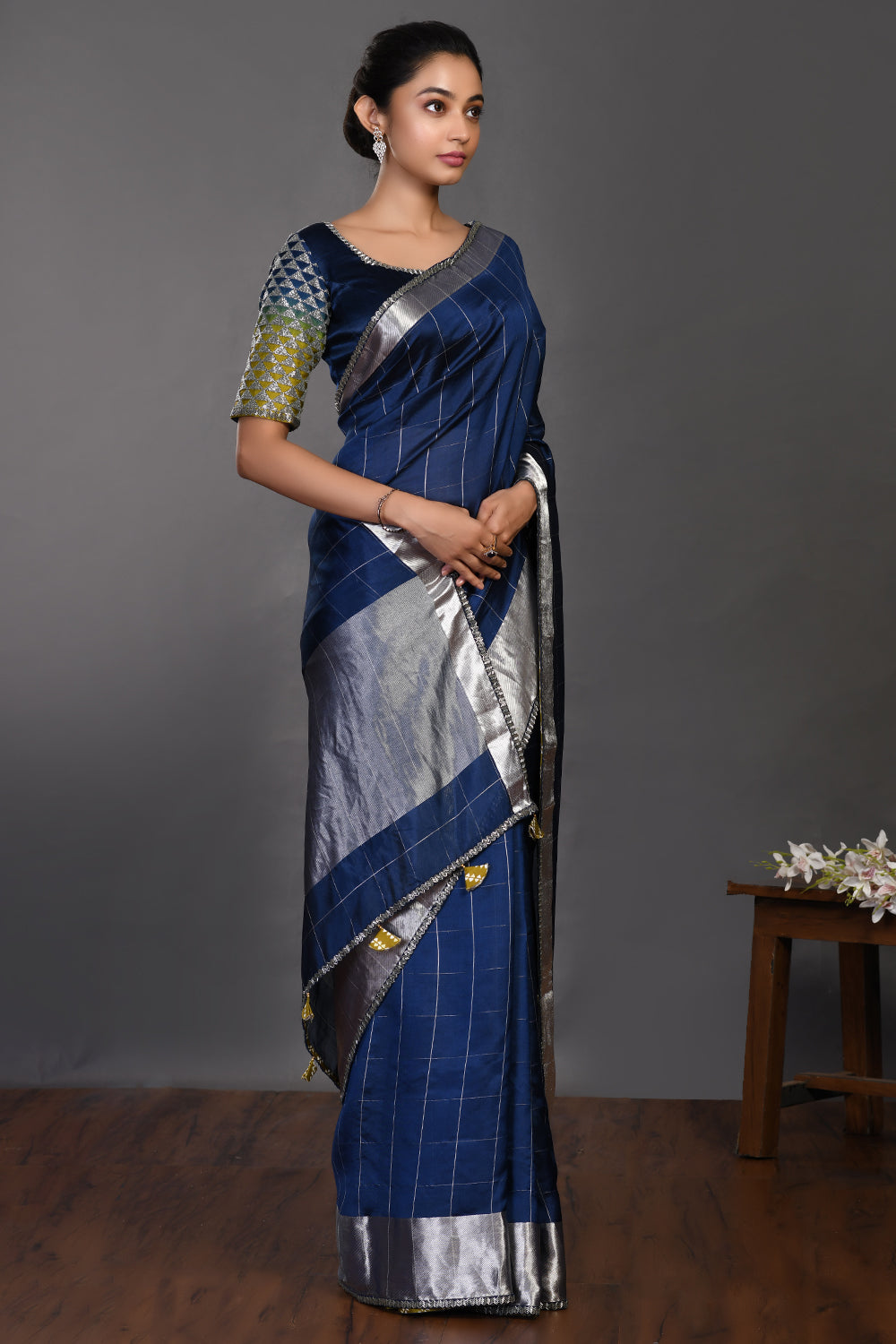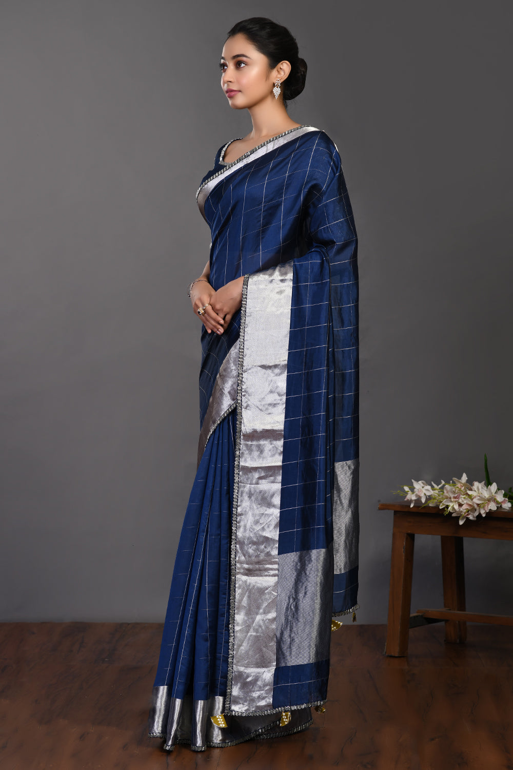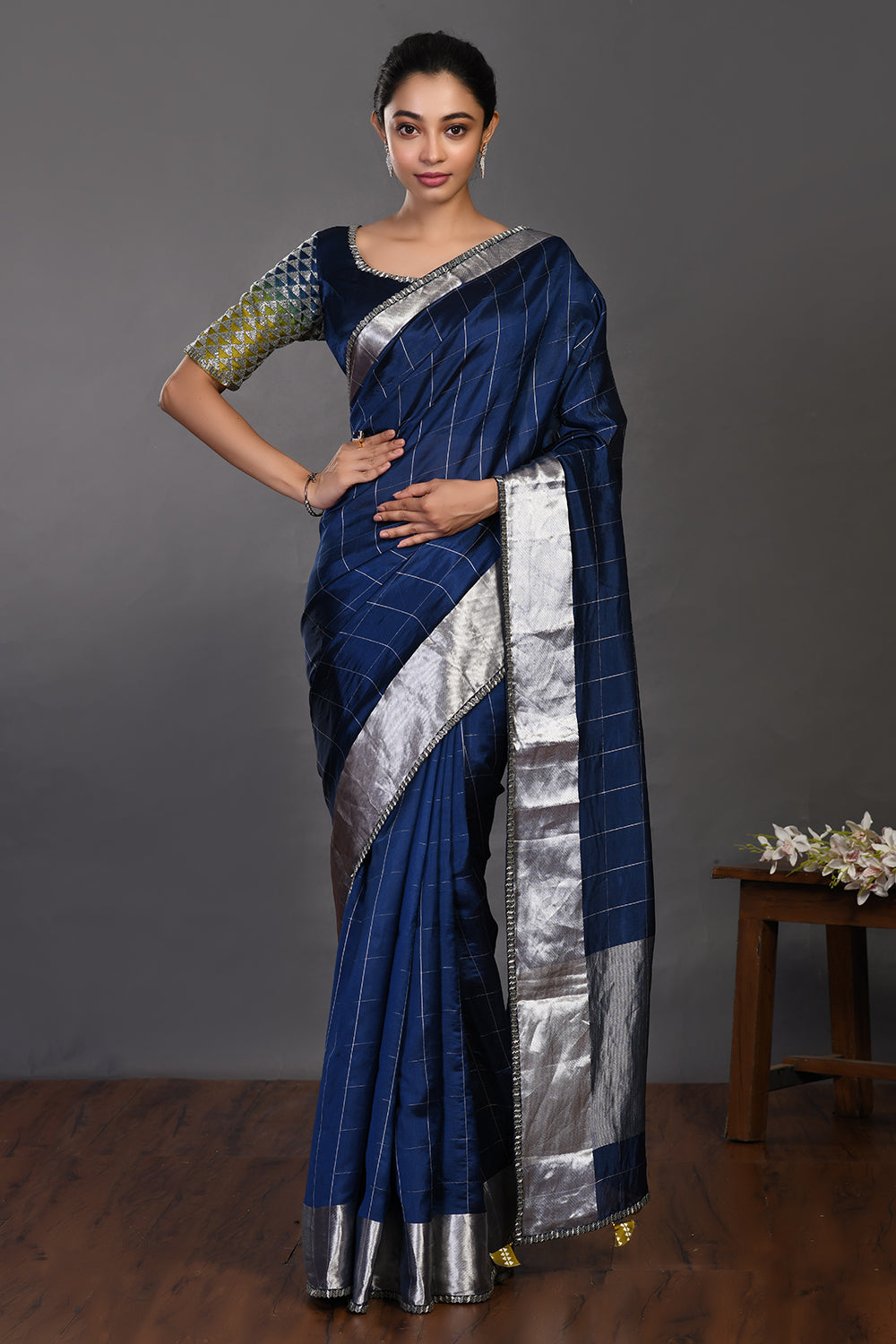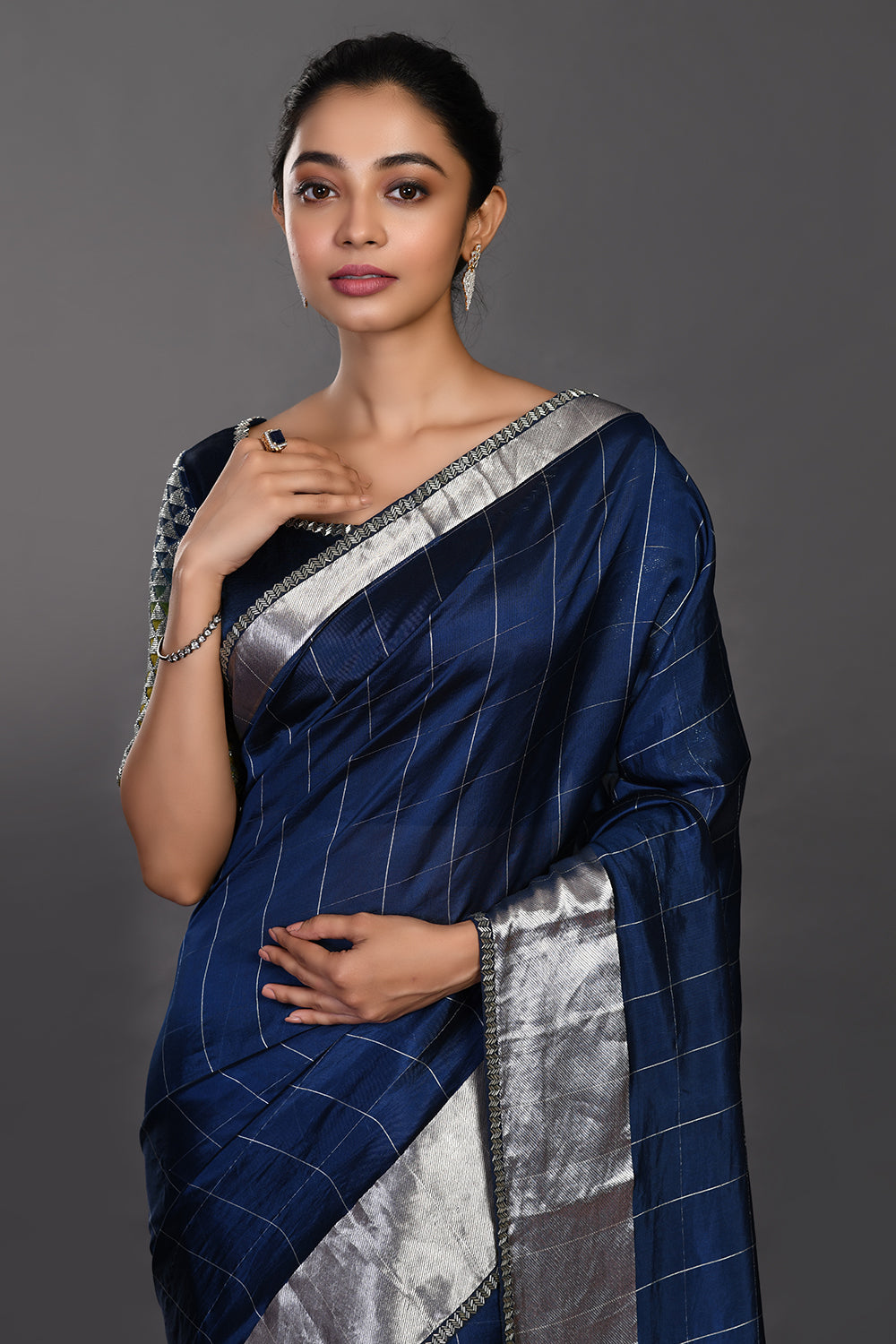 Beautiful navy blue handloom saree with silver zari border and cutdana work. It comes with a designer saree blouse. Shop designer saris online in USA from Pure Elegance.
