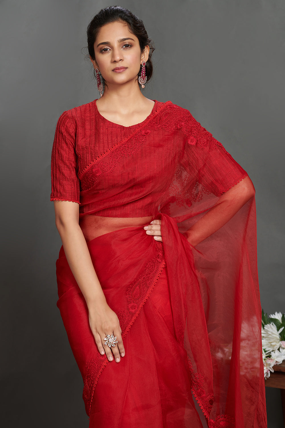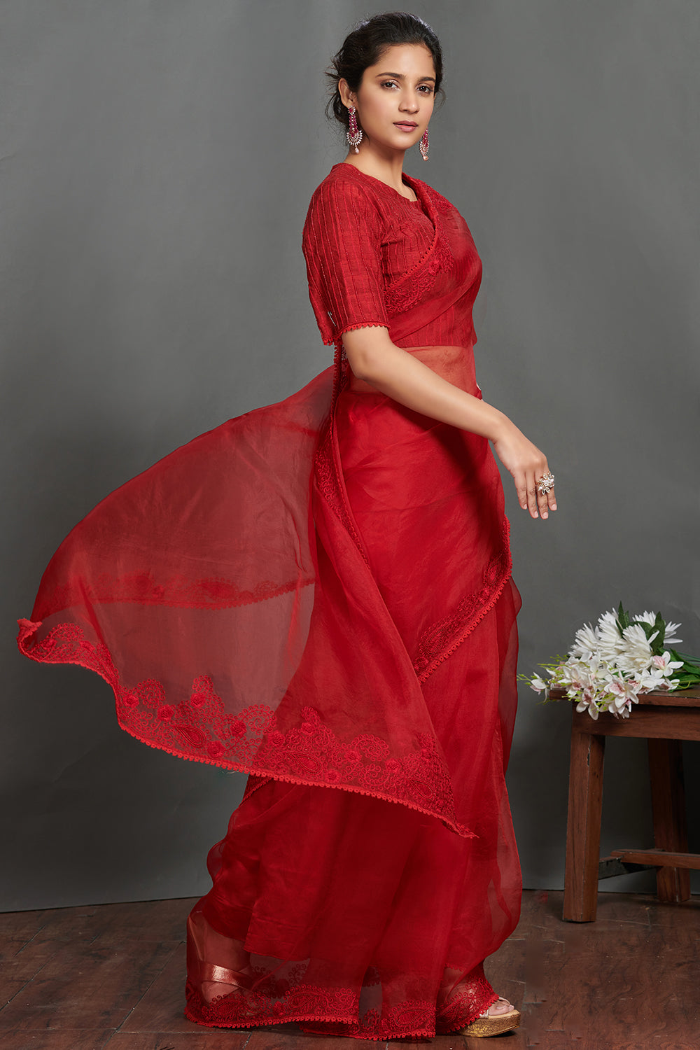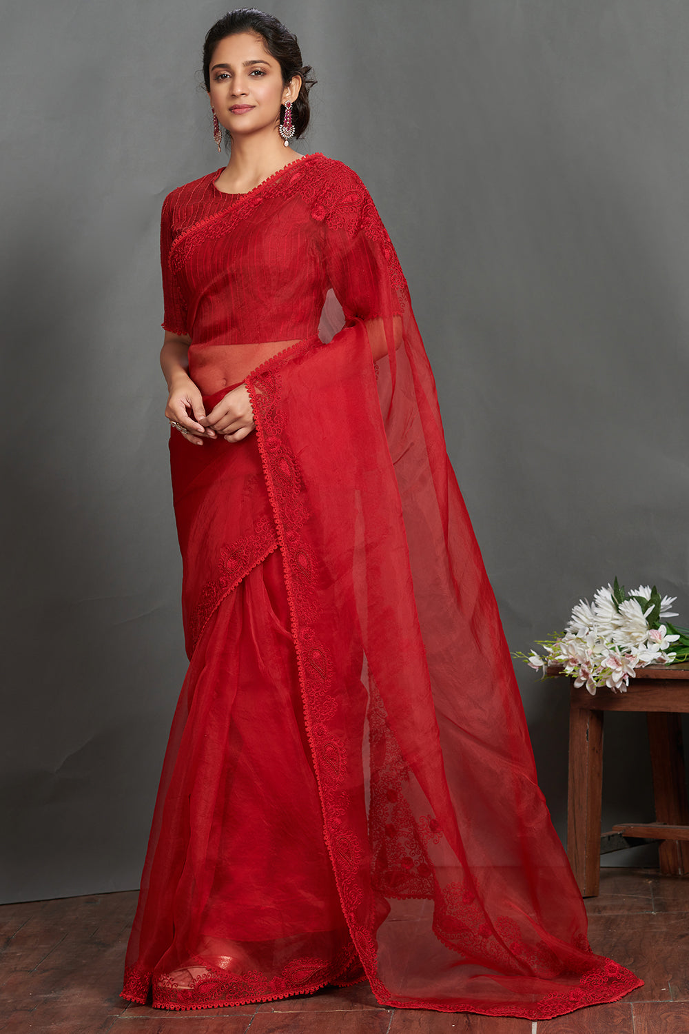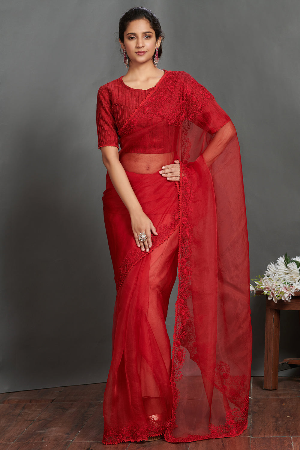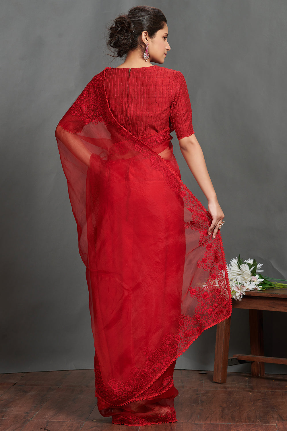 Beautiful maroon embroidered lace organza saree. It comes with an embroidered blouse. Shop designer saris online in USA from Pure Elegance.