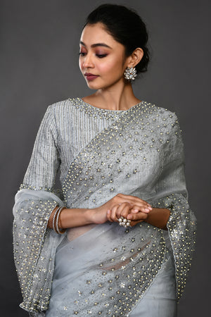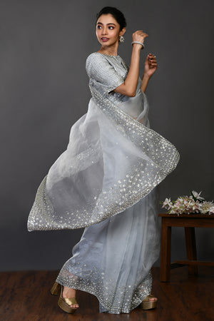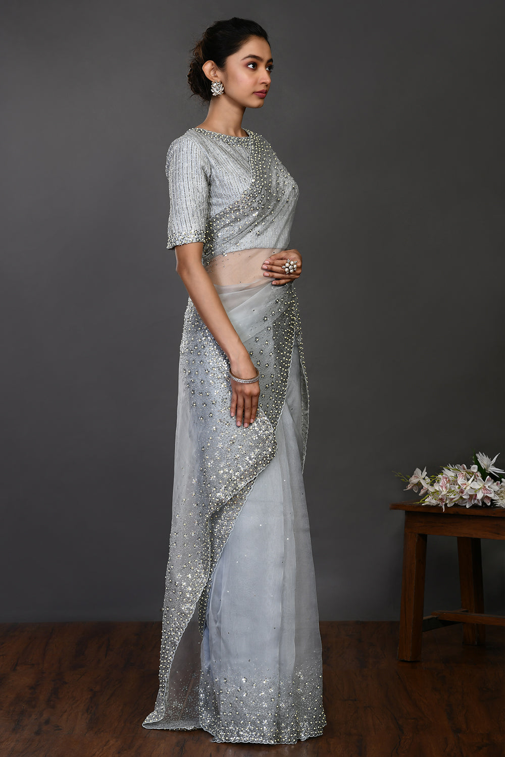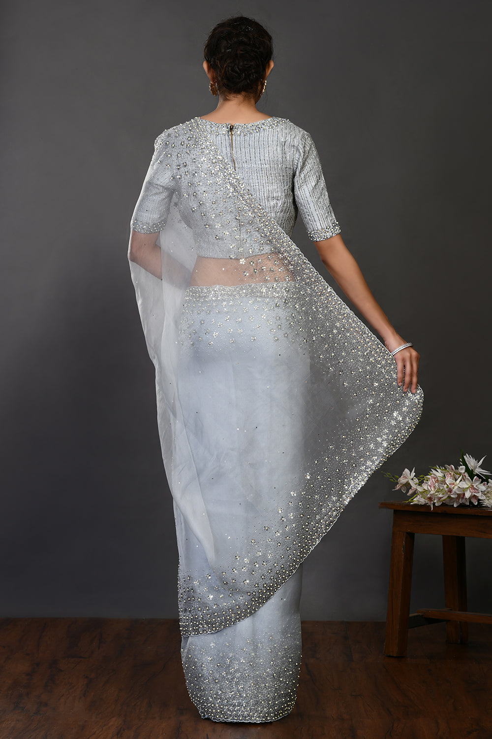 Beautiful doctor blue tikki, cutdana, sequin and pearl work organza saree. It comes with a matching saree blouse. Shop designer saris online in USA from Pure Elegance.