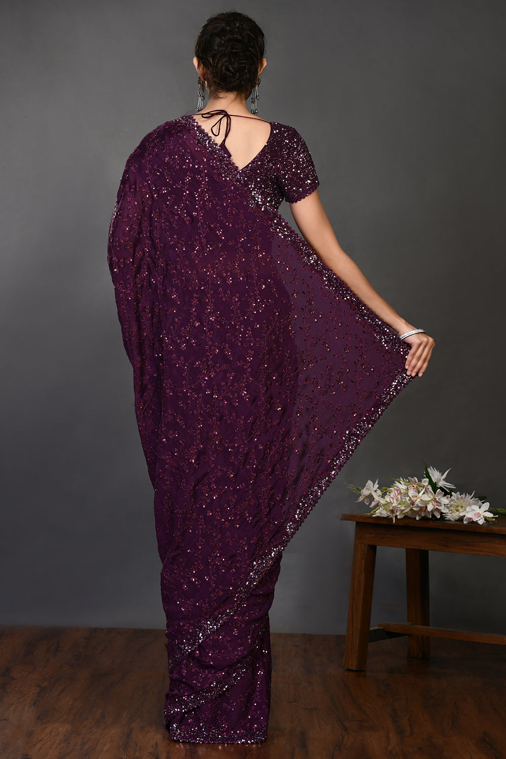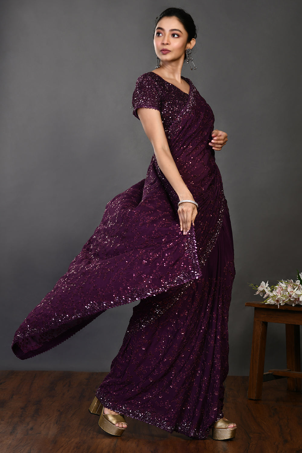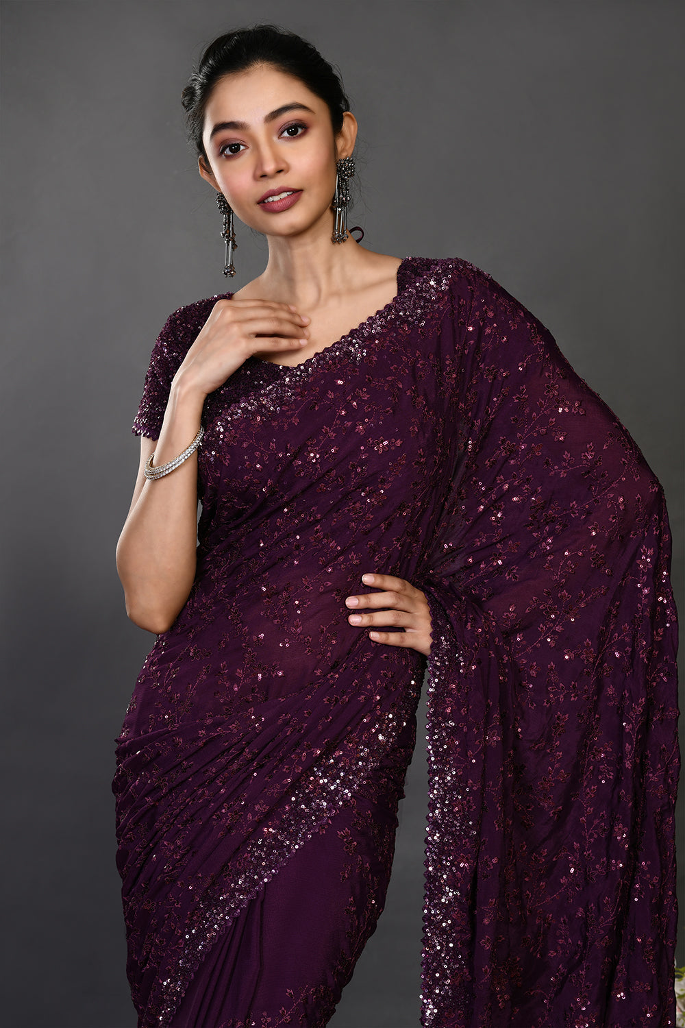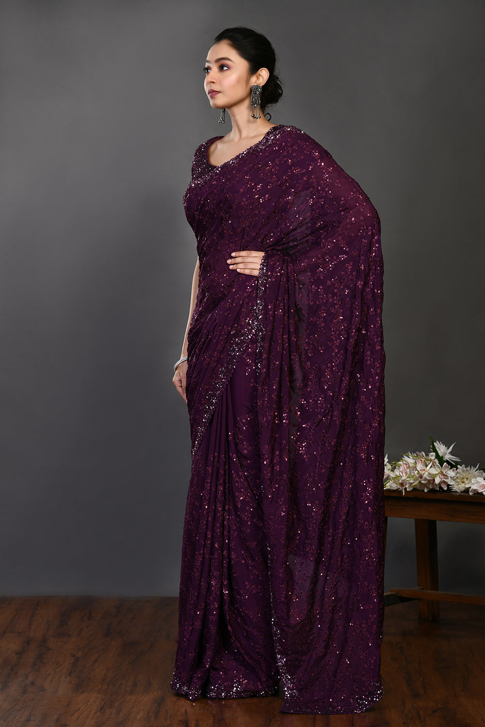 Beautiful wine color tikki work handloom saree. It comes with a matching saree blouse. Shop designer saris online in USA from Pure Elegance.