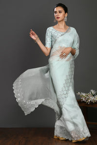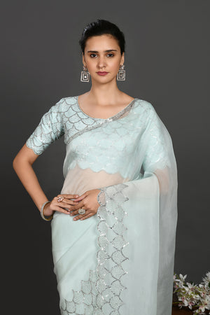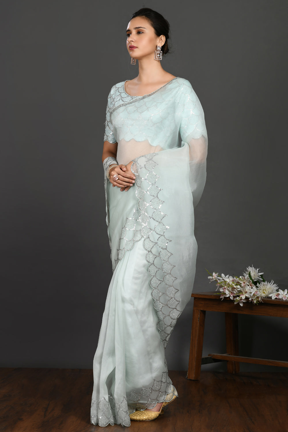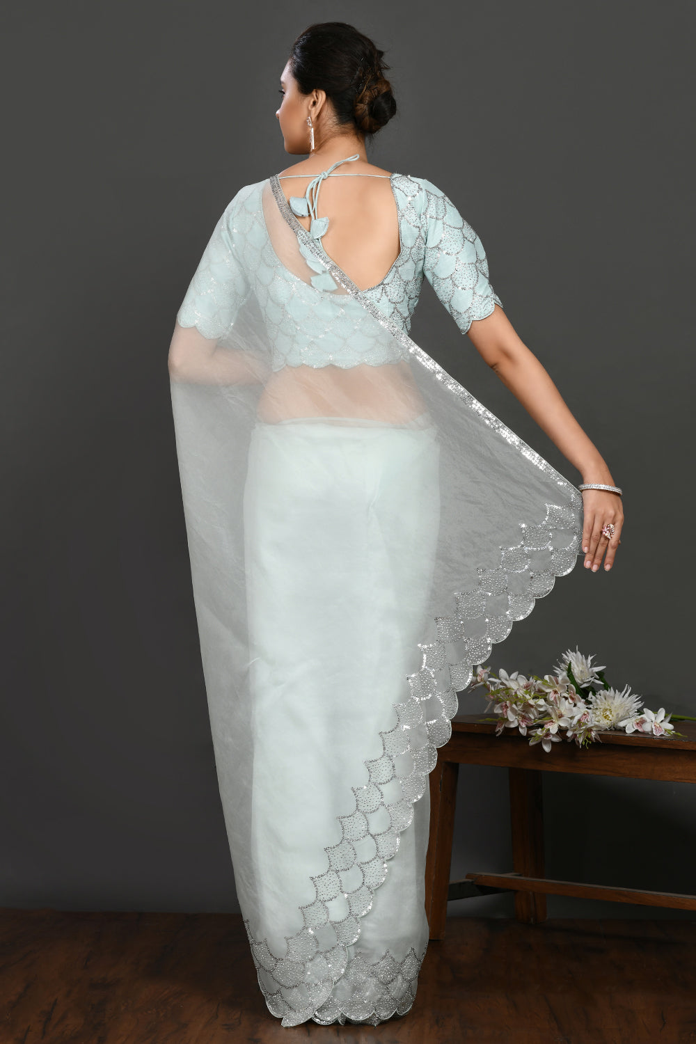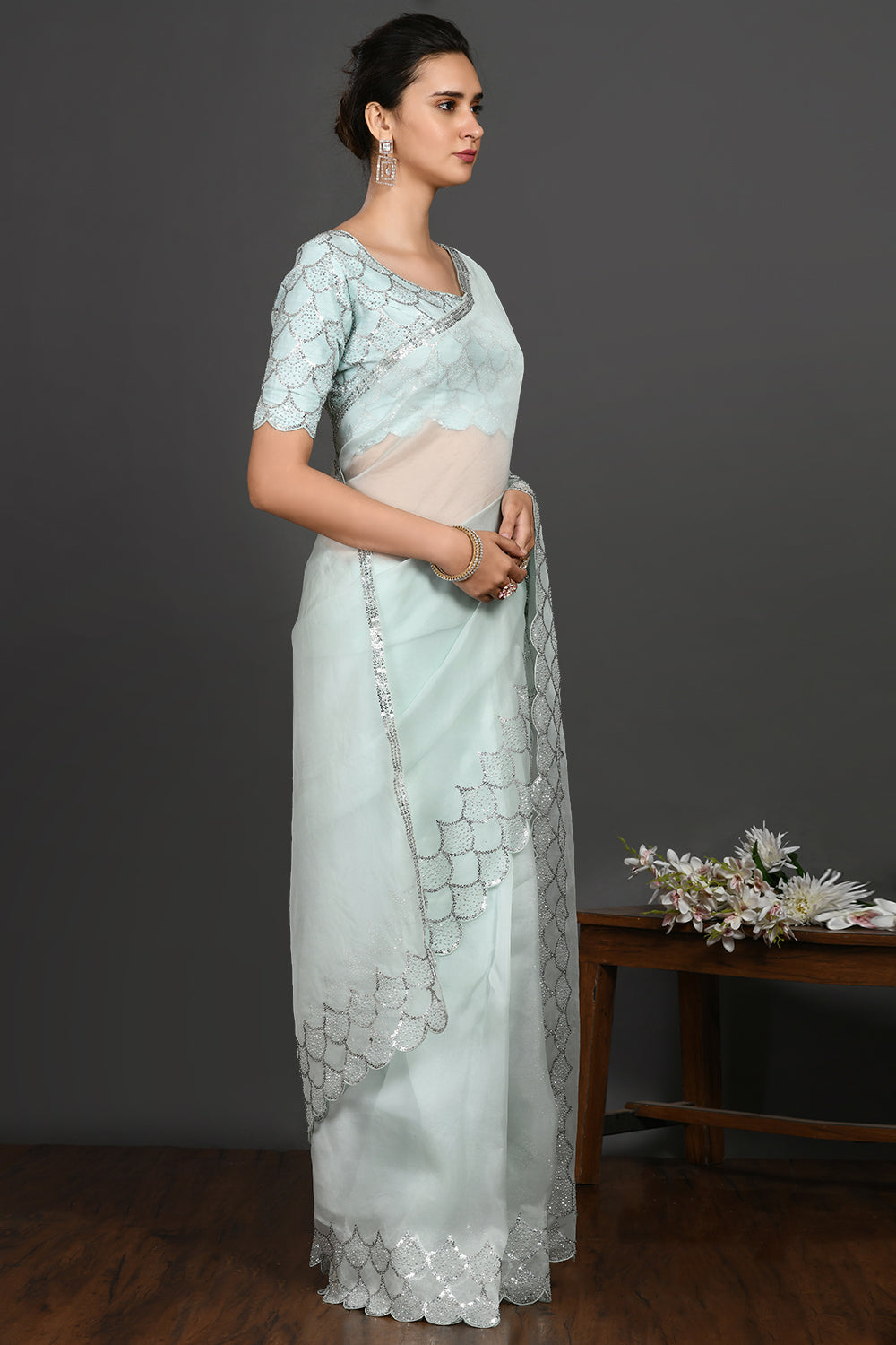 Beautiful aqua blue stone and sequin work organza saree. It comes with an embroidered saree blouse. Shop designer saris online in USA from Pure Elegance.