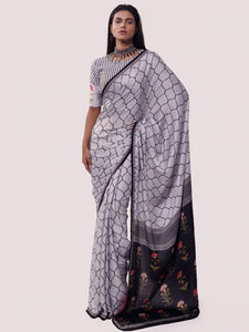 Beautiful white and black printed handloom saree. It comes with embroidered saree blouse. Shop designer saris online in USA from Pure Elegance.