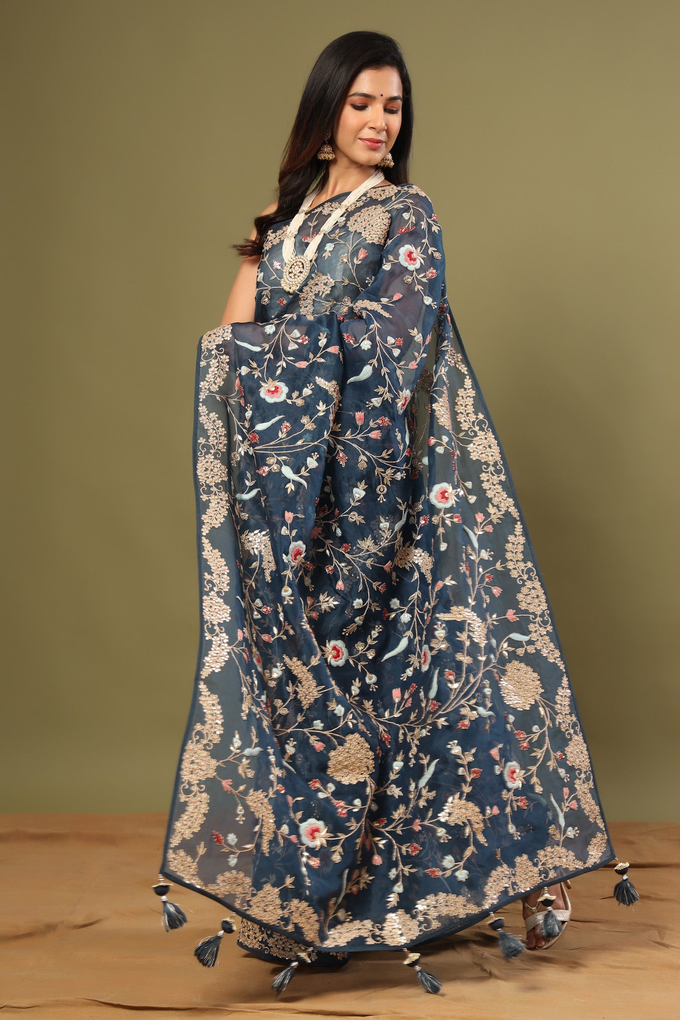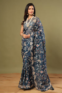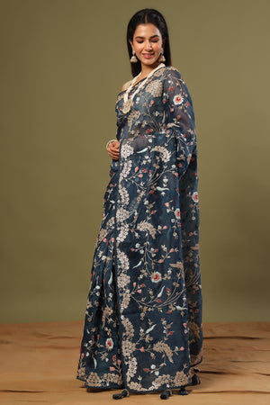 Look royal in this beautiful blue floral embroidery organza saree on festive occasions! It comes with a blouse piece.
