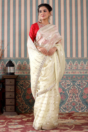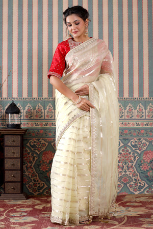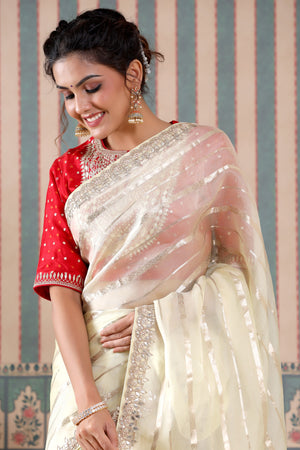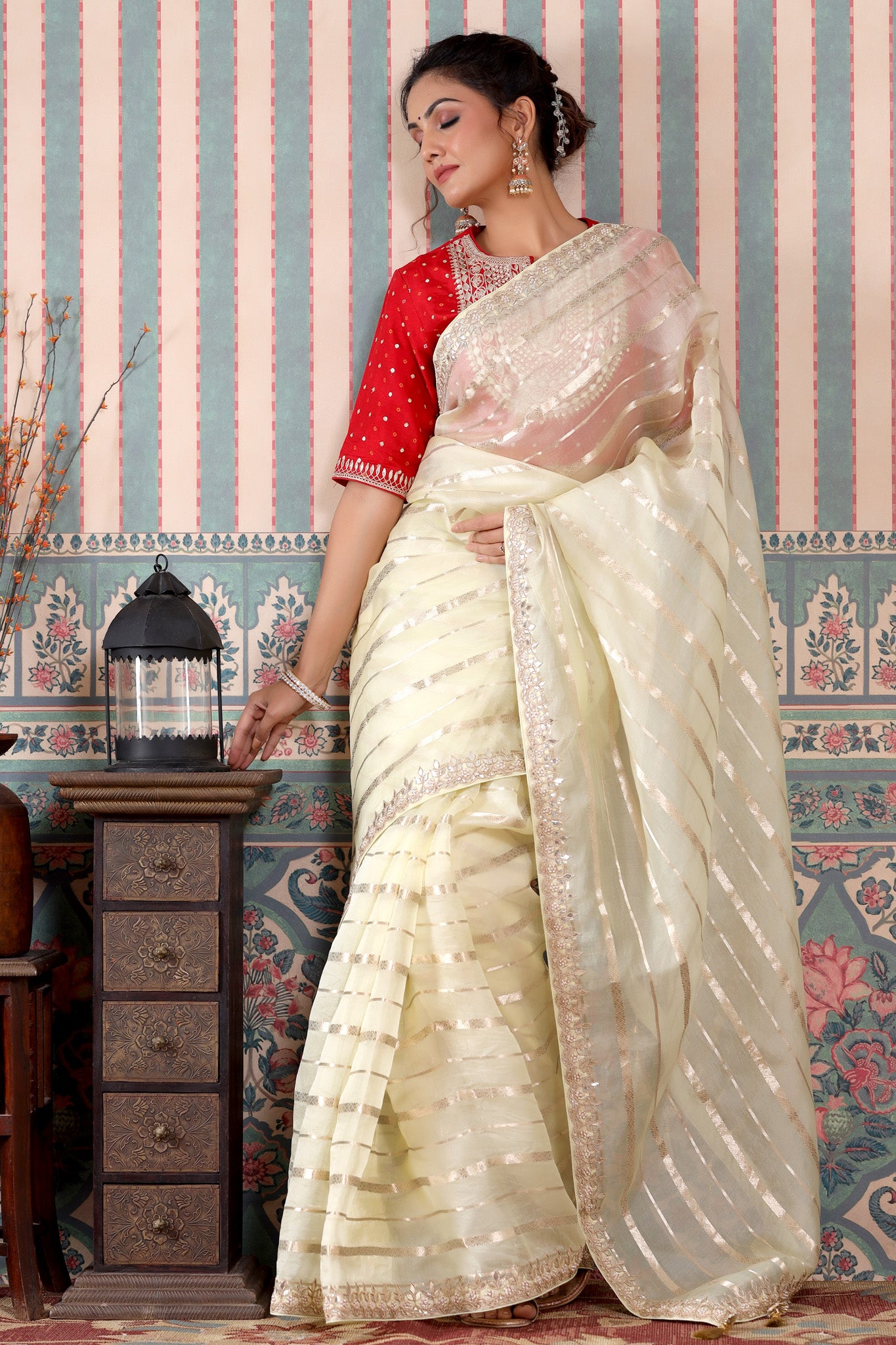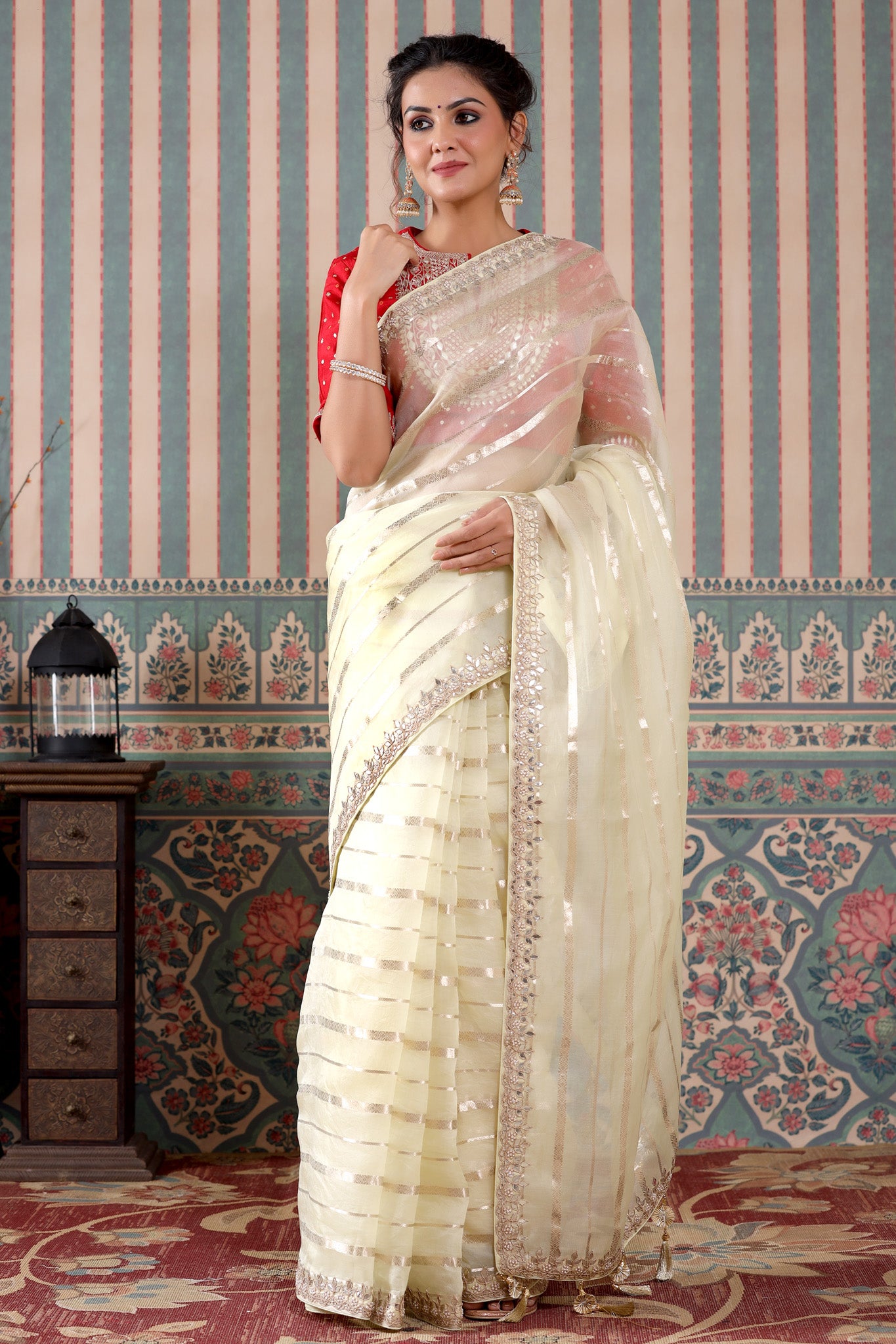 Beautiful lemon yellow striped organza silk sari with gota embroidery border is a perfect drape for festive occasions! It comes with a dark green gota embroidery blouse.