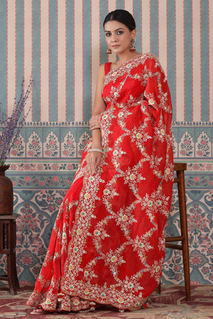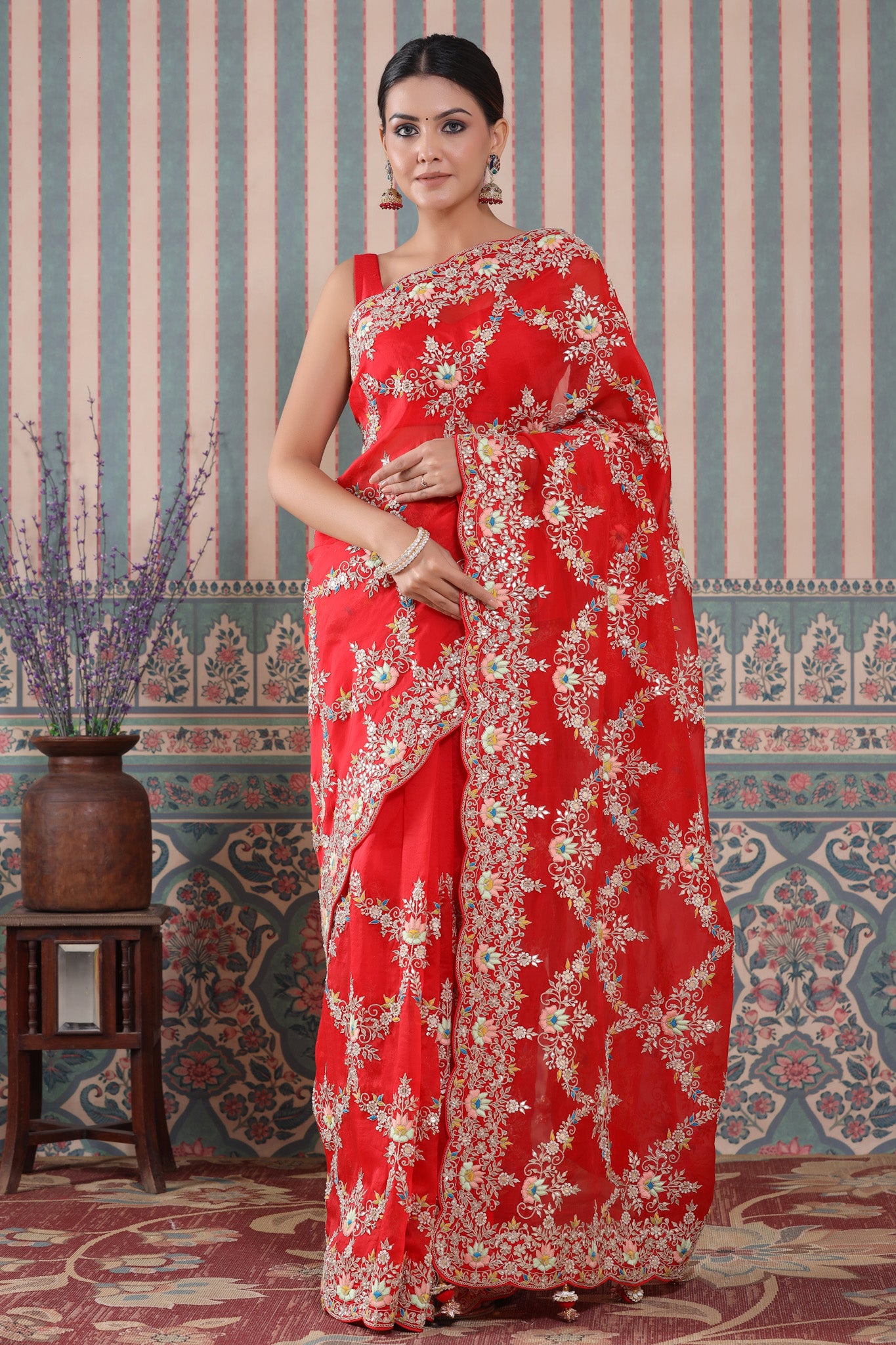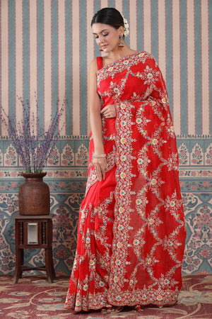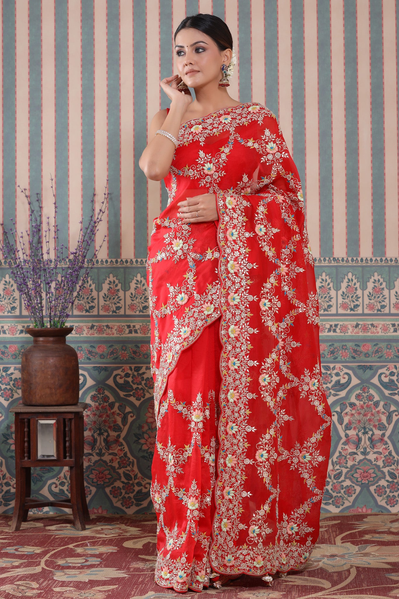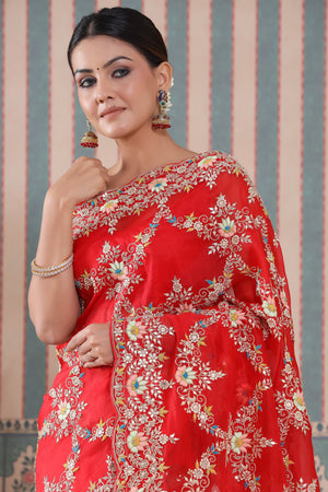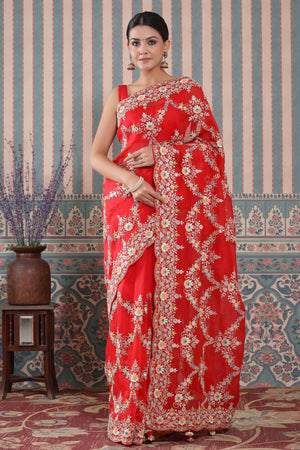 Beautiful red heavy embroidery organza saree is a perfect drape for weddings and festive occasions! It comes with a blouse piece.