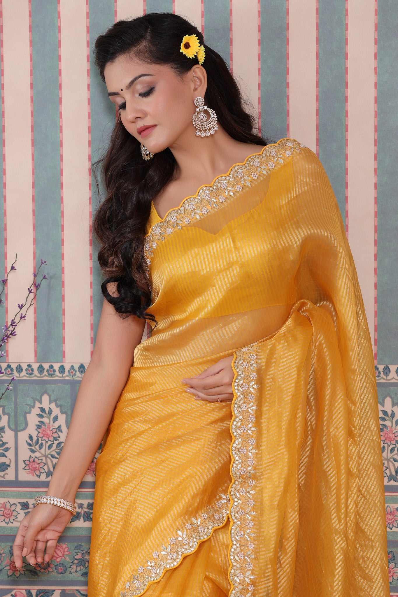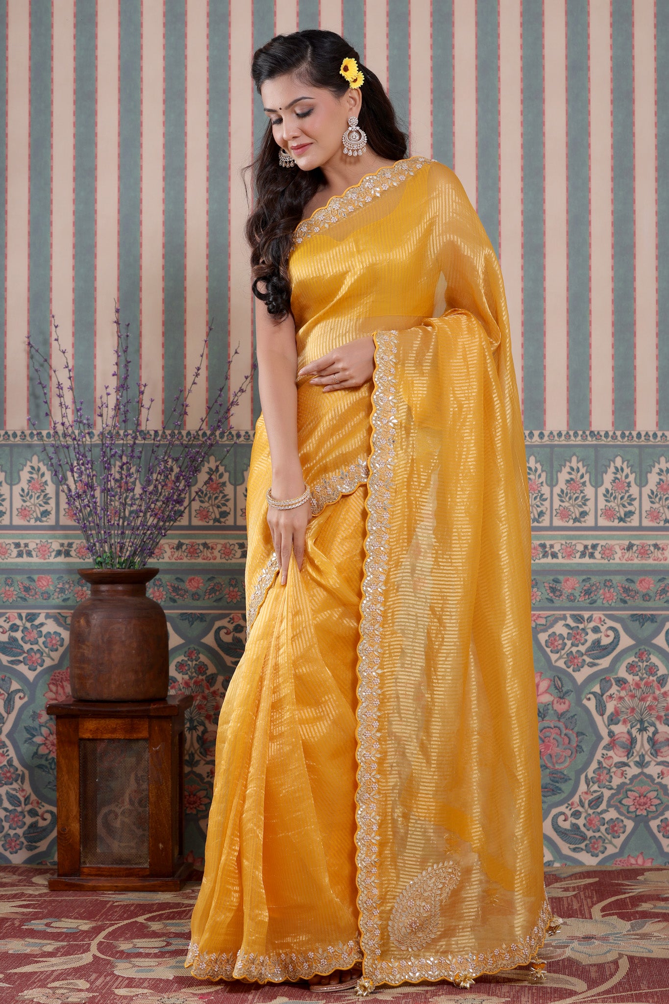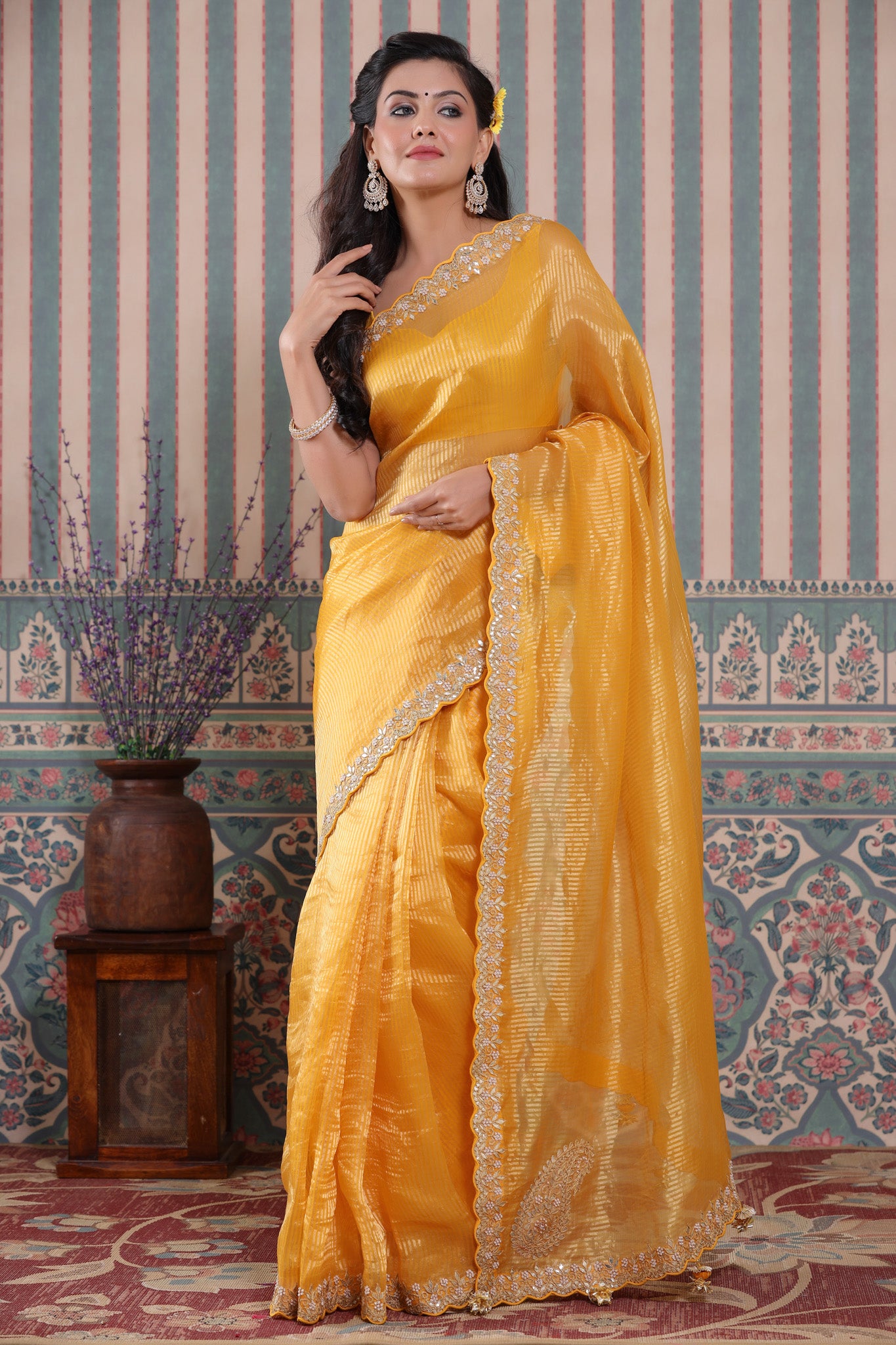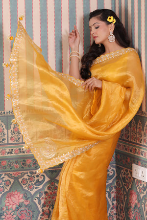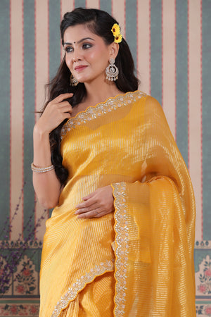 Beautiful yellow embroidered tissue silk Banarasi saree is a perfect drape for festive occasions! It comes with a blouse piece.