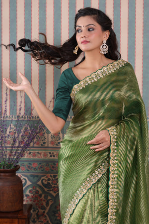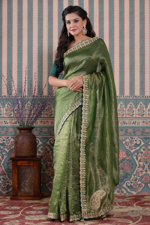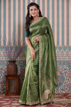 Beautiful mehendi green embroidered tissue silk Banarasi saree is a perfect drape for festive occasions! It comes with a blouse piece.