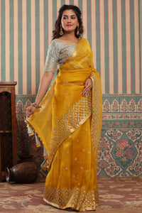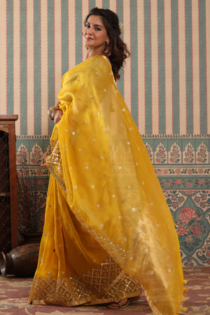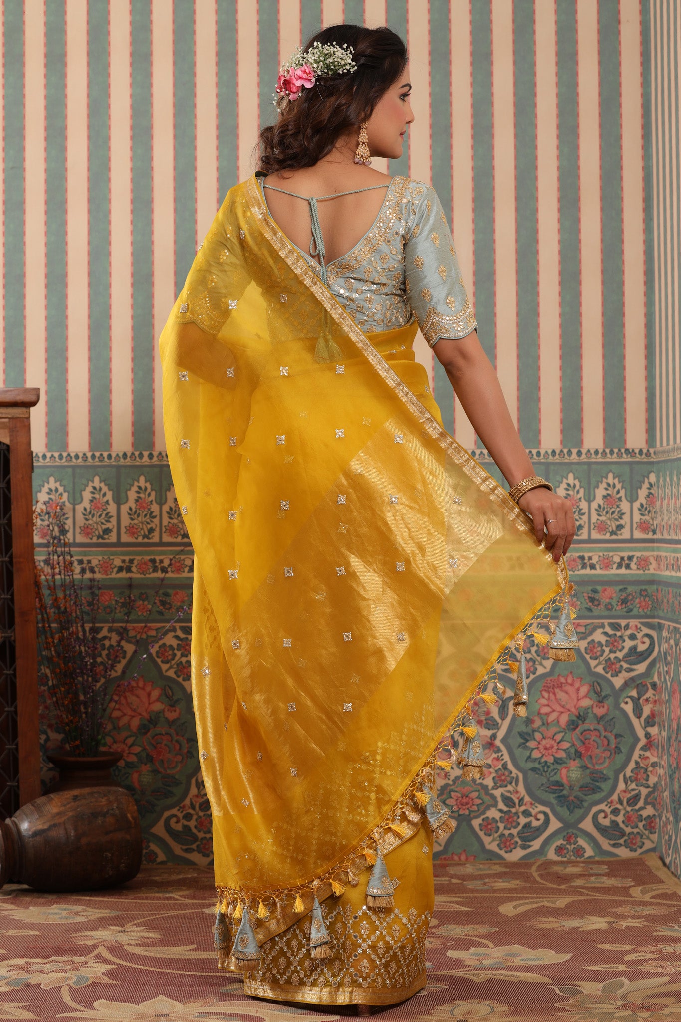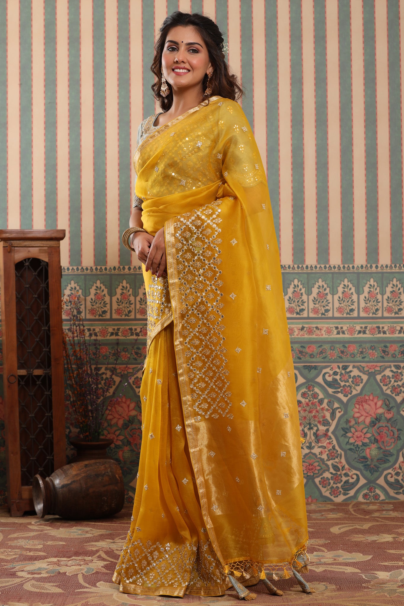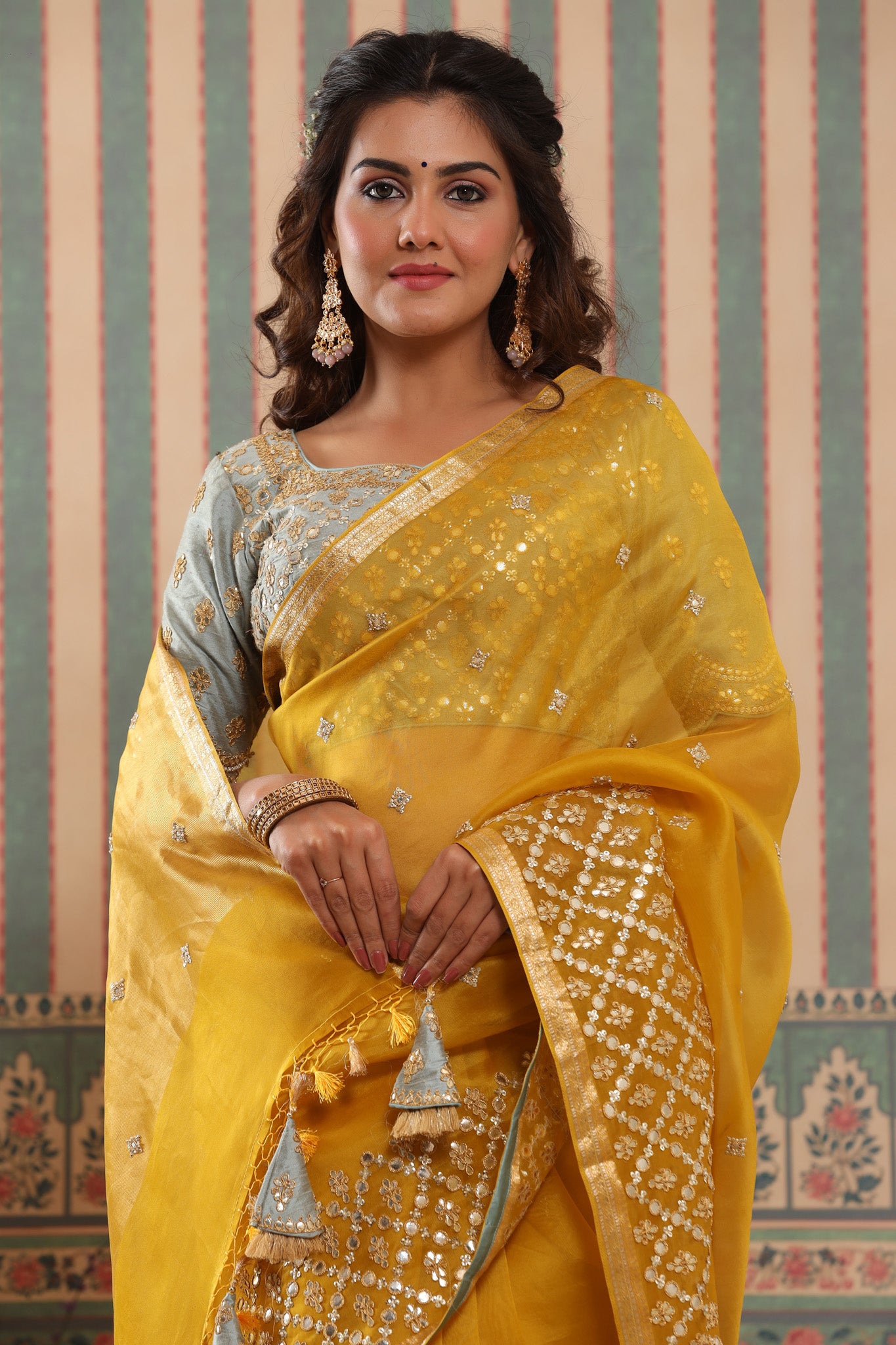 Beautiful yellow organza silk saree with gota work border is perfect for festive occasions! It comes with a green embroidered saree blouse