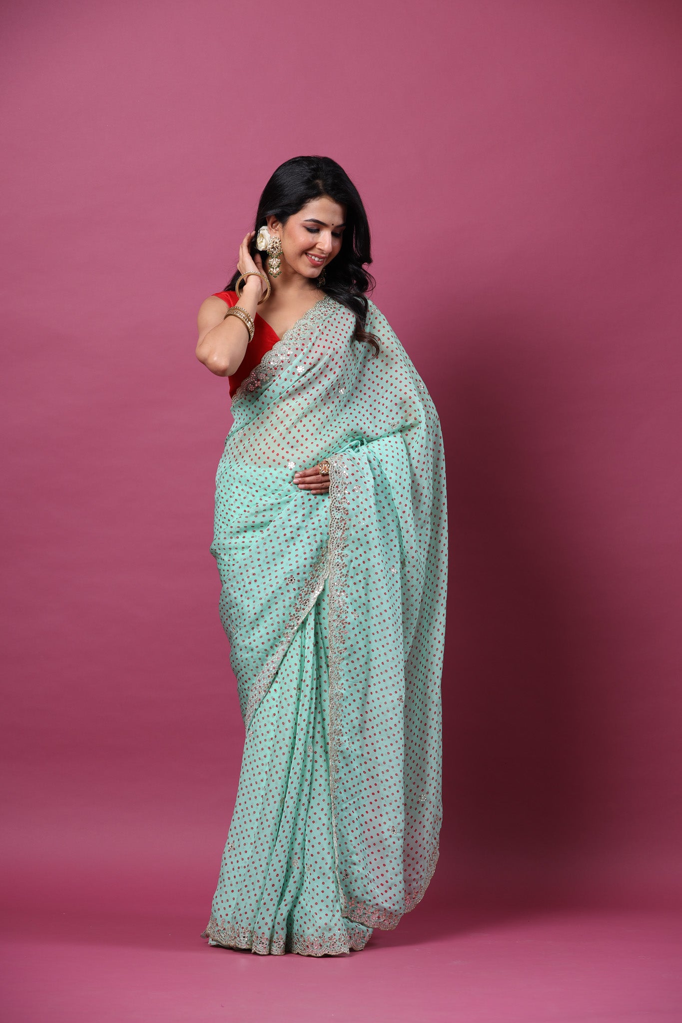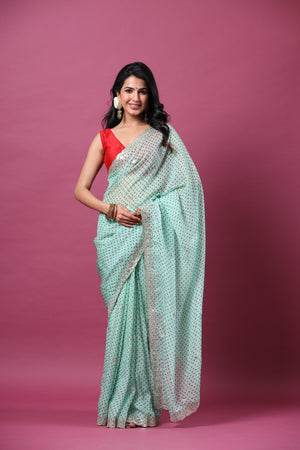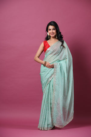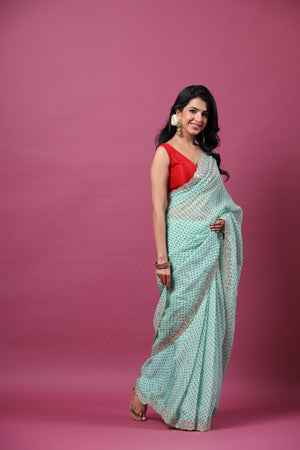 Beautiful mint green bandhej organza saree is perfect for festive occasions! The saree has a beautiful scalloped embroidered border. It comes with a saree blouse piece.