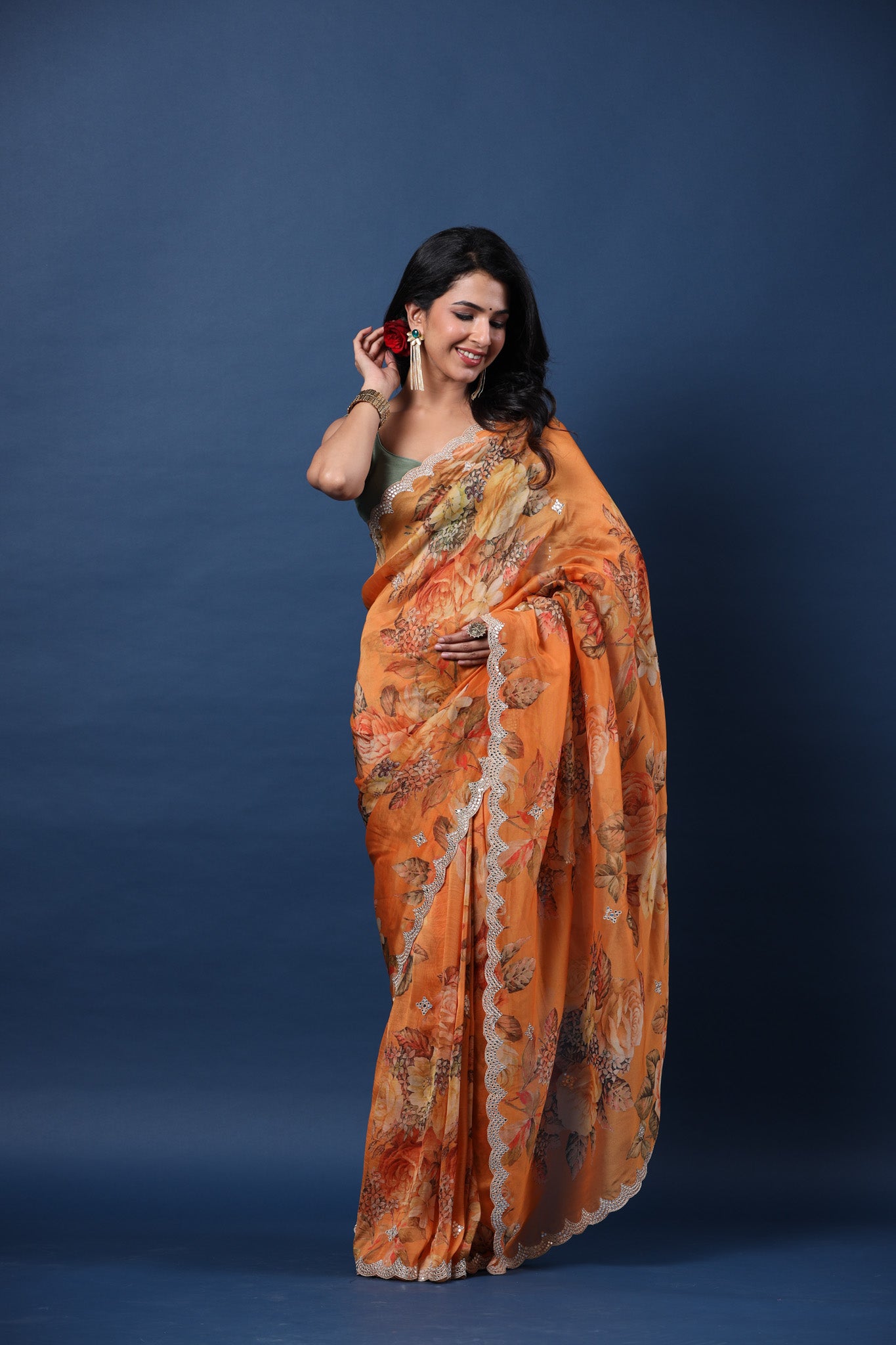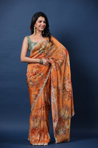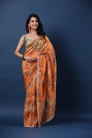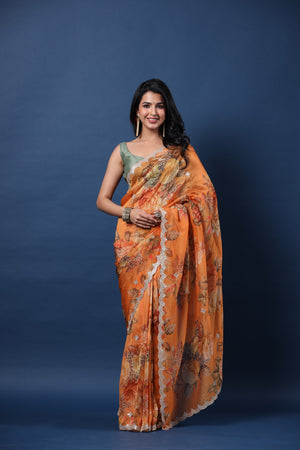 Alluring orange embroidered floral organza silk saree is perfect for festive occasions! It comes with a green saree blouse piece.