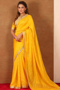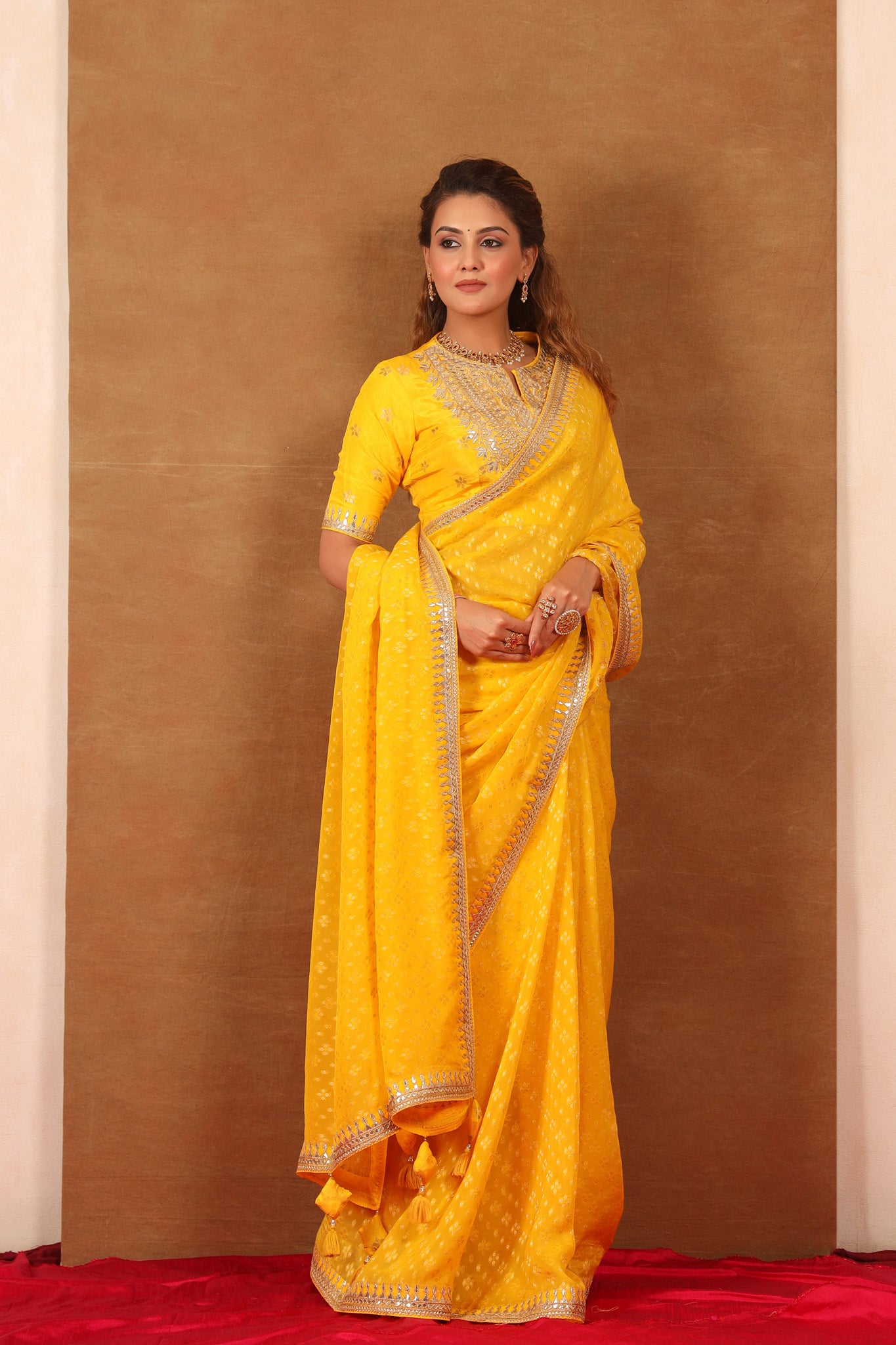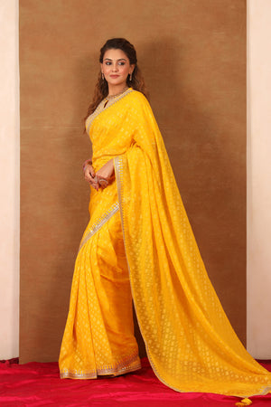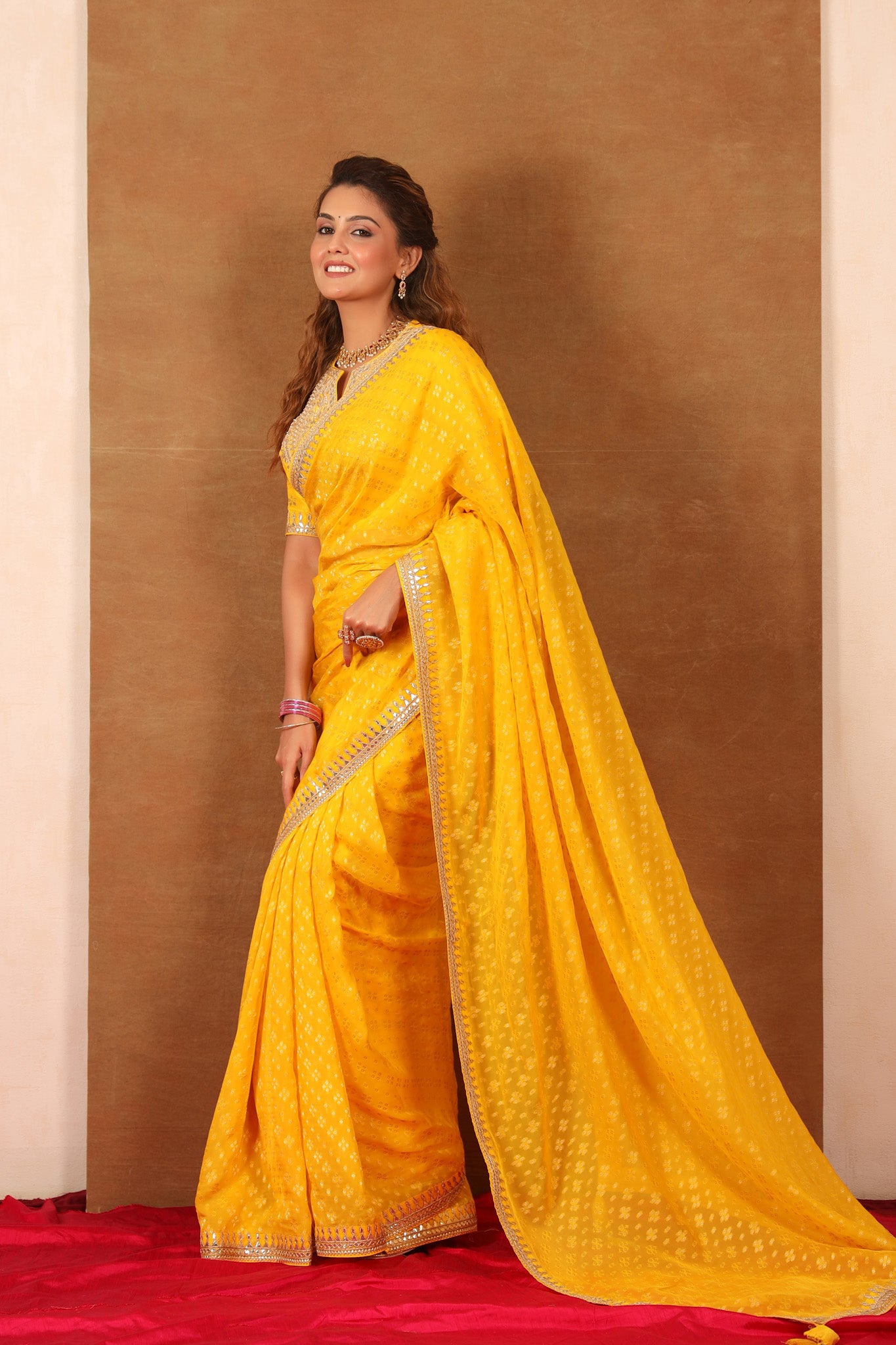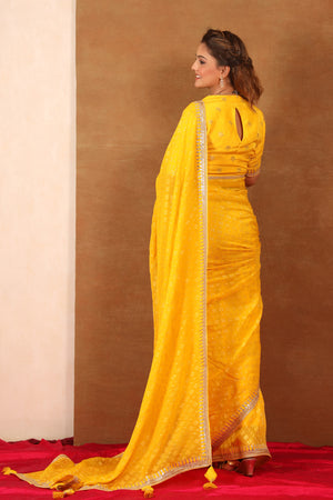 Beautiful yellow embroidered Banarasi Khaddi saree is a perfect choice for weddings and festive occasions! The saree has a beautiful embroidered border. It comes with a saree blouse.