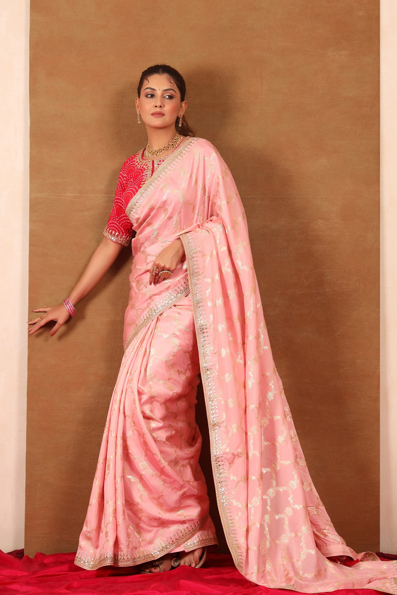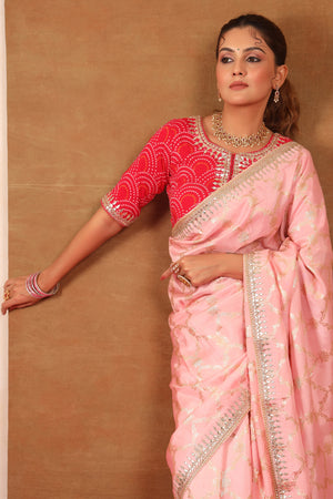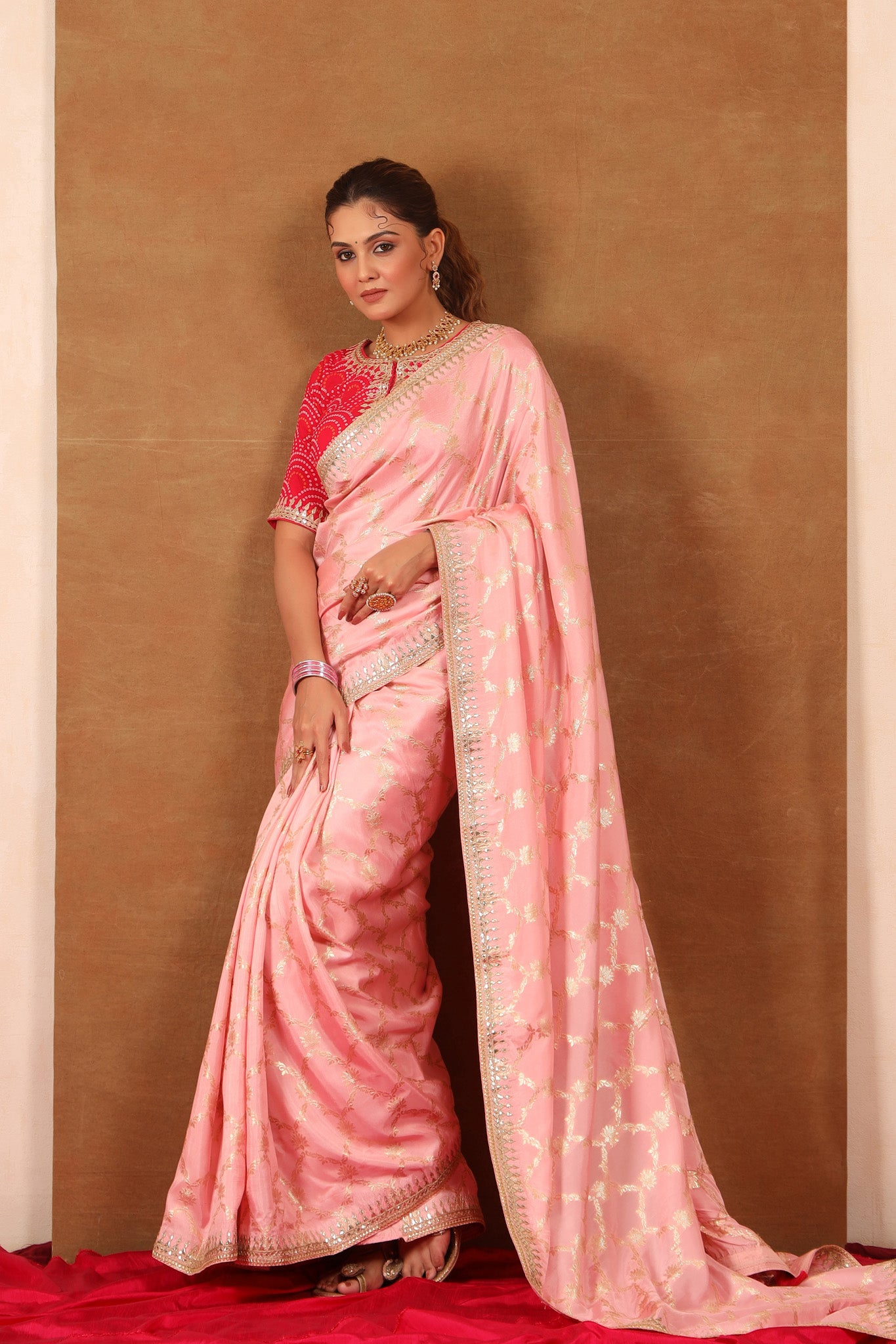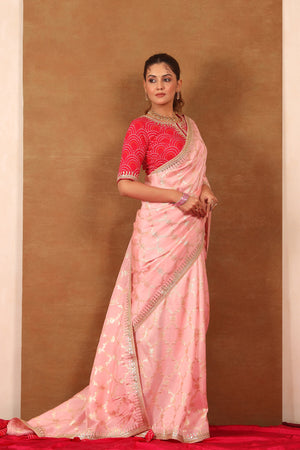 Royal looking pink embroidered Banarasi Khaddi saree is a perfect choice for weddings and festive occasions! The saree has a beautiful embroidered border. It comes with an embroidered pink saree blouse.