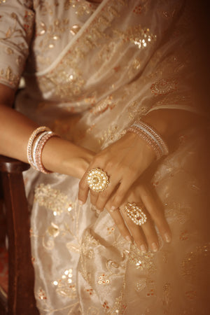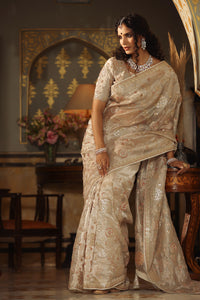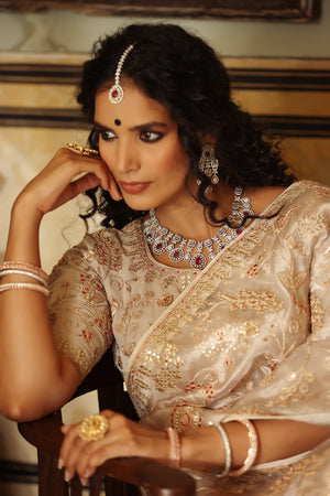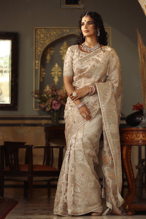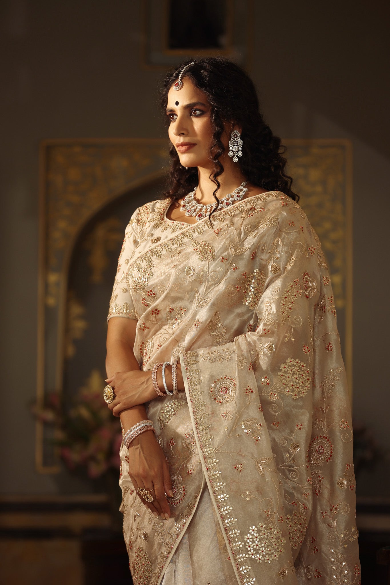 Gorgeous cream heavy embroidery organza silk sari is a perfect choice for weddings! It comes with a saree blouse.