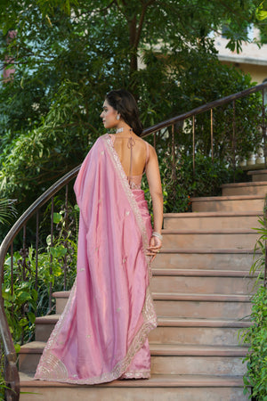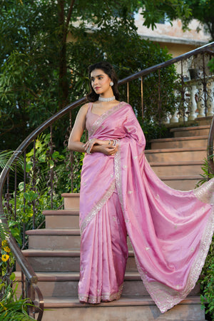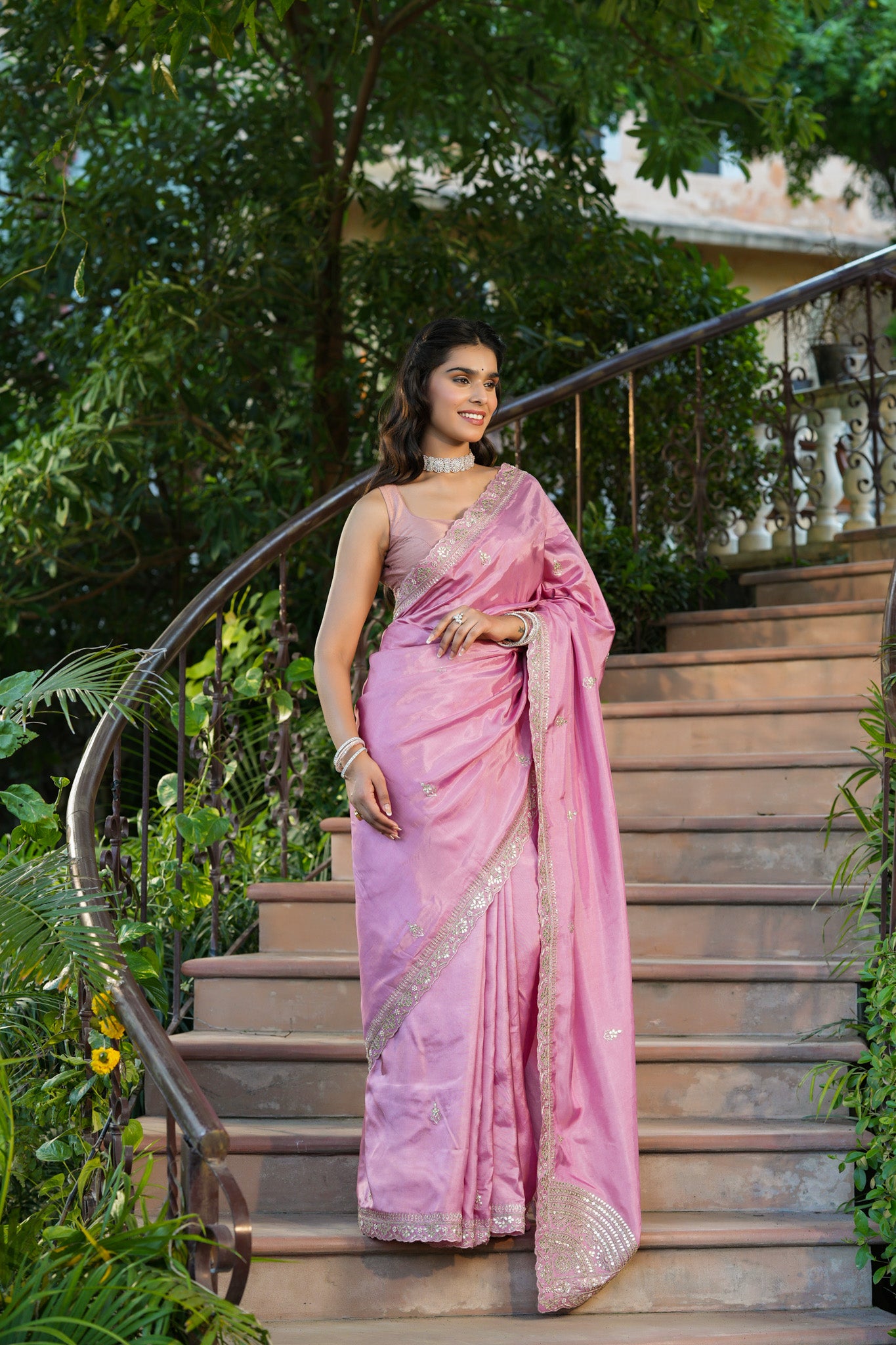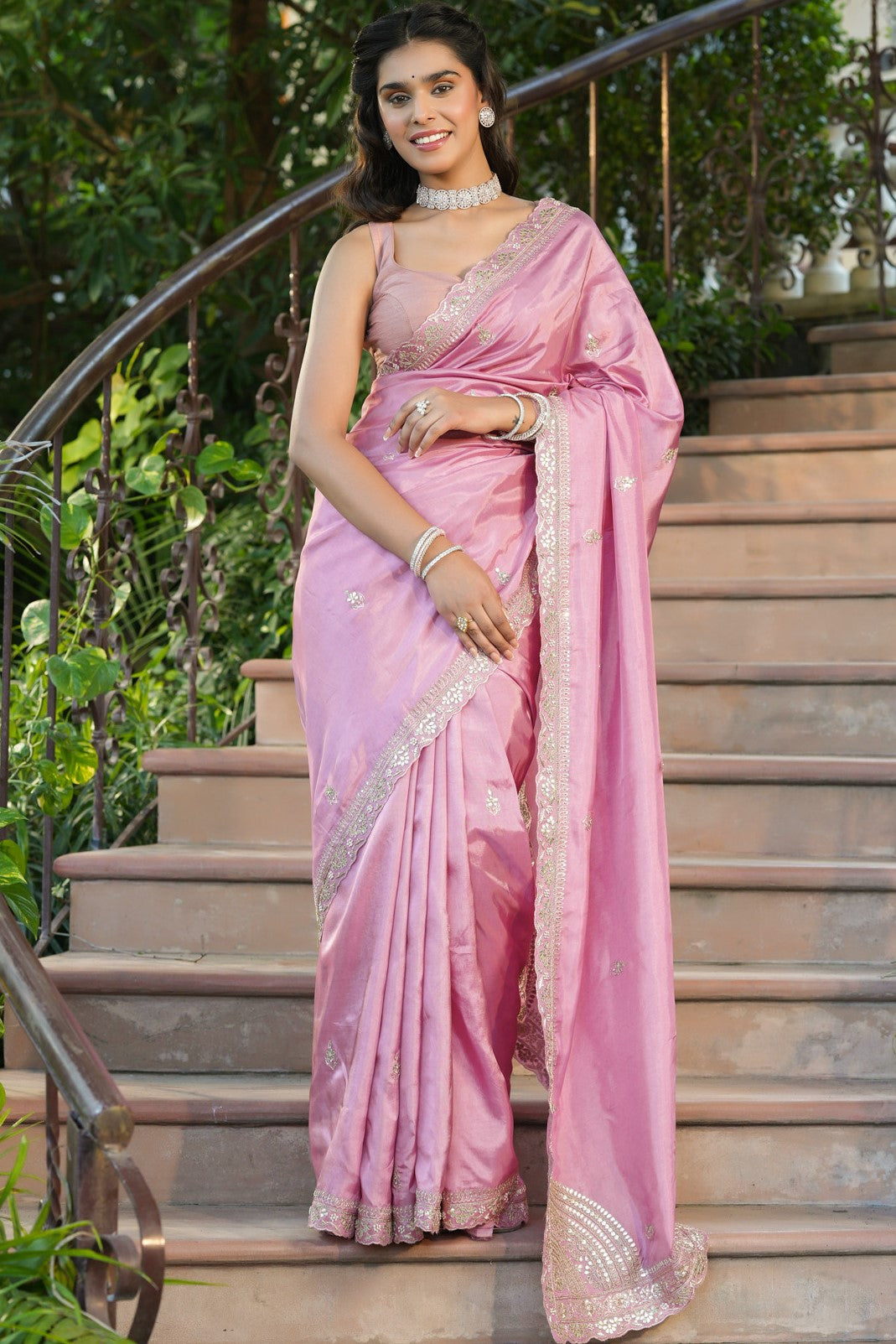 Gorgeous light pink tussar georgette saree is a perfect choice for weddings and festive occasions!. It has an embroidered border and comes with a blouse piece.