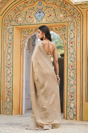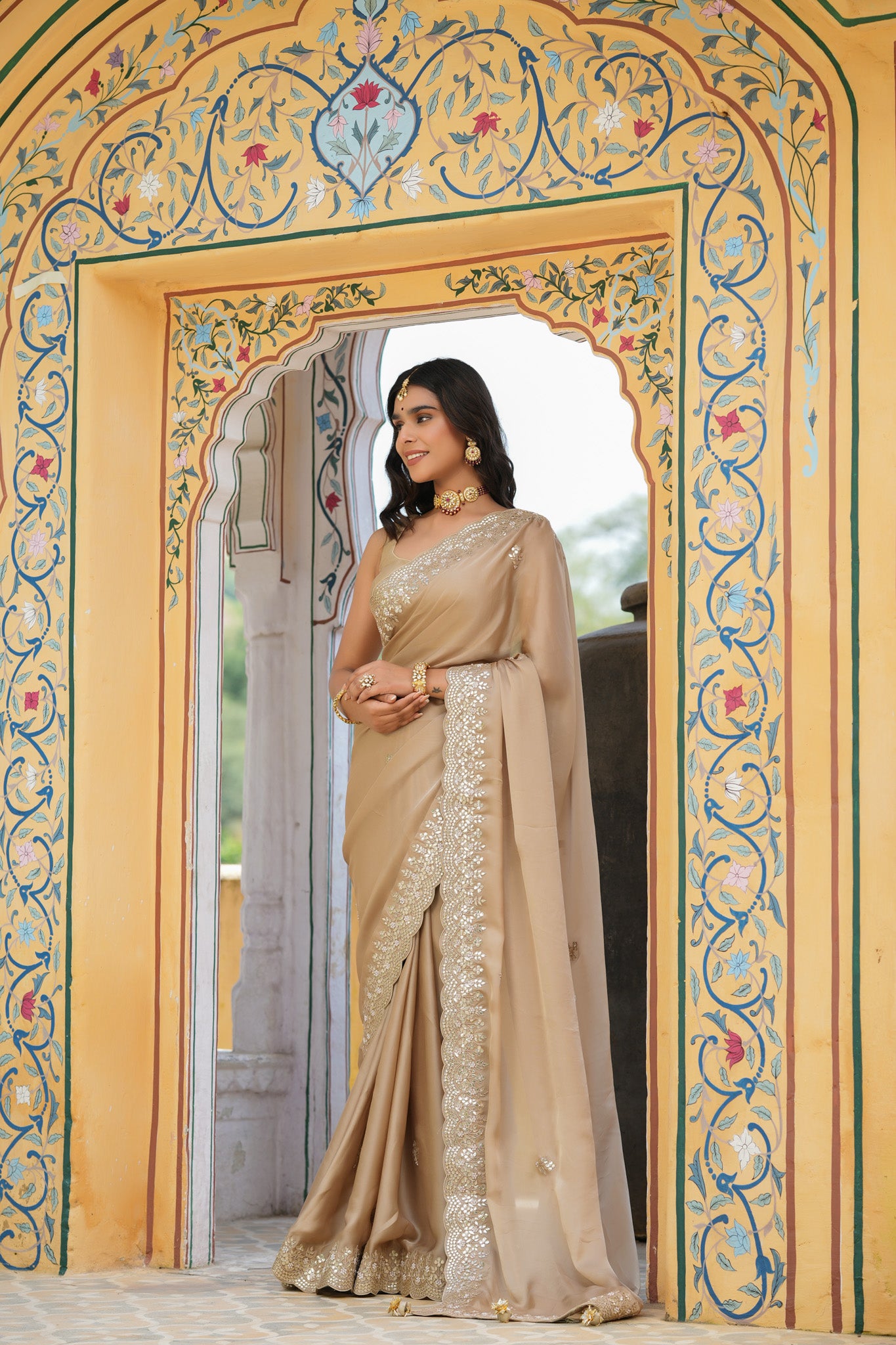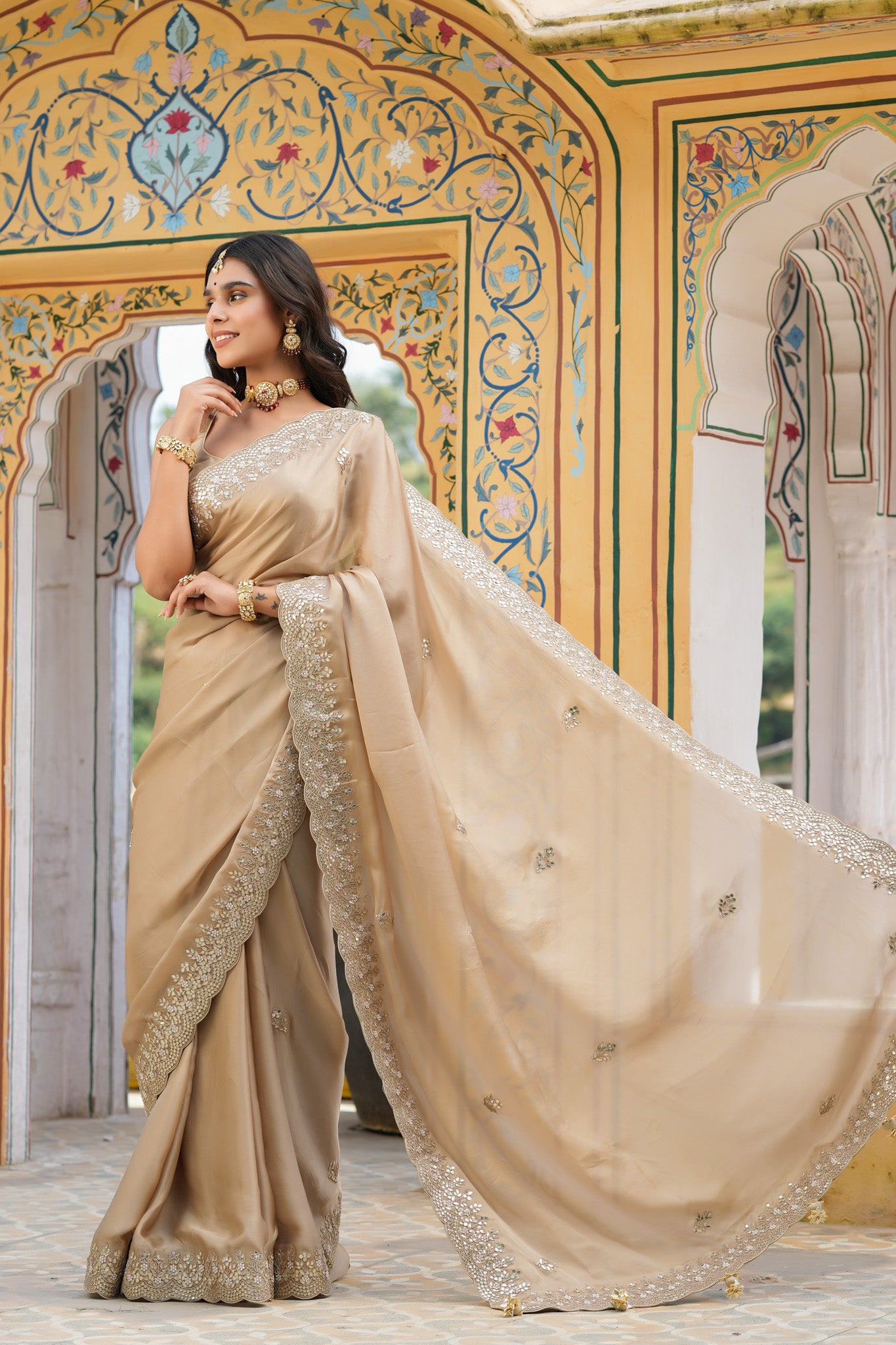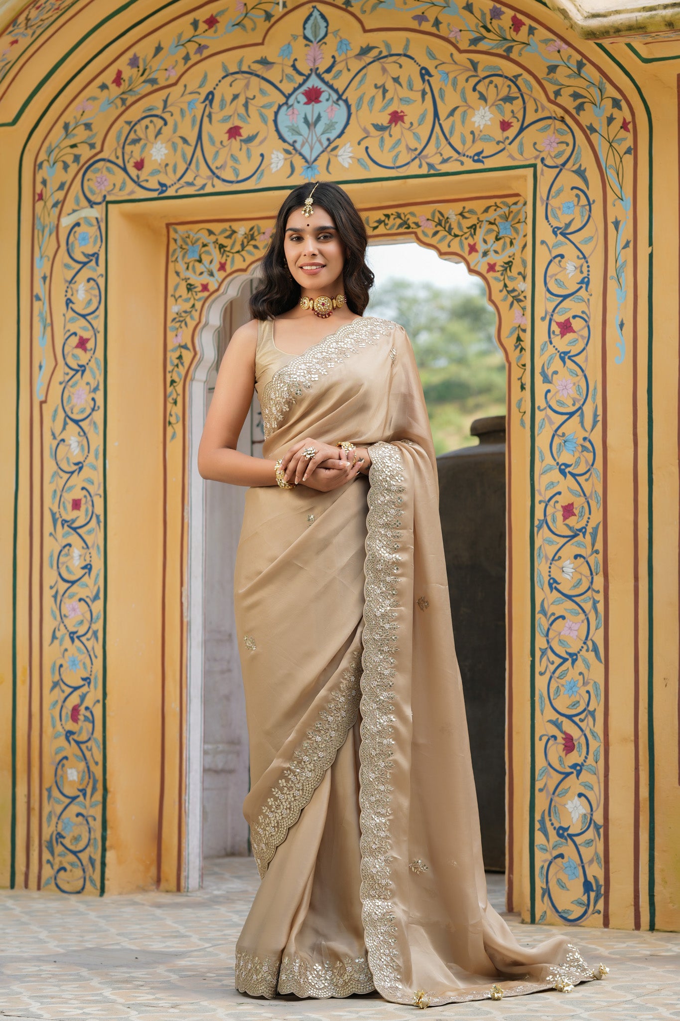 Gorgeous beige tussar georgette sari is a perfect choice for weddings and festive occasions! The saree has a beautiful embroidered scalloped border. It comes with a saree blouse piece.