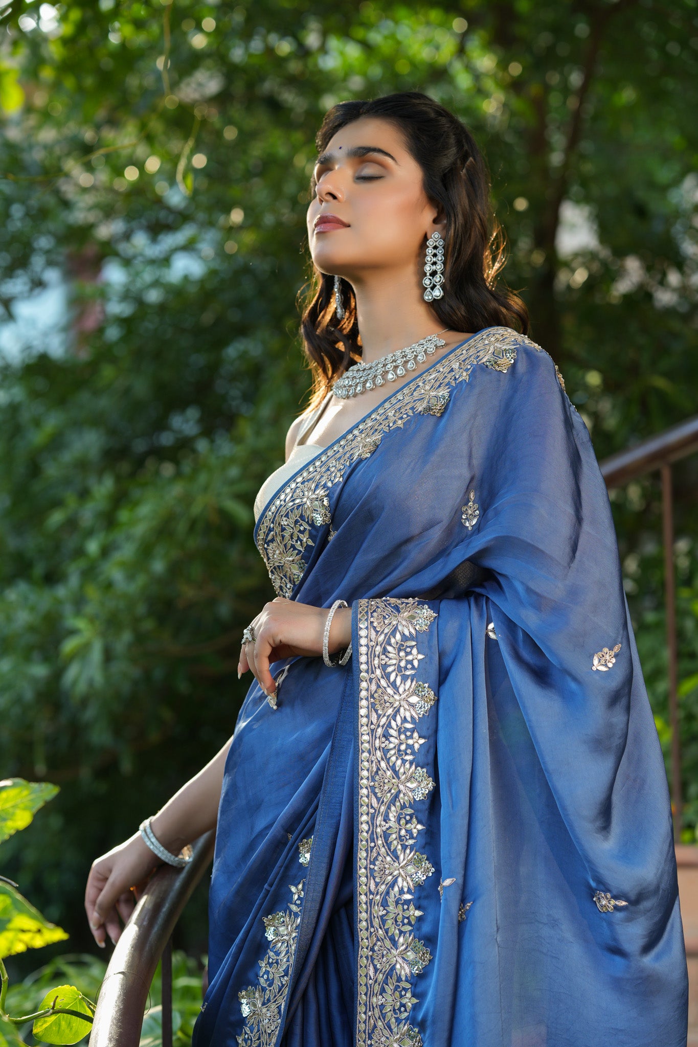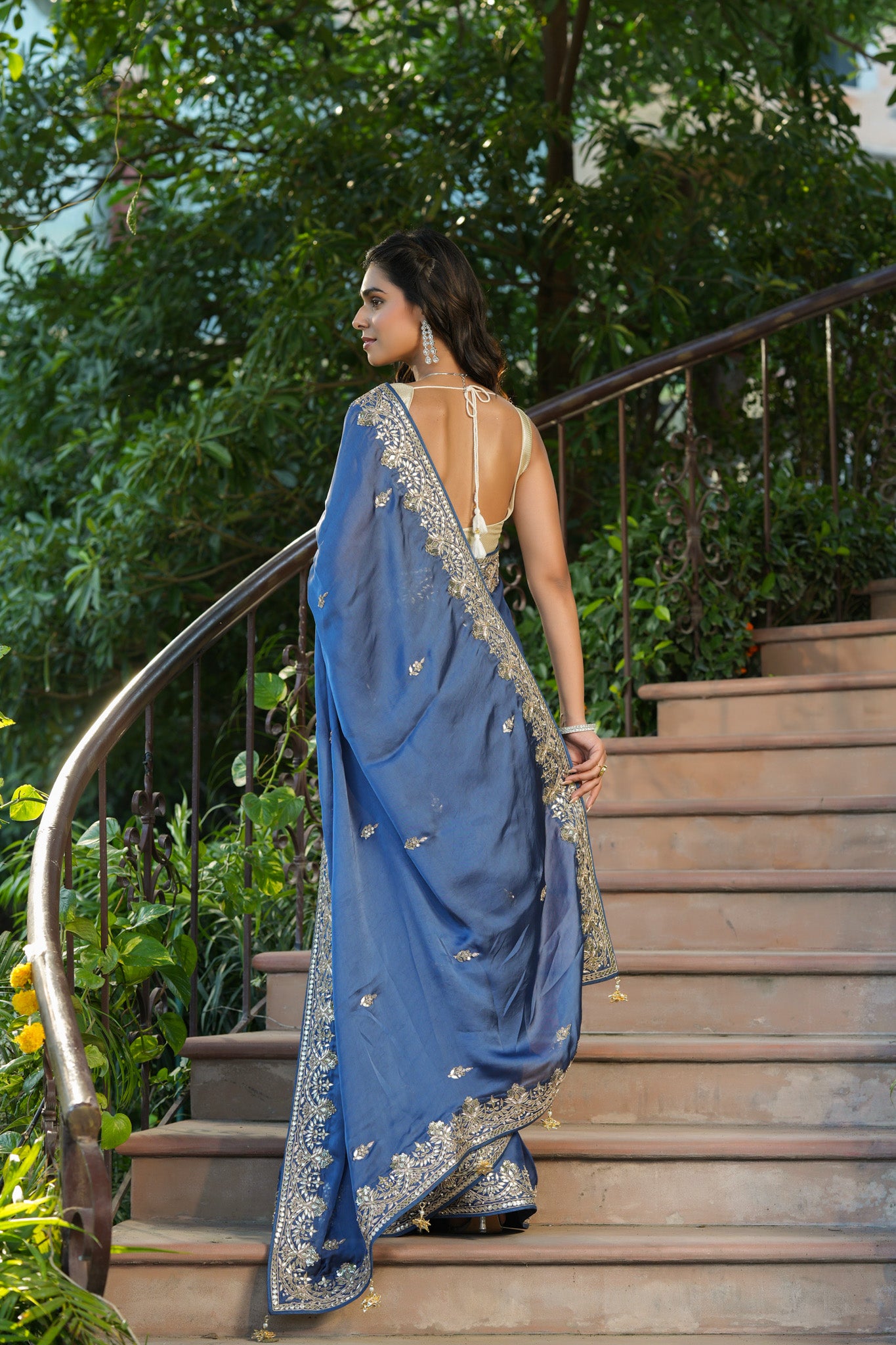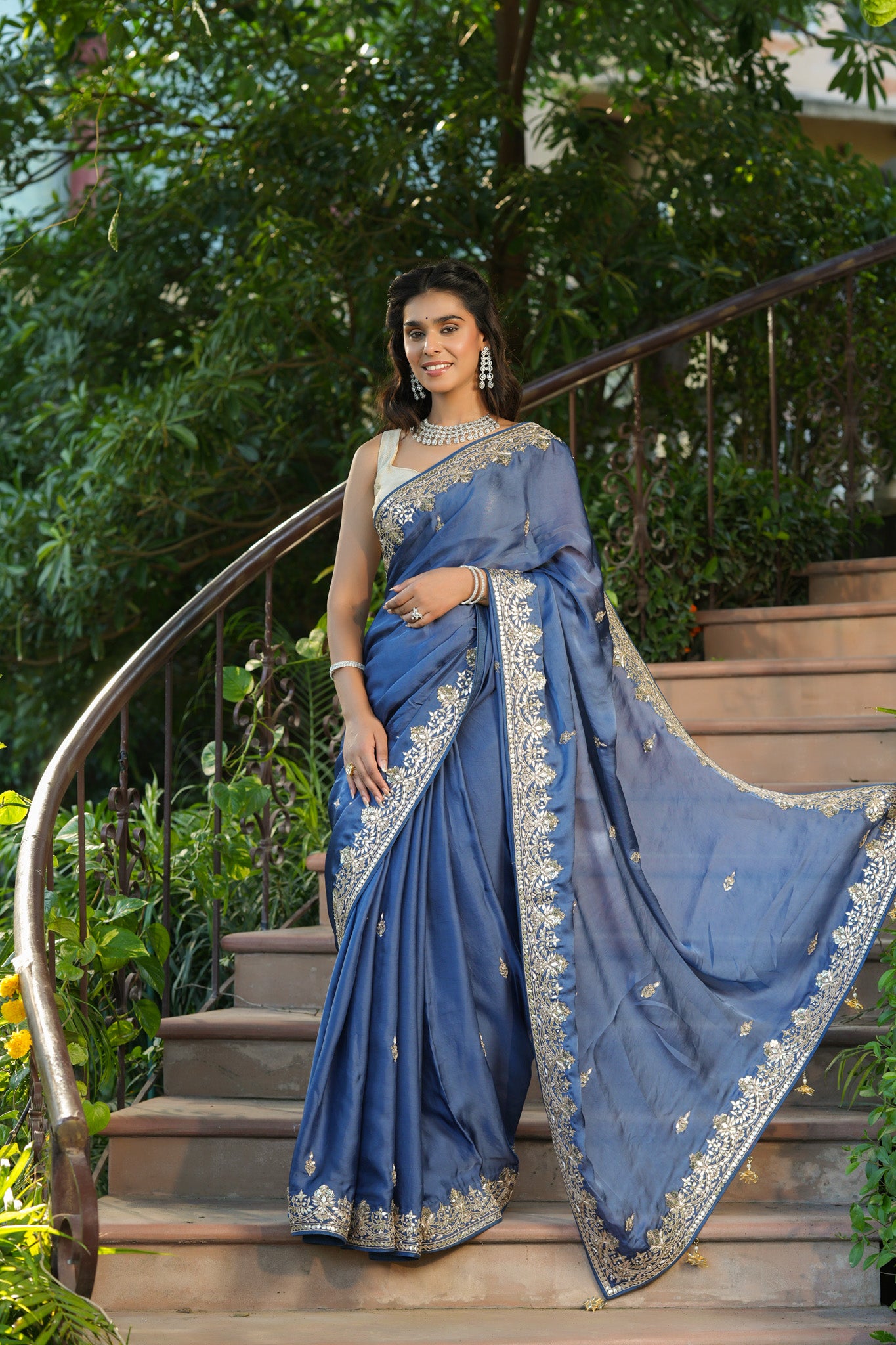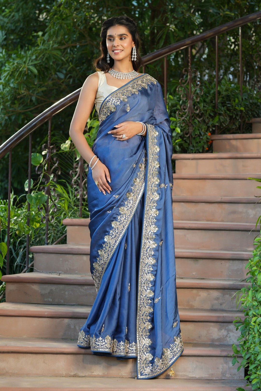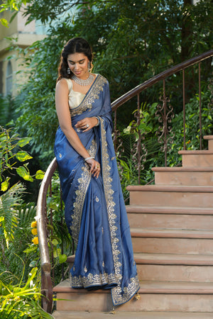 Gorgeous blue tussar georgette saree is a perfect choice for weddings and festive occasions! The saree has a beautiful embroidered border. It comes with a saree blouse piece.