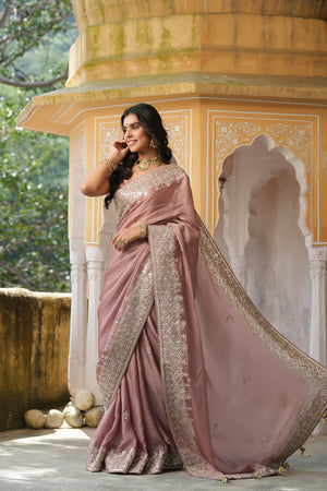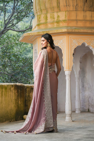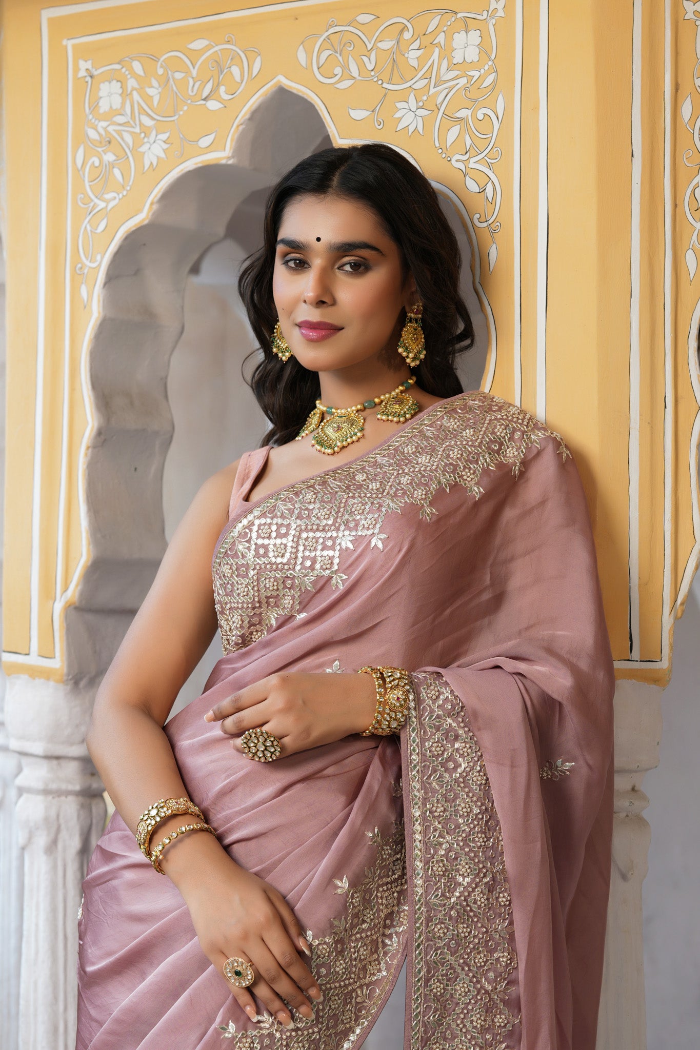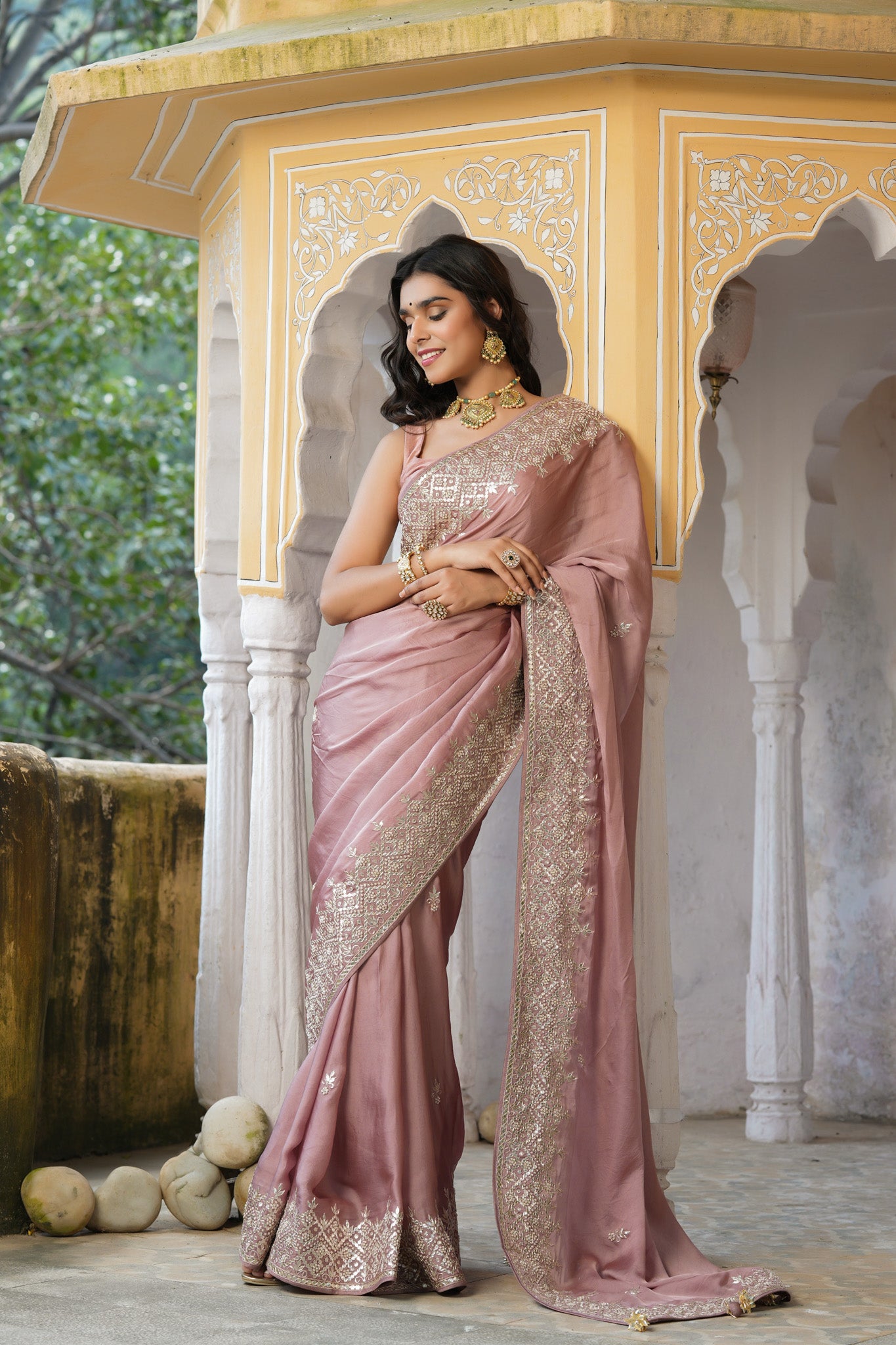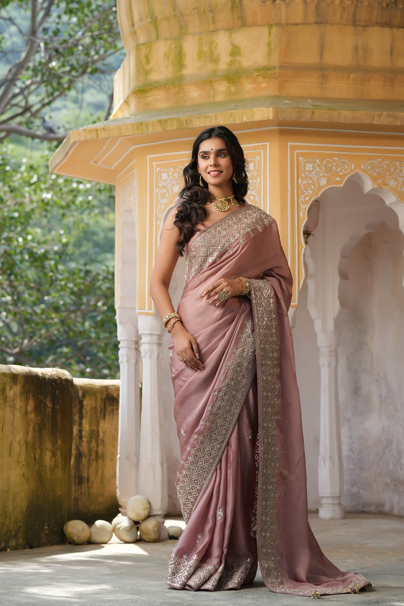 Gorgeous dusty pink embroidered tussar georgette saree is a perfect choice for weddings and festive occasions!. It comes with a saree blouse piece.