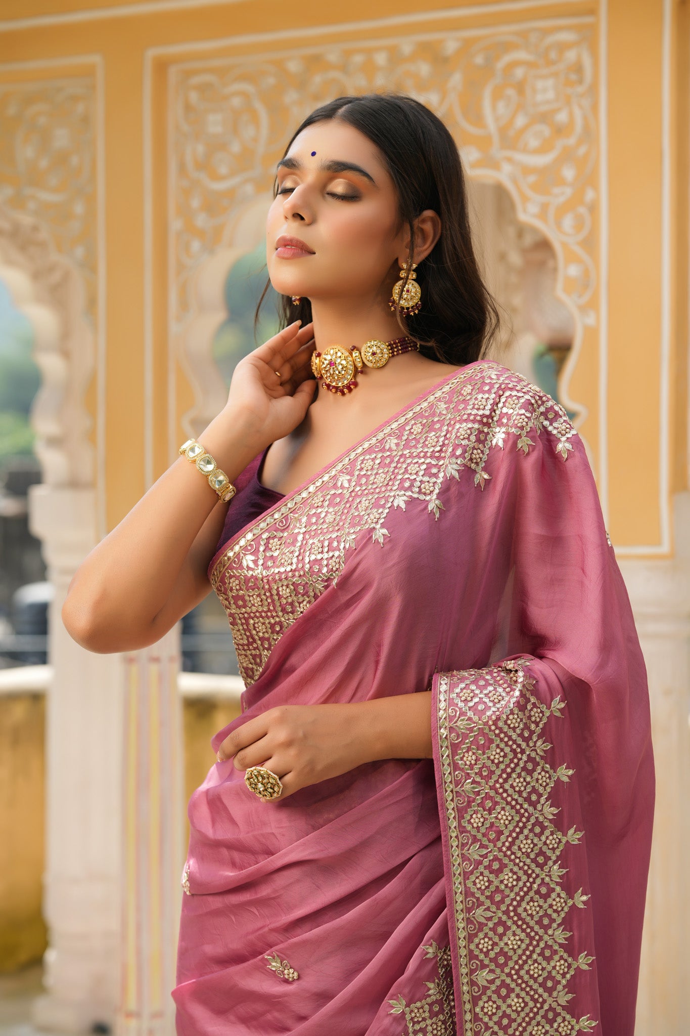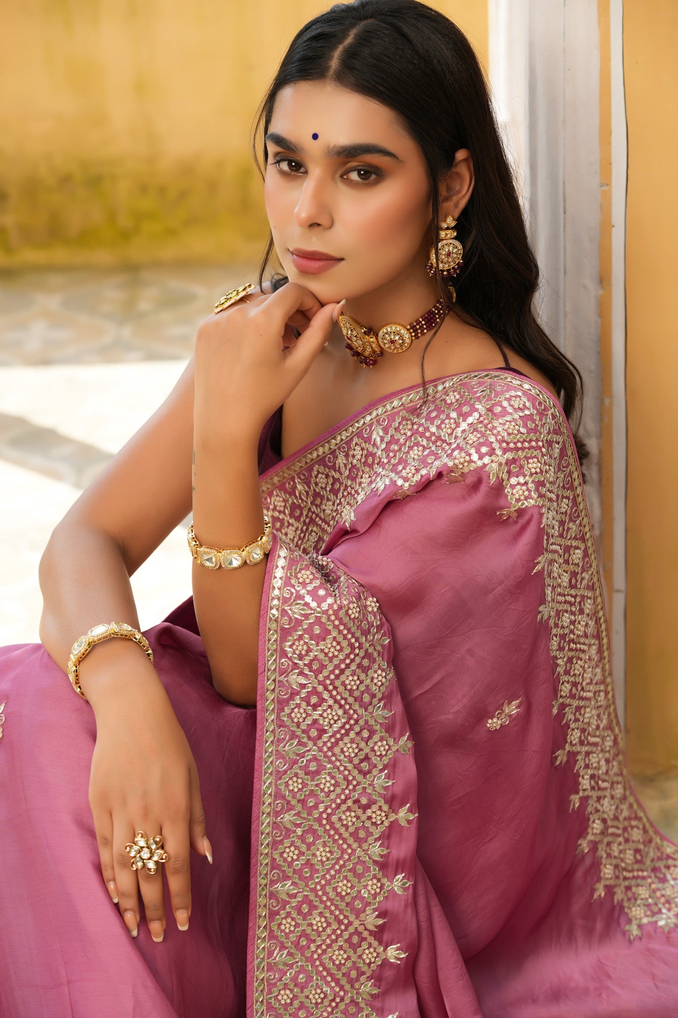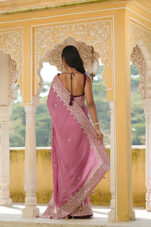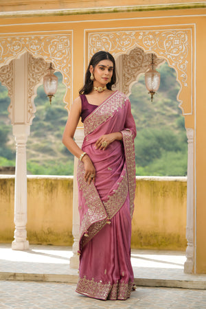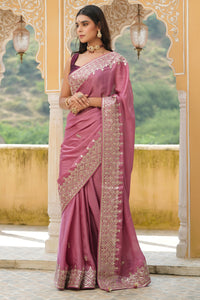 Gorgeous onion pink embroidered tussar georgette sari is a perfect choice for weddings and festive occasions! It has beautiful hand embroidered border. It comes with a saree blouse piece.