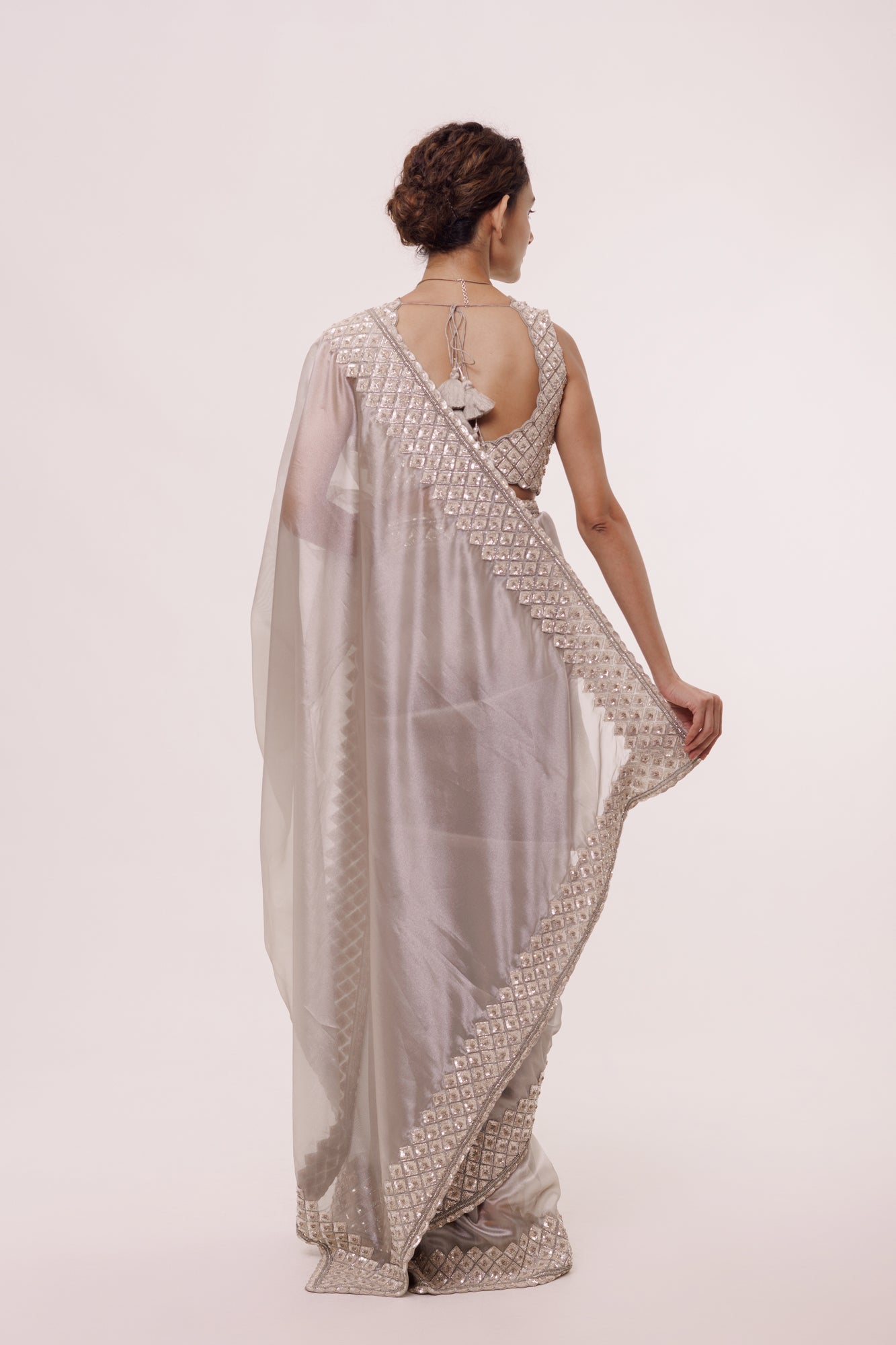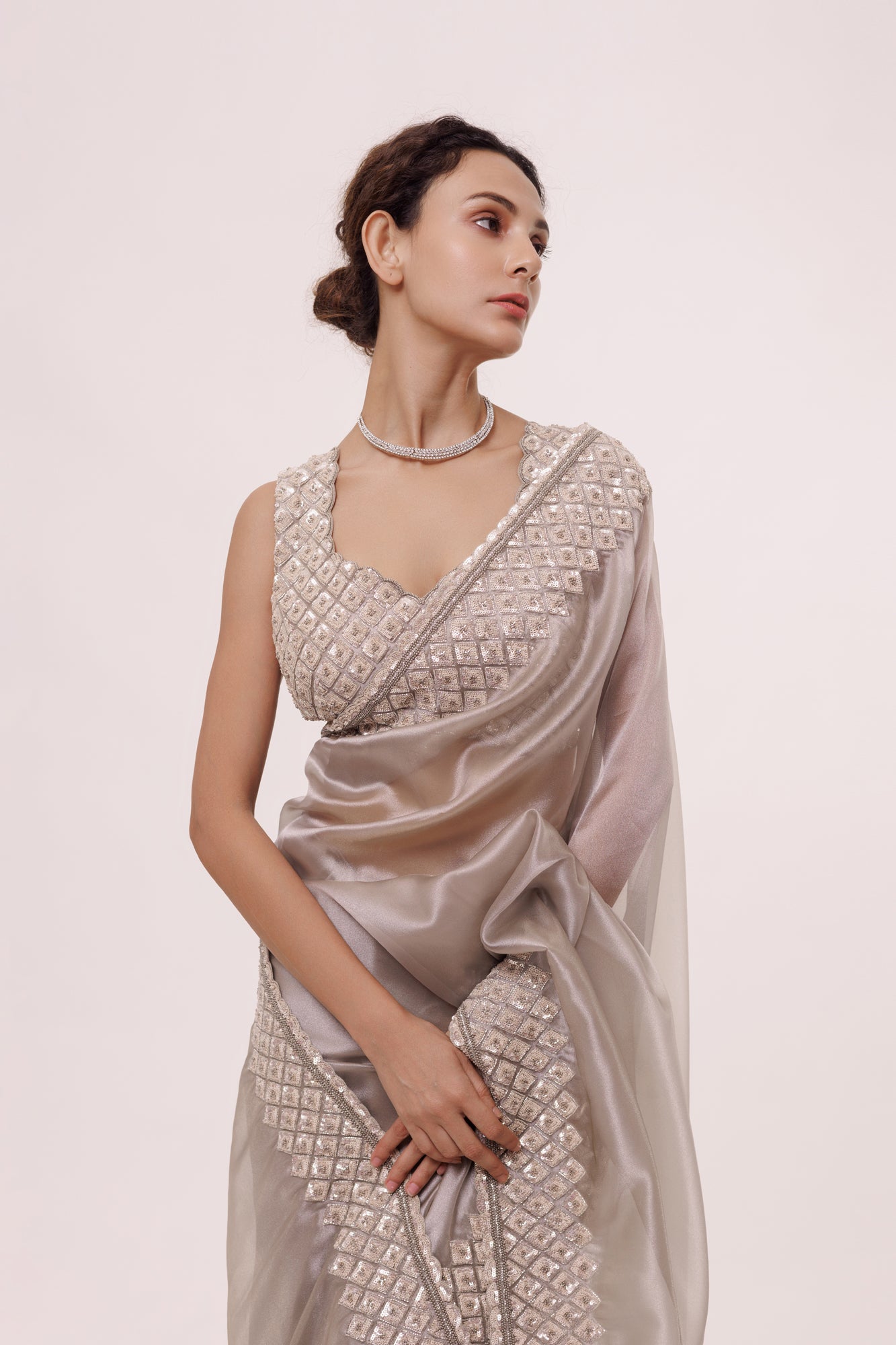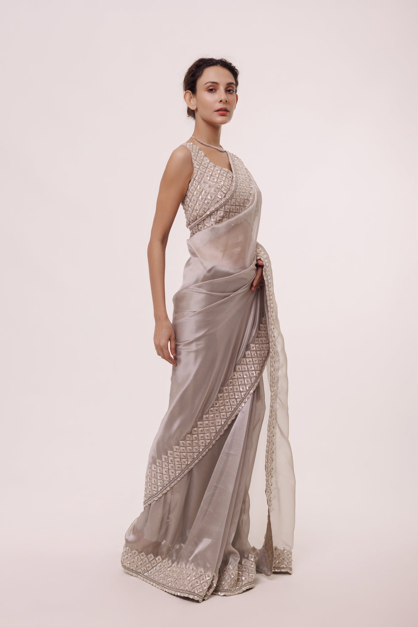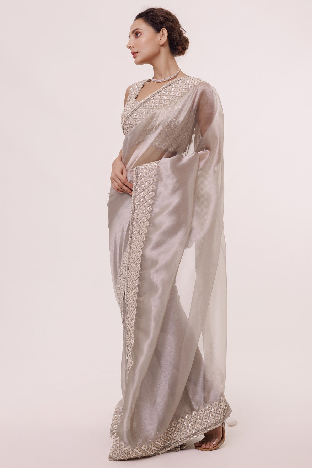 Alluring metallic silver organza saree is sure to grab eye balls at parties and special occasions! The saree is crafted with tikki and cutdana work. It comes with a matching saree blouse. Shop designer saris online in the USA from Pure Elegance.