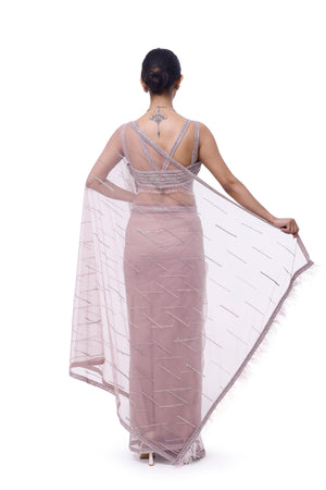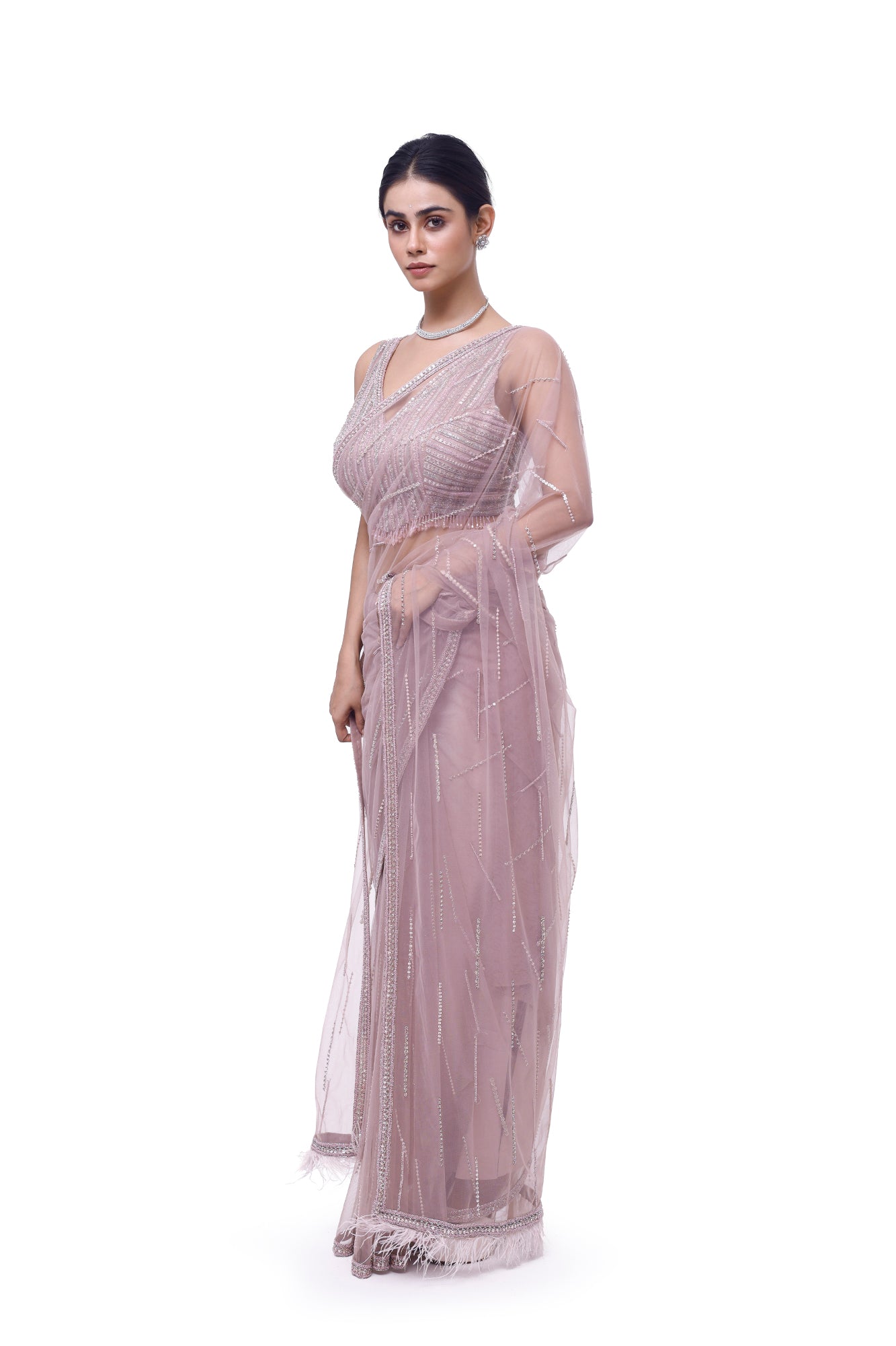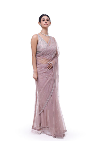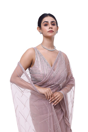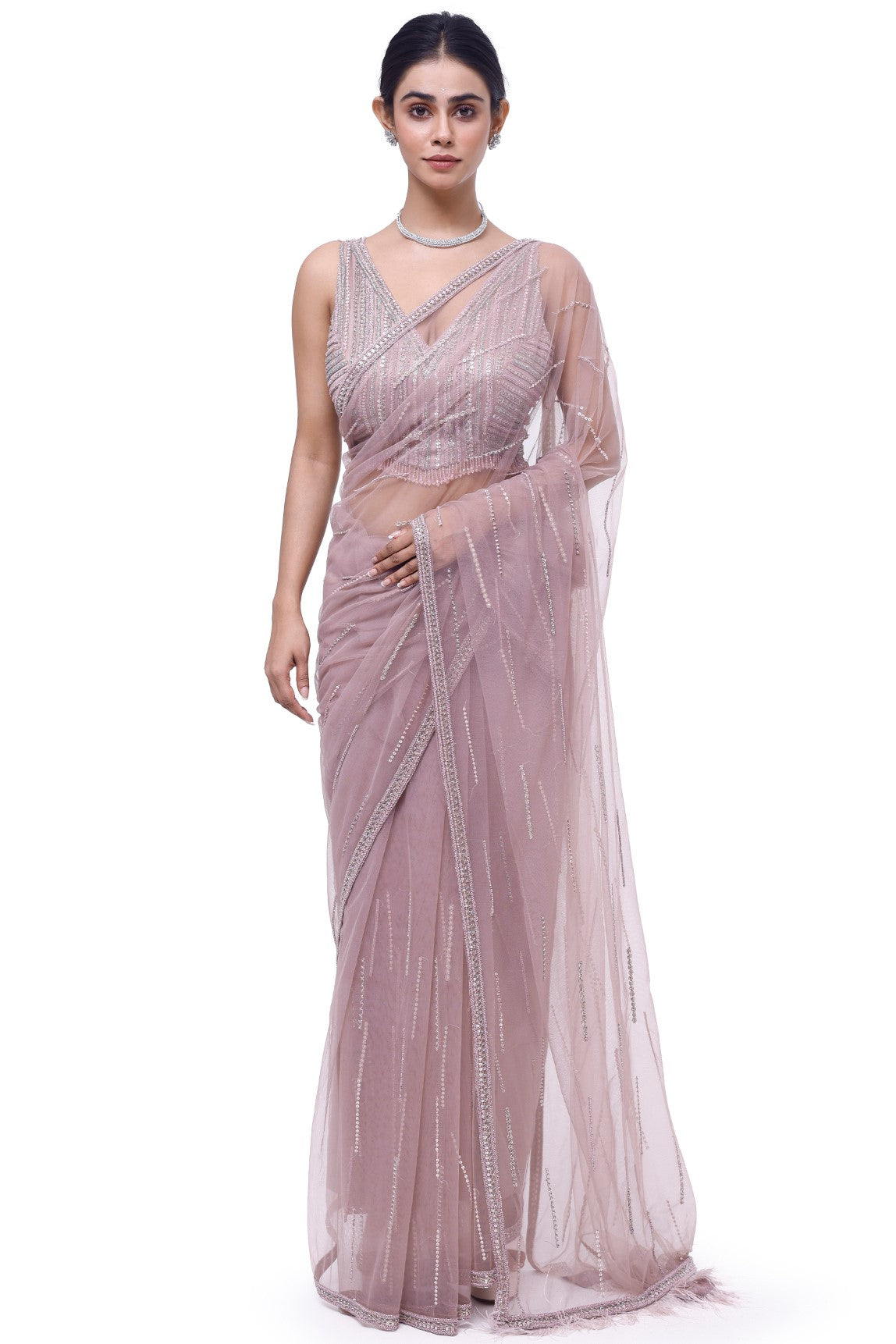 Alluring dusty pink embroidered net saree is sure to grab eye balls at parties and special occasions! It comes with an embroidered saree blouse. Shop designer saris online in the USA from Pure Elegance.