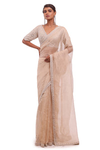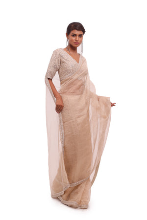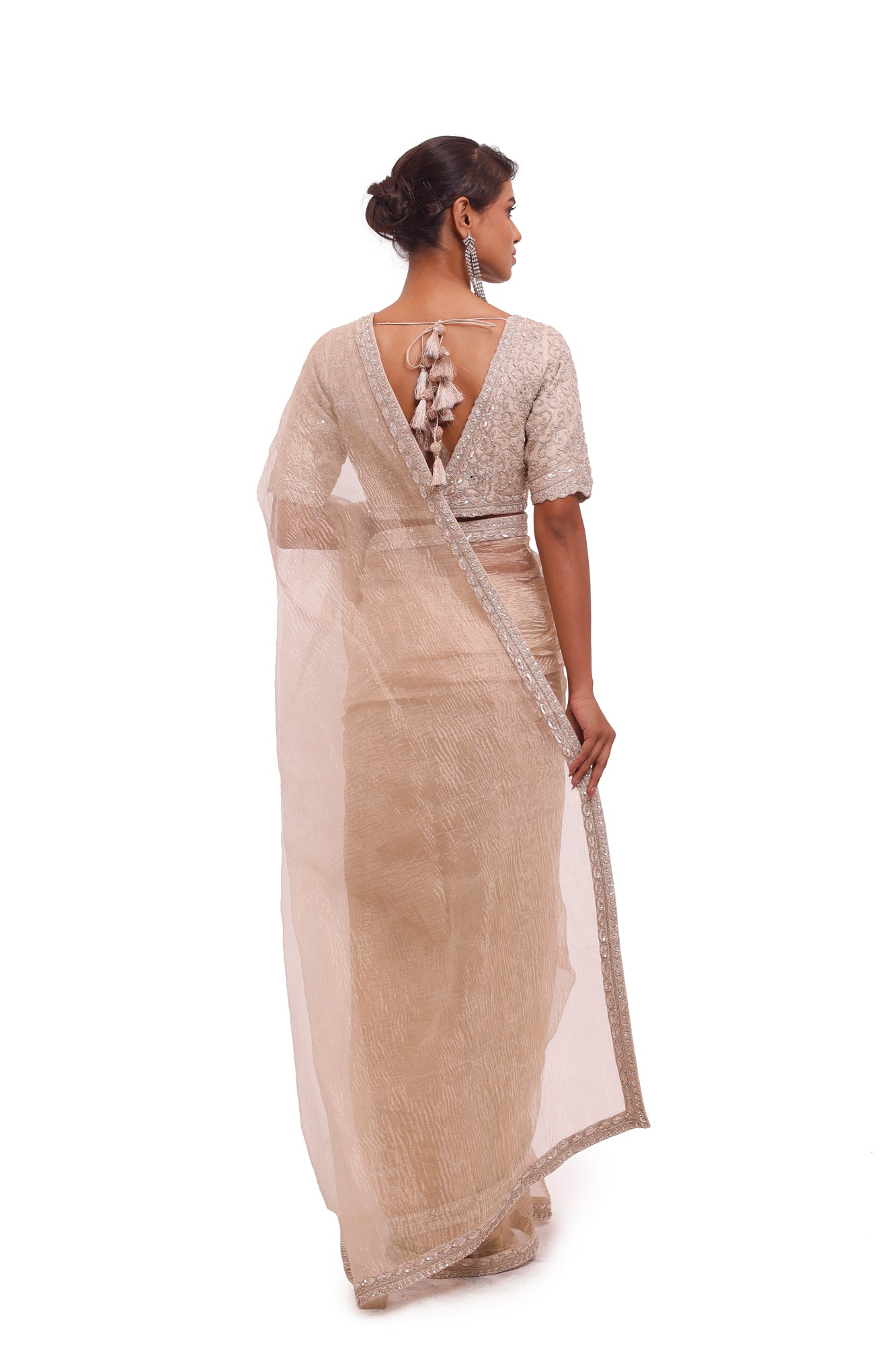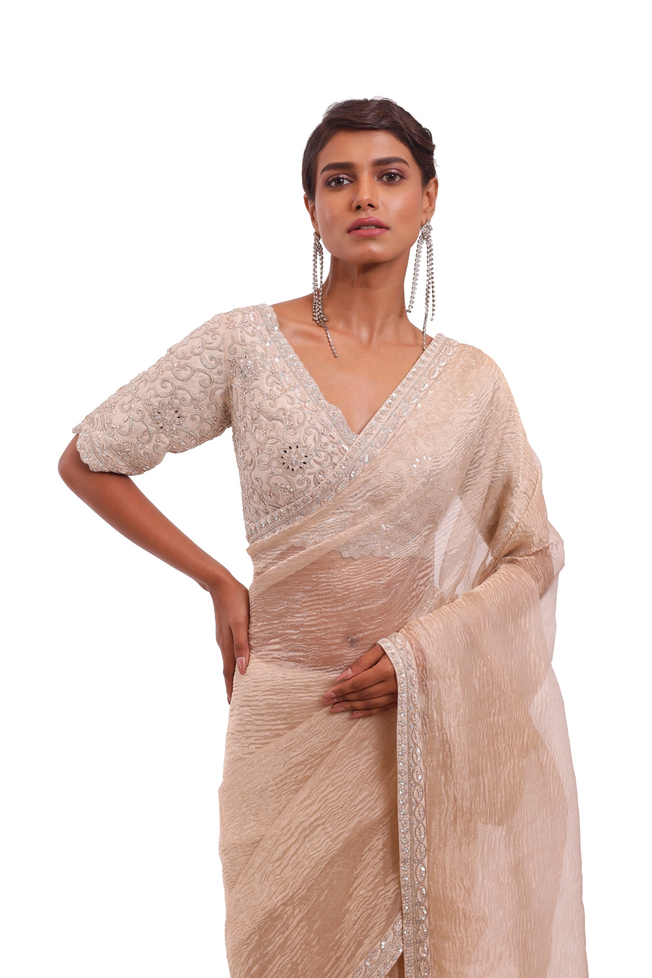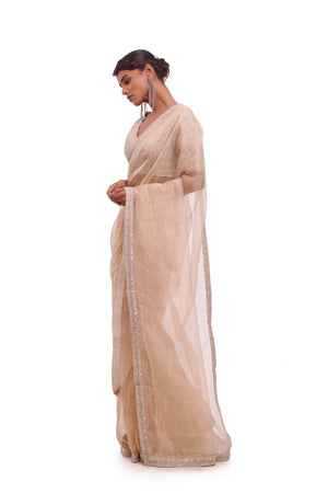 Alluring golden crinkled tissue saree is sure to grab eye balls at parties and special occasions! It comes with an embroidered raw silk saree blouse. Shop designer saris online in the USA from Pure Elegance.