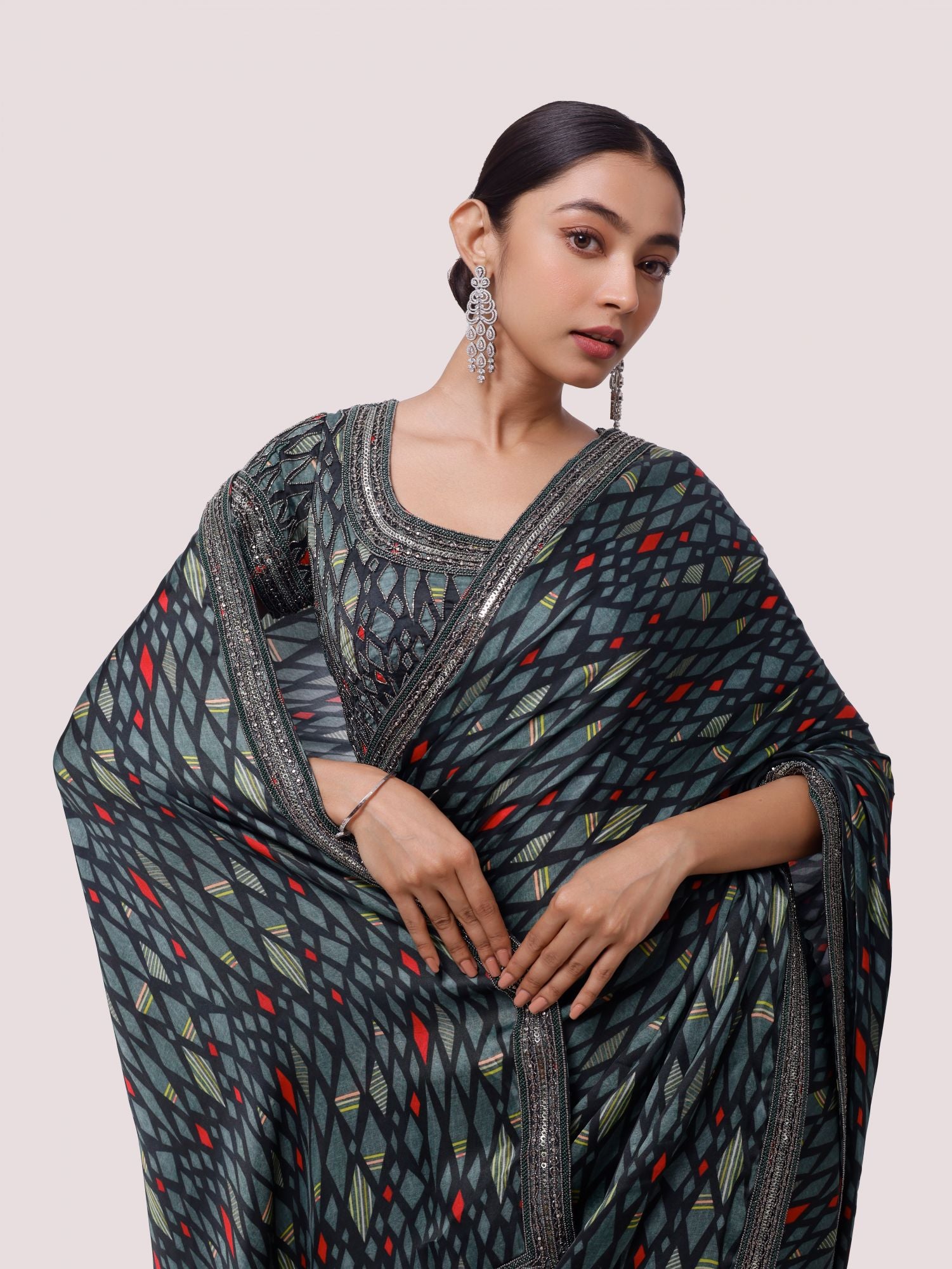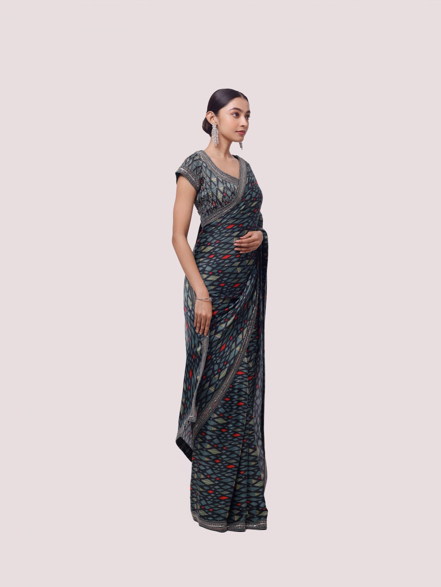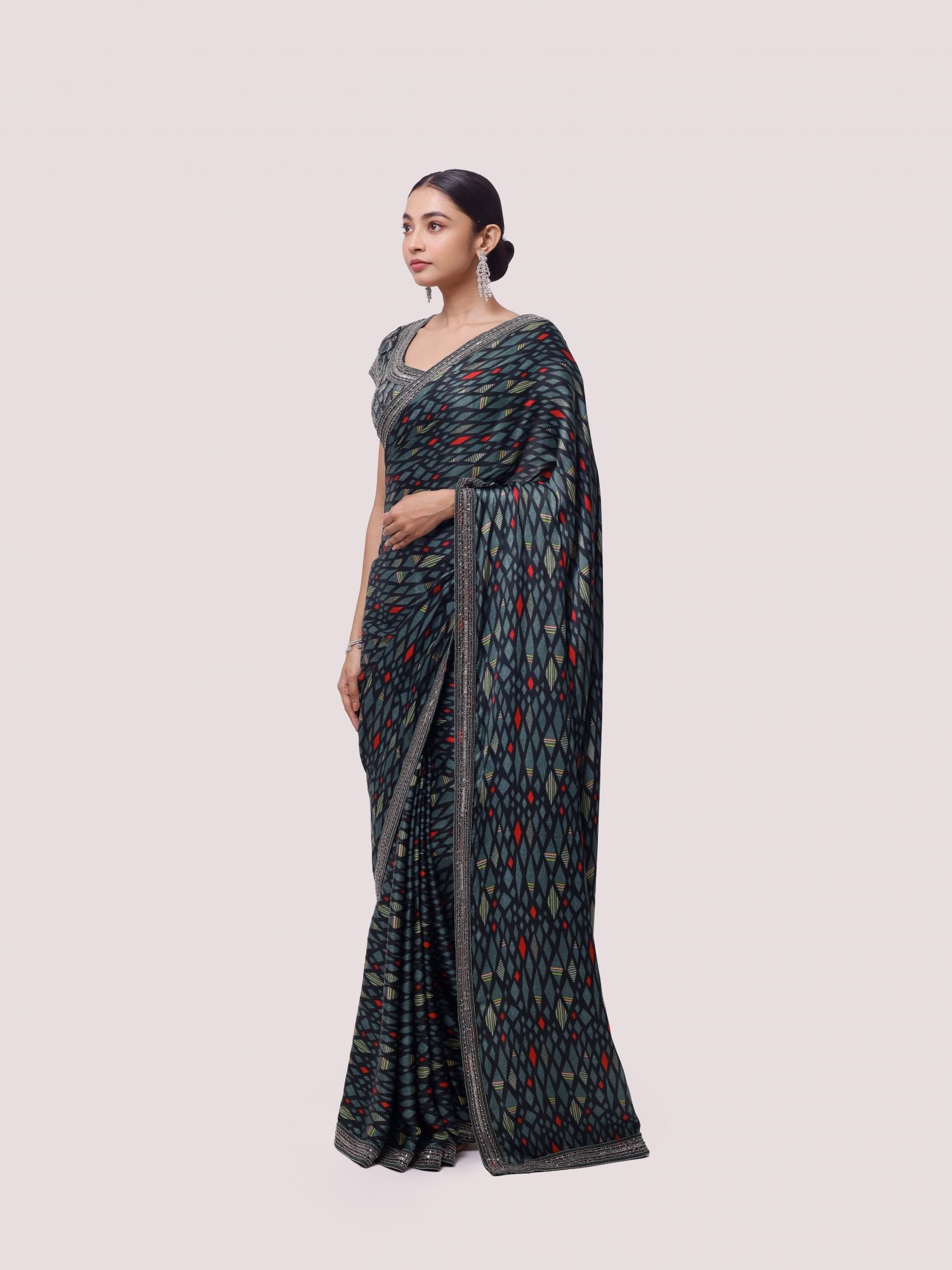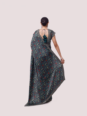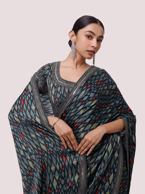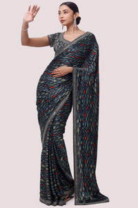 Alluring green printed and embroidered satin saree is sure to grab eye balls at parties and special occasions! It comes with a saree blouse. Shop designer saris online in the USA from Pure Elegance.