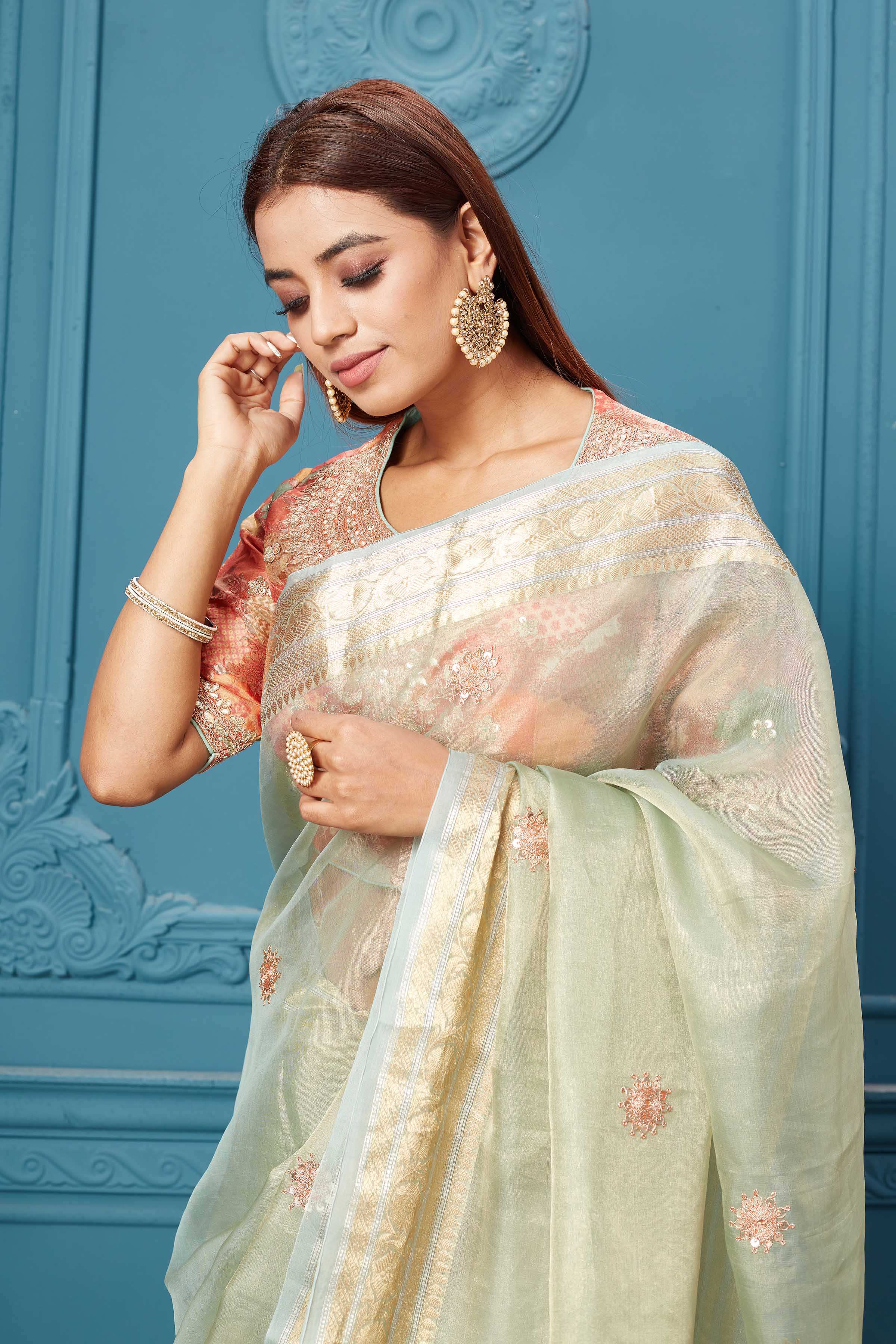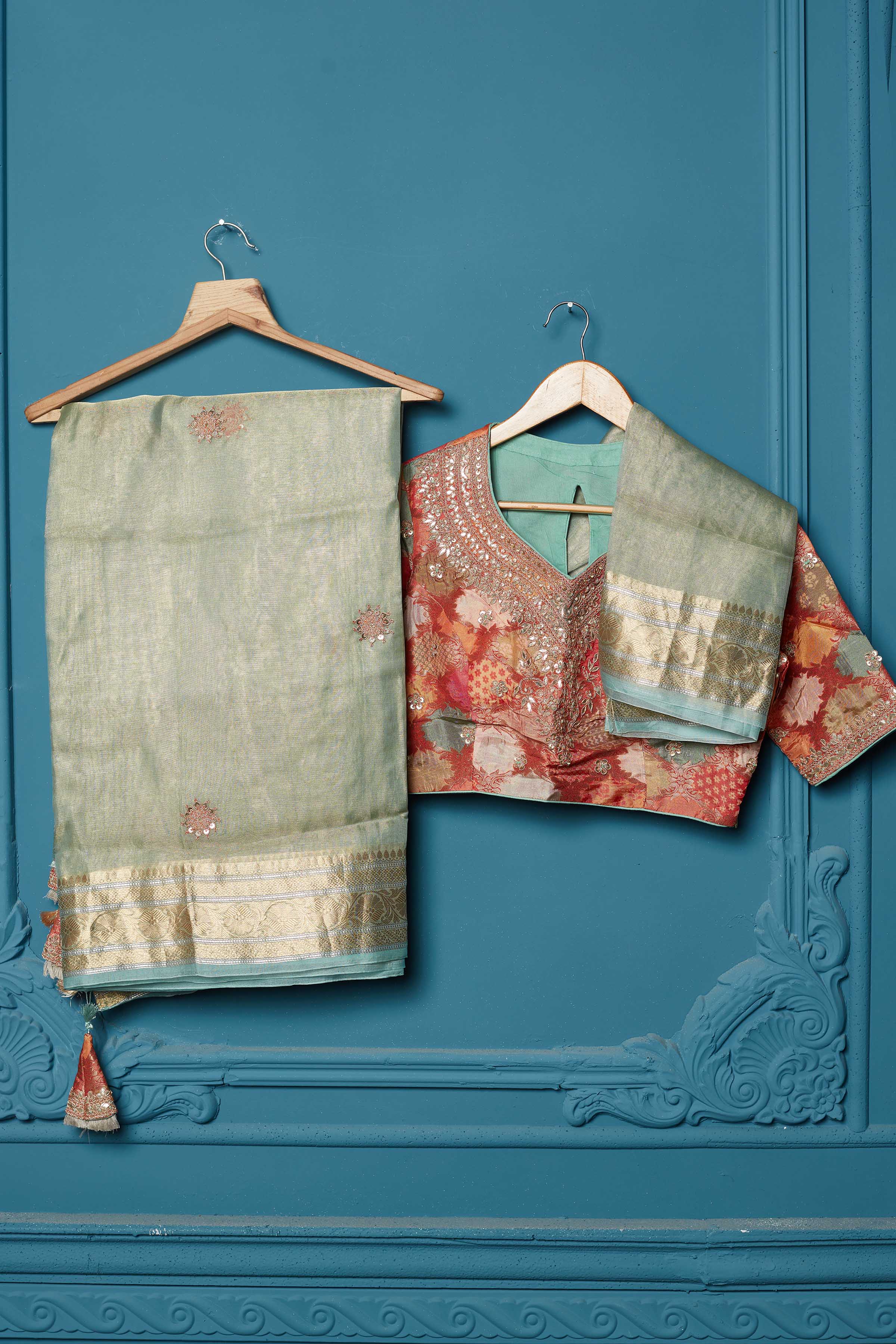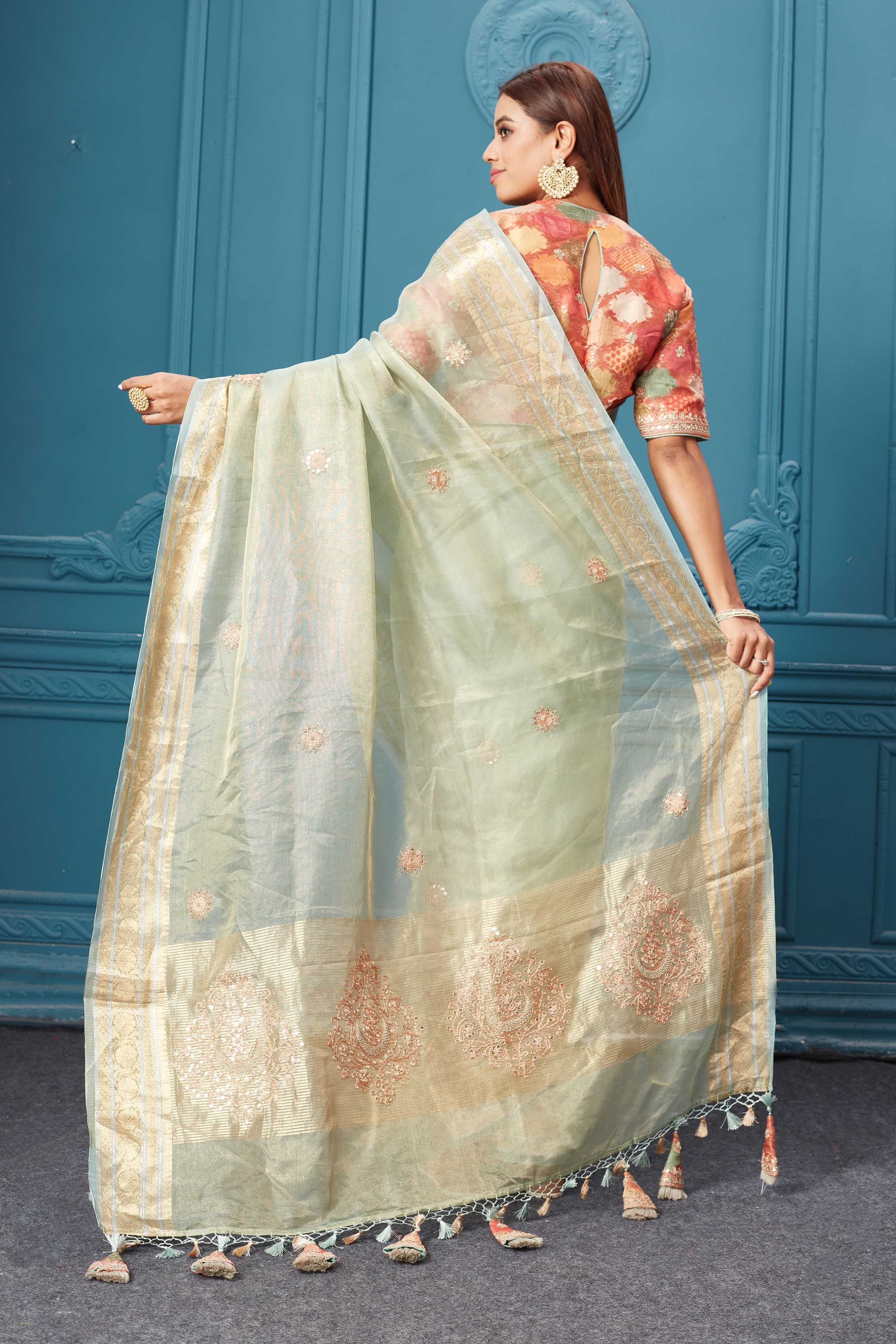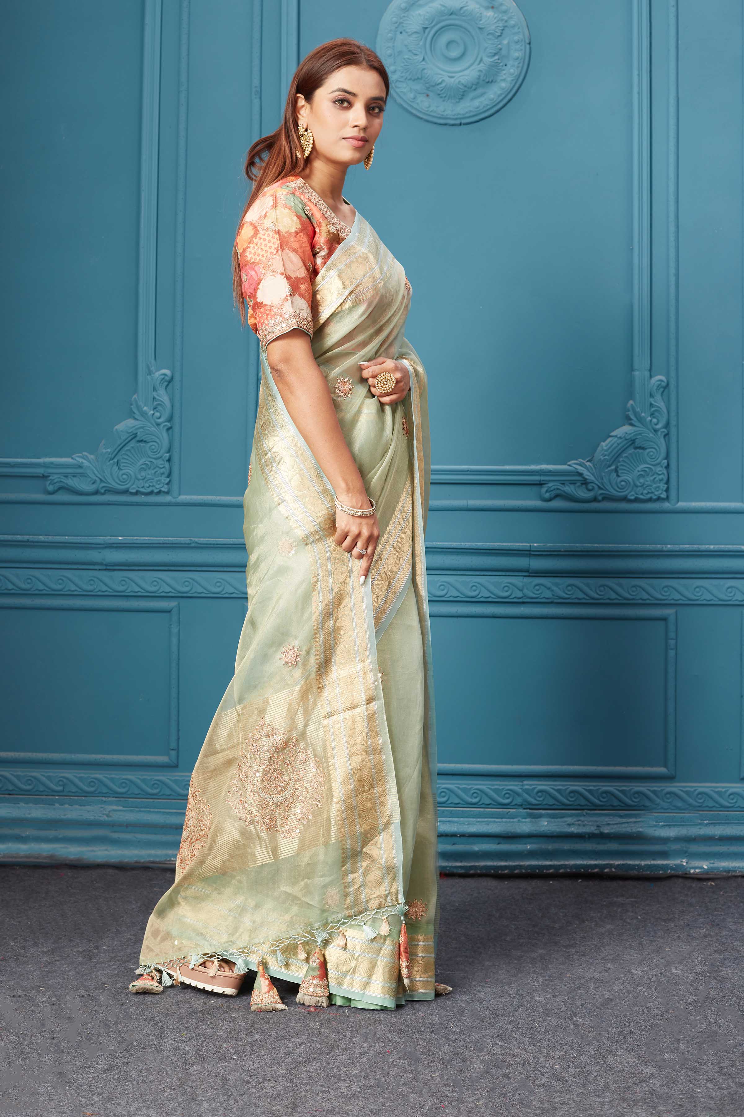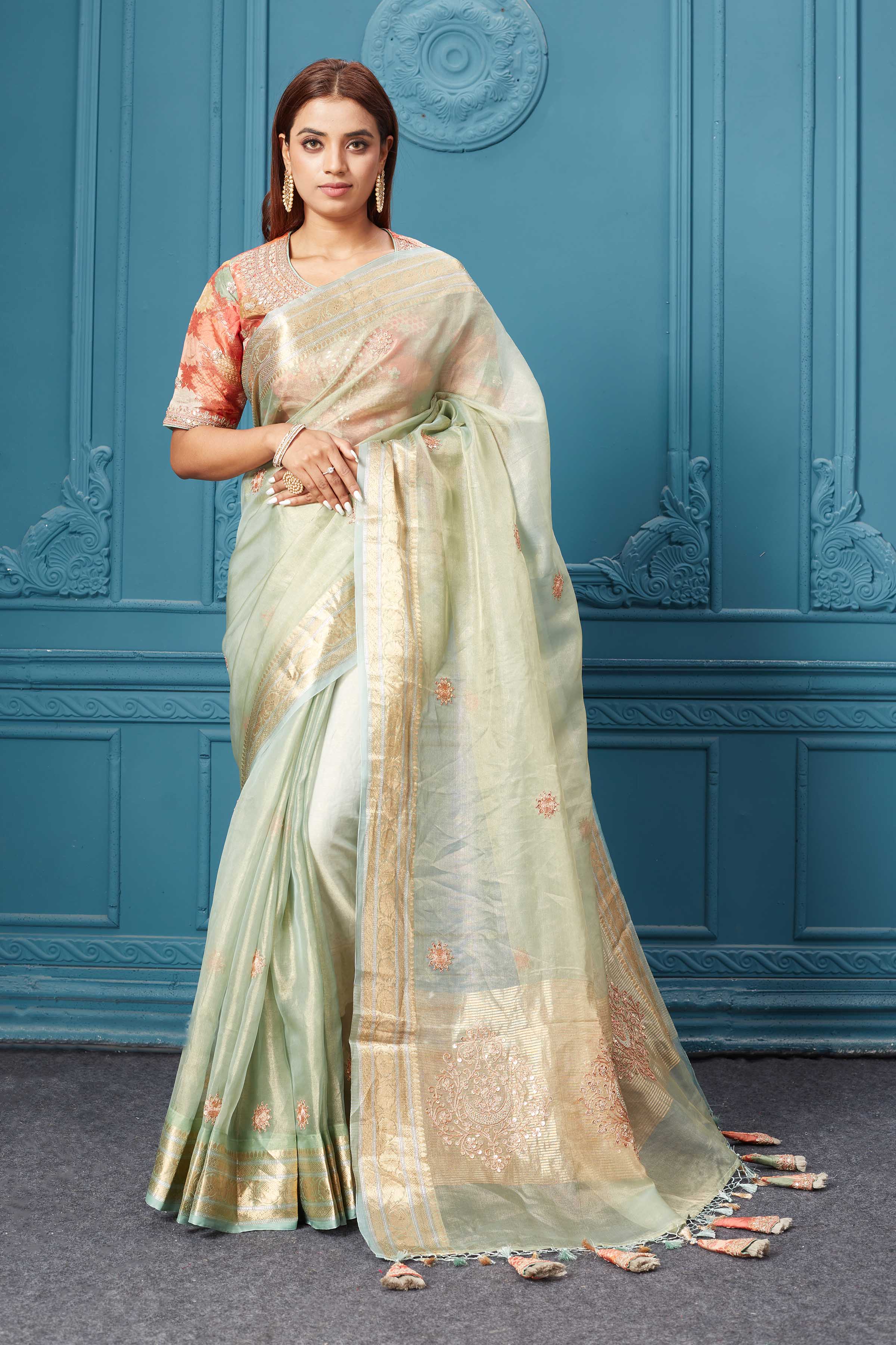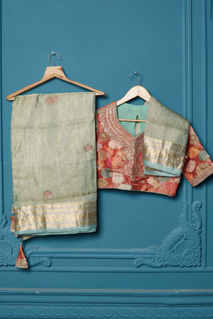 Look royal on festive occasions in this stunning pista green tissue Kora silk saree. It comes with a red embroidered Banarasi blouse.
