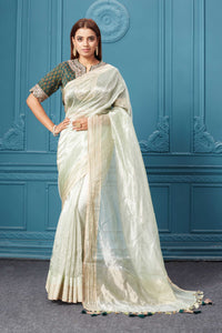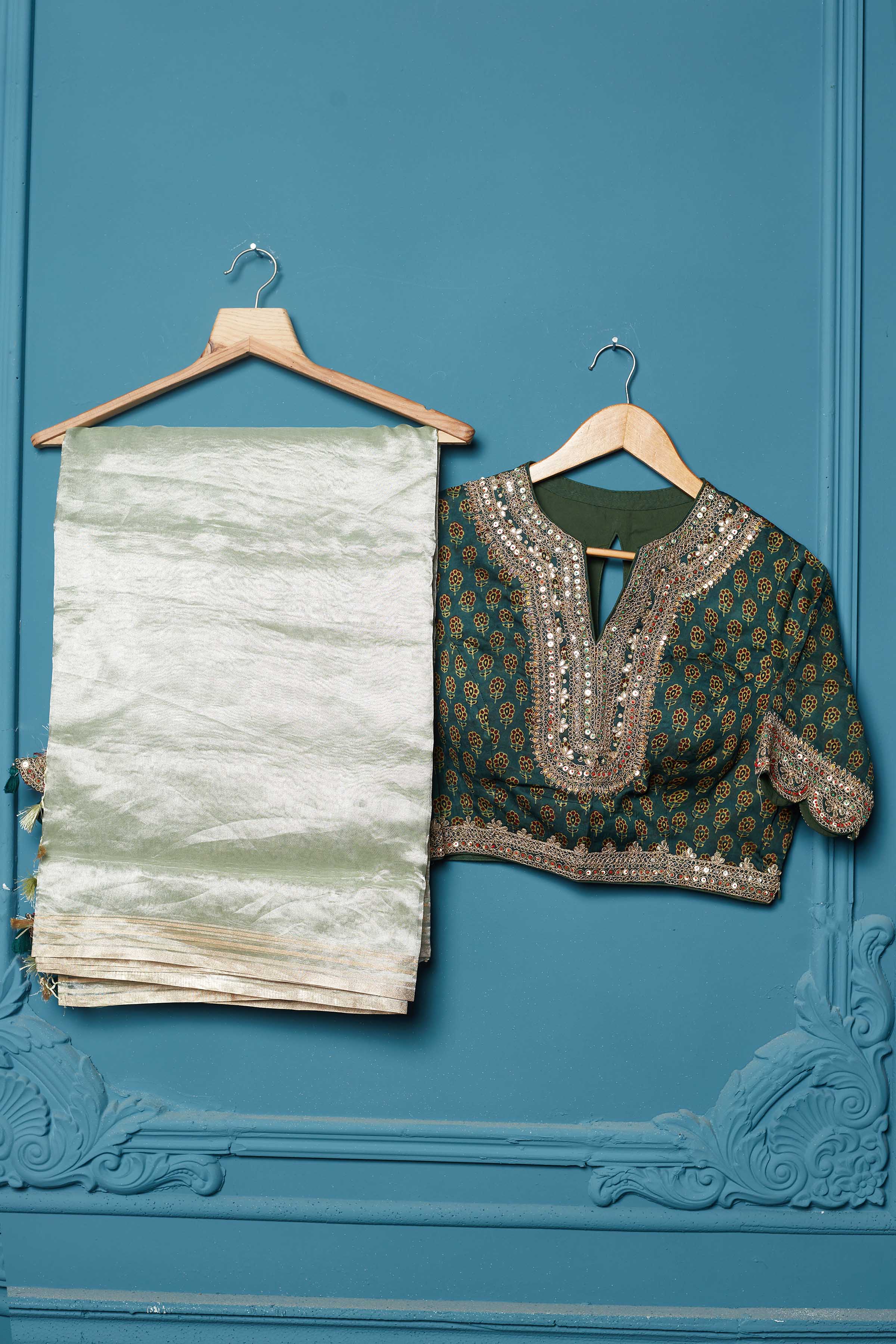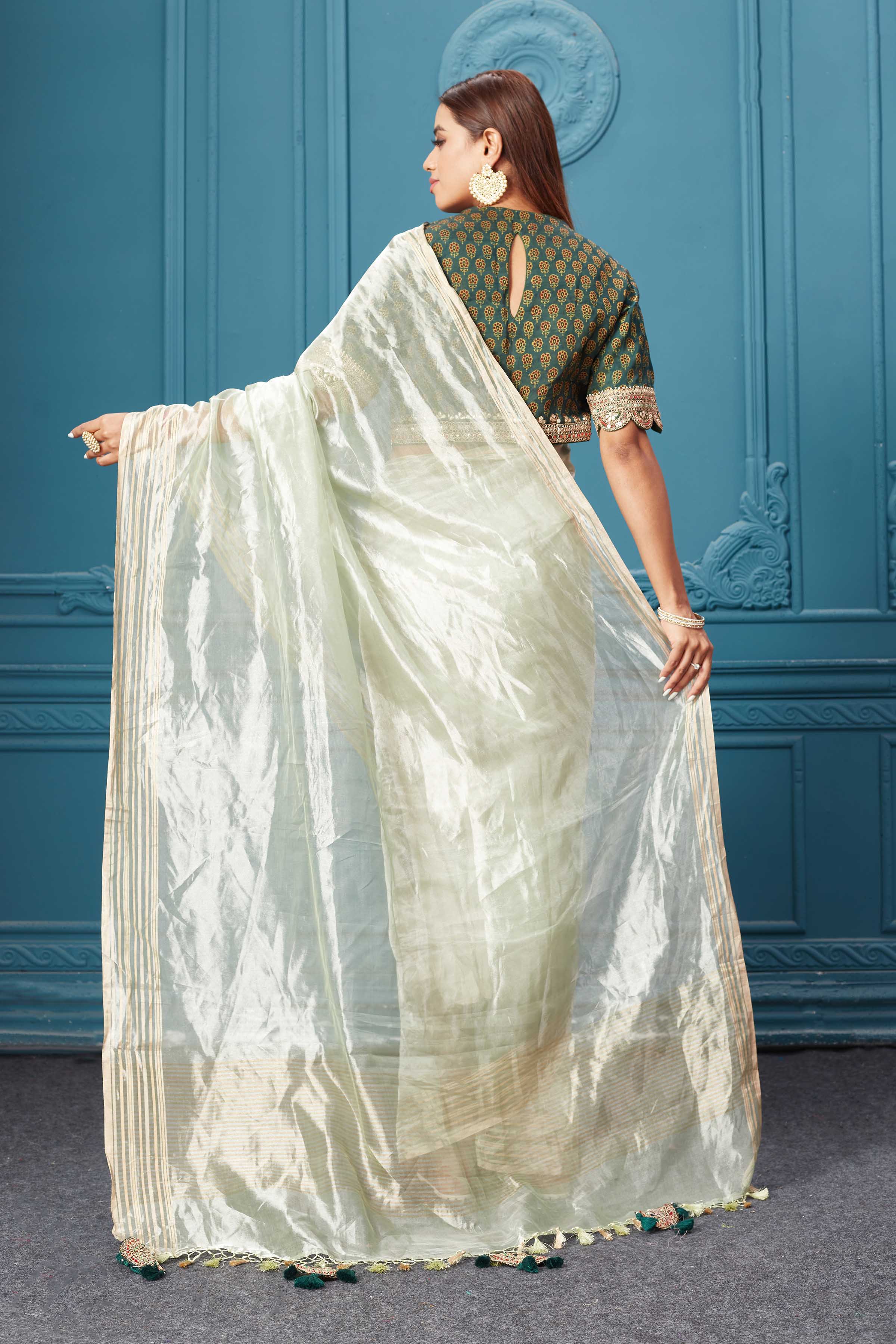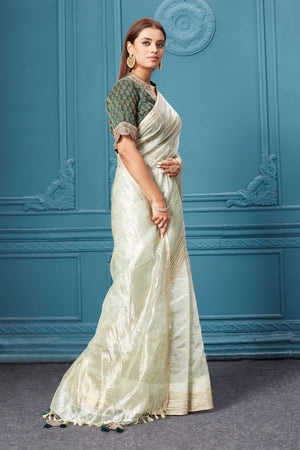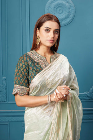 91A044 Pista Green Tissue Kora Silk Saree with Green Saree Blouse