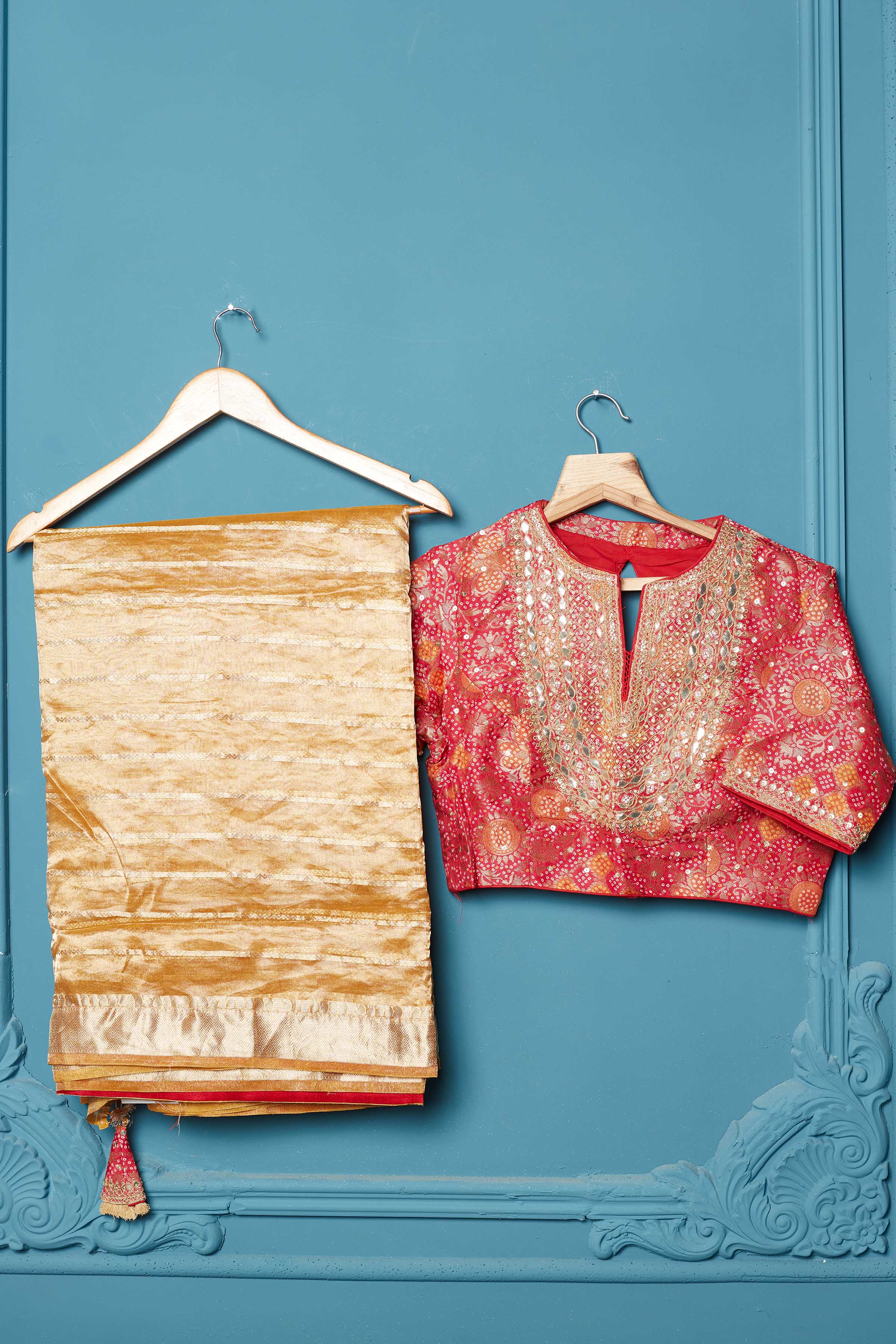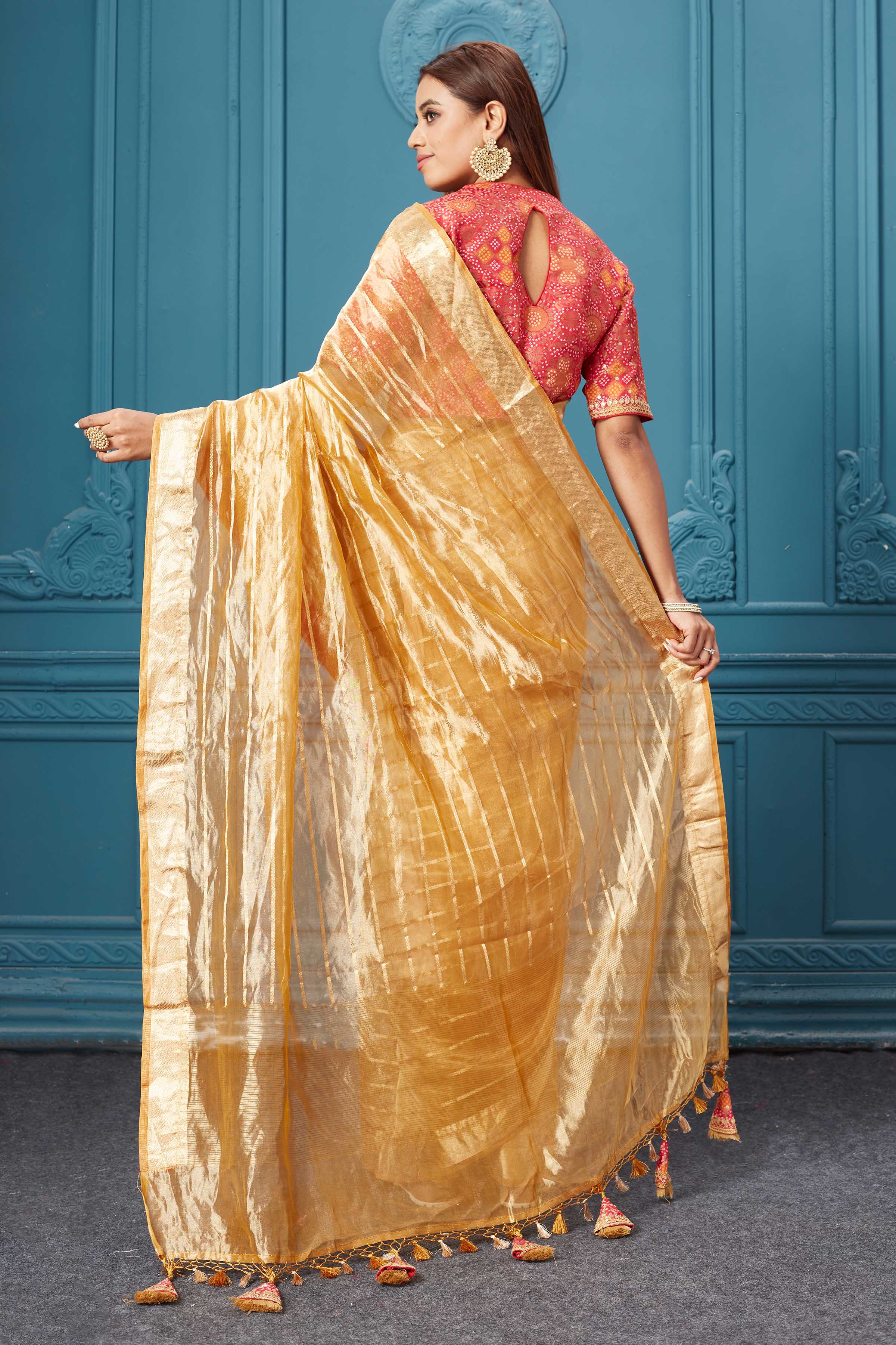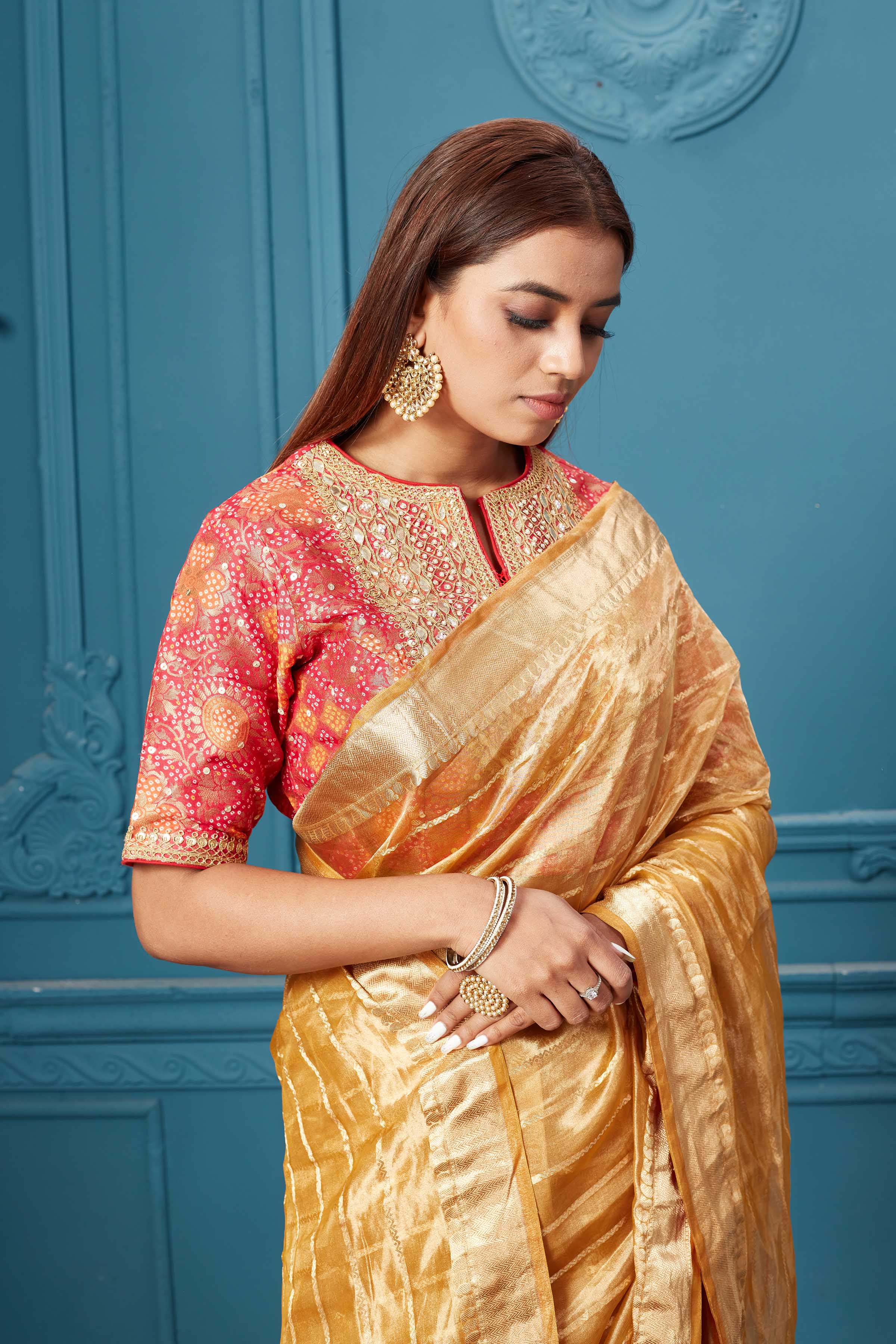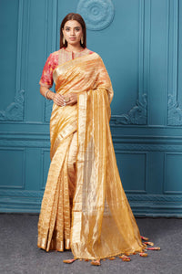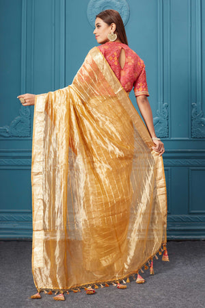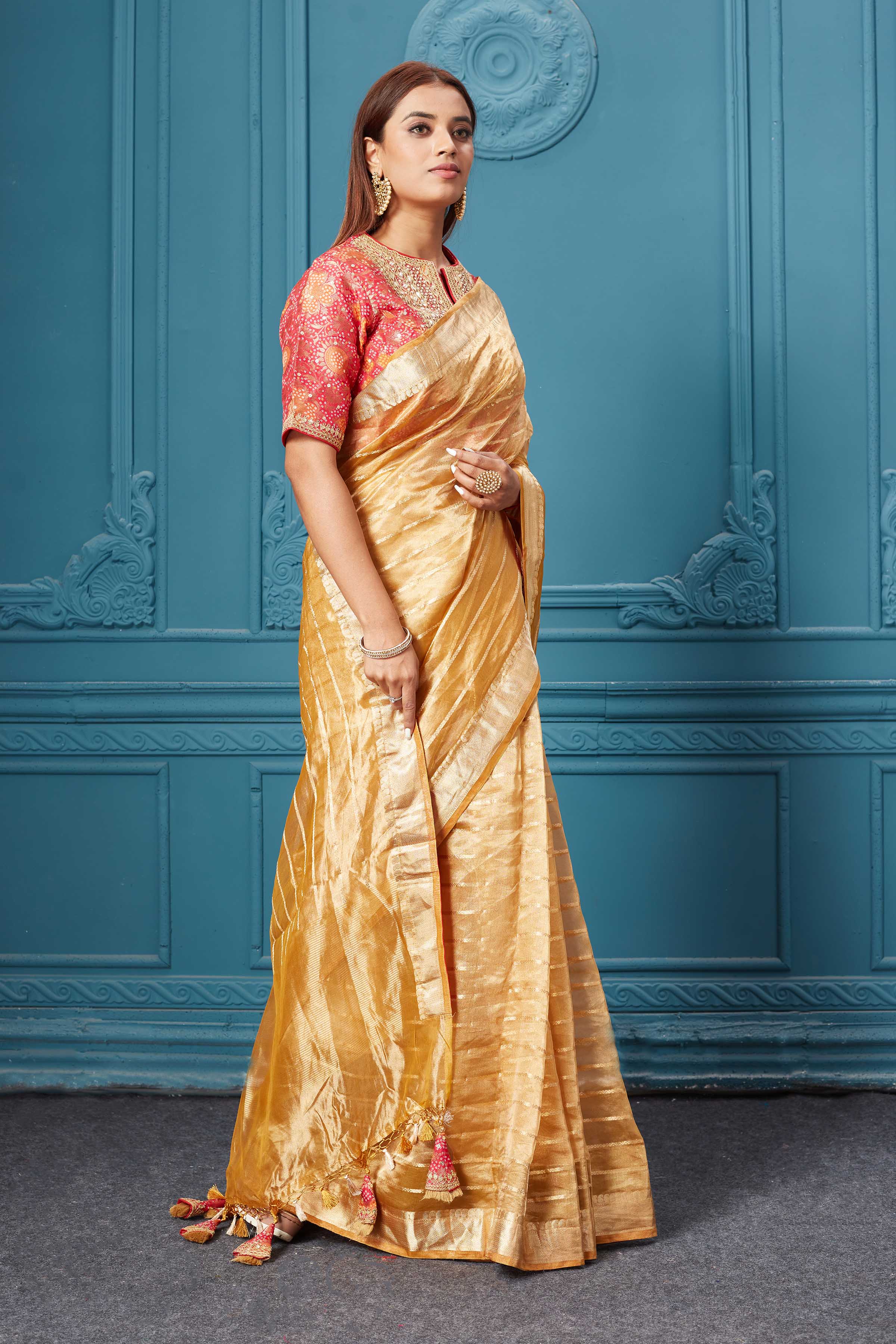 Look royal on weddings and festive occasions in this stunning golden yellow organza silk saree. It comes with a pink embroidered blouse.