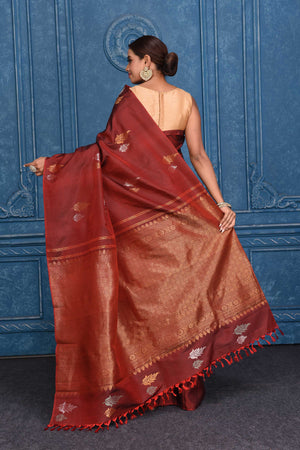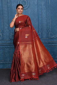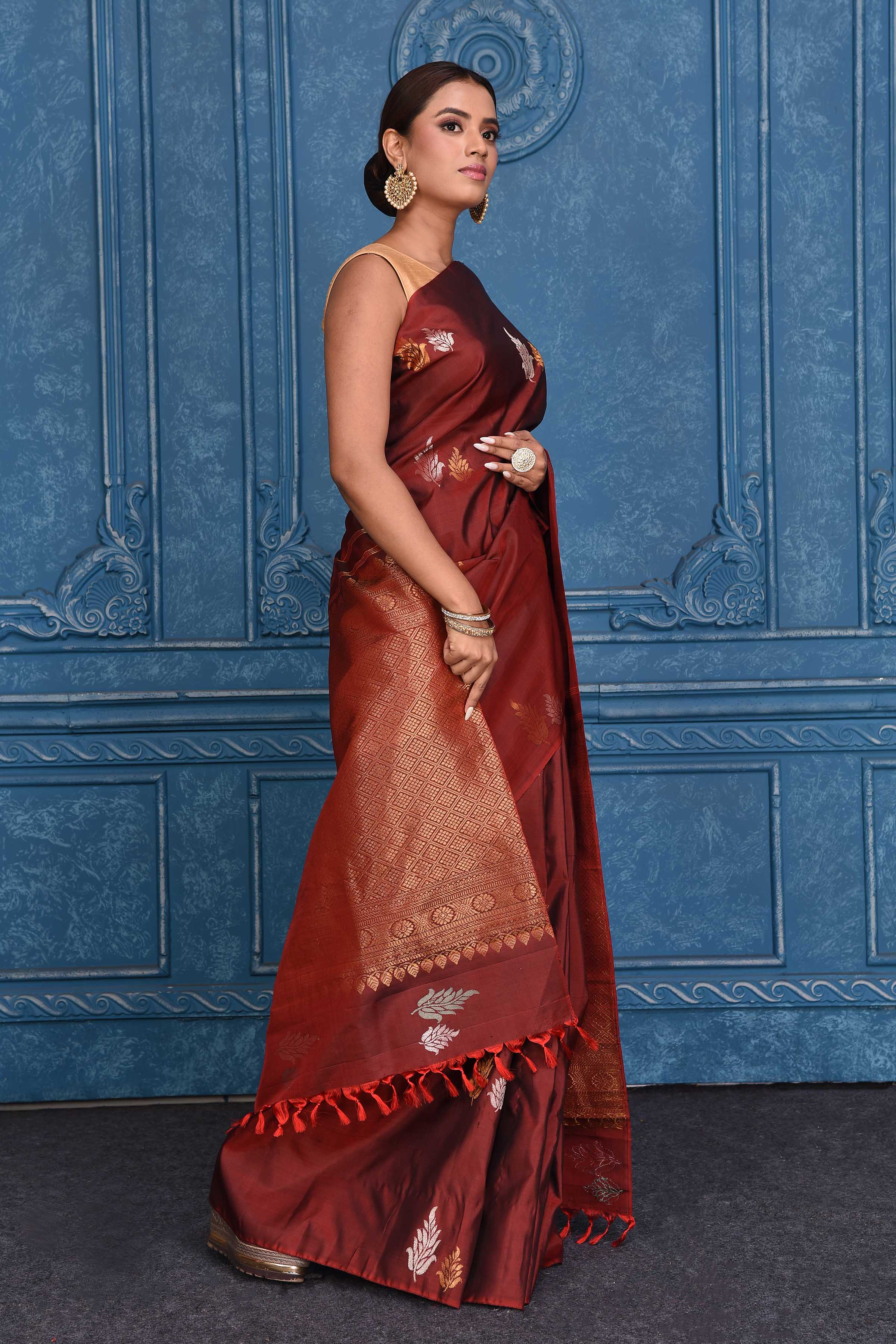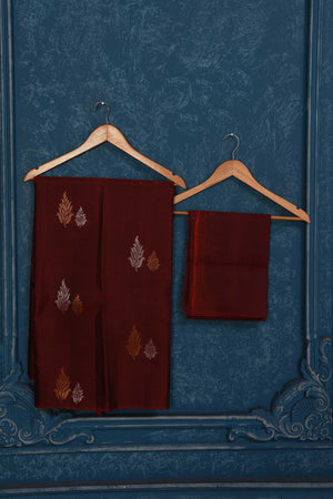 Look your best on festive occasions in this beautiful maroon Kanchipuram silk saree. The saree is enhanced with silver and golden zari leaf buta and zari pallu. It comes with a matching blouse piece.