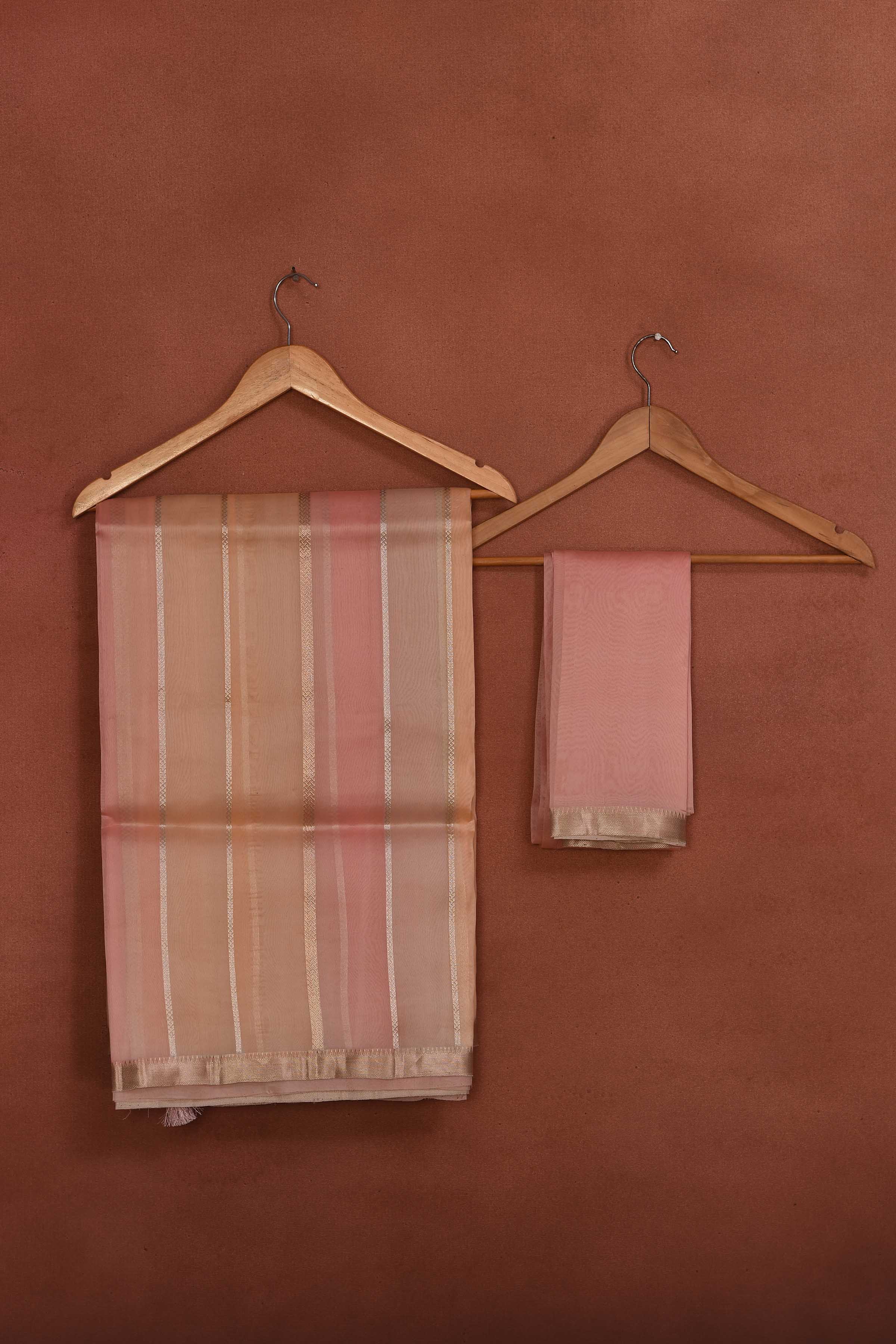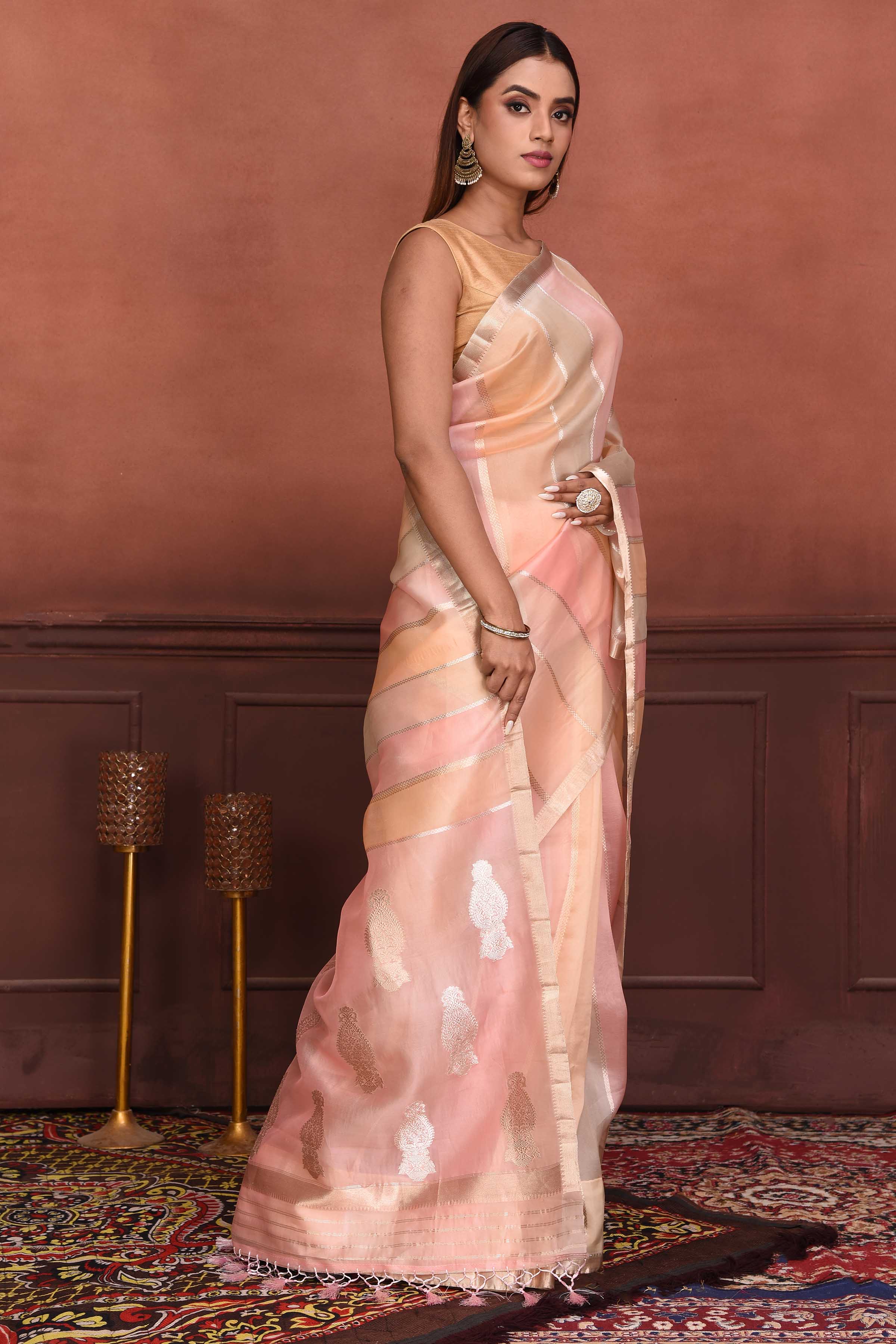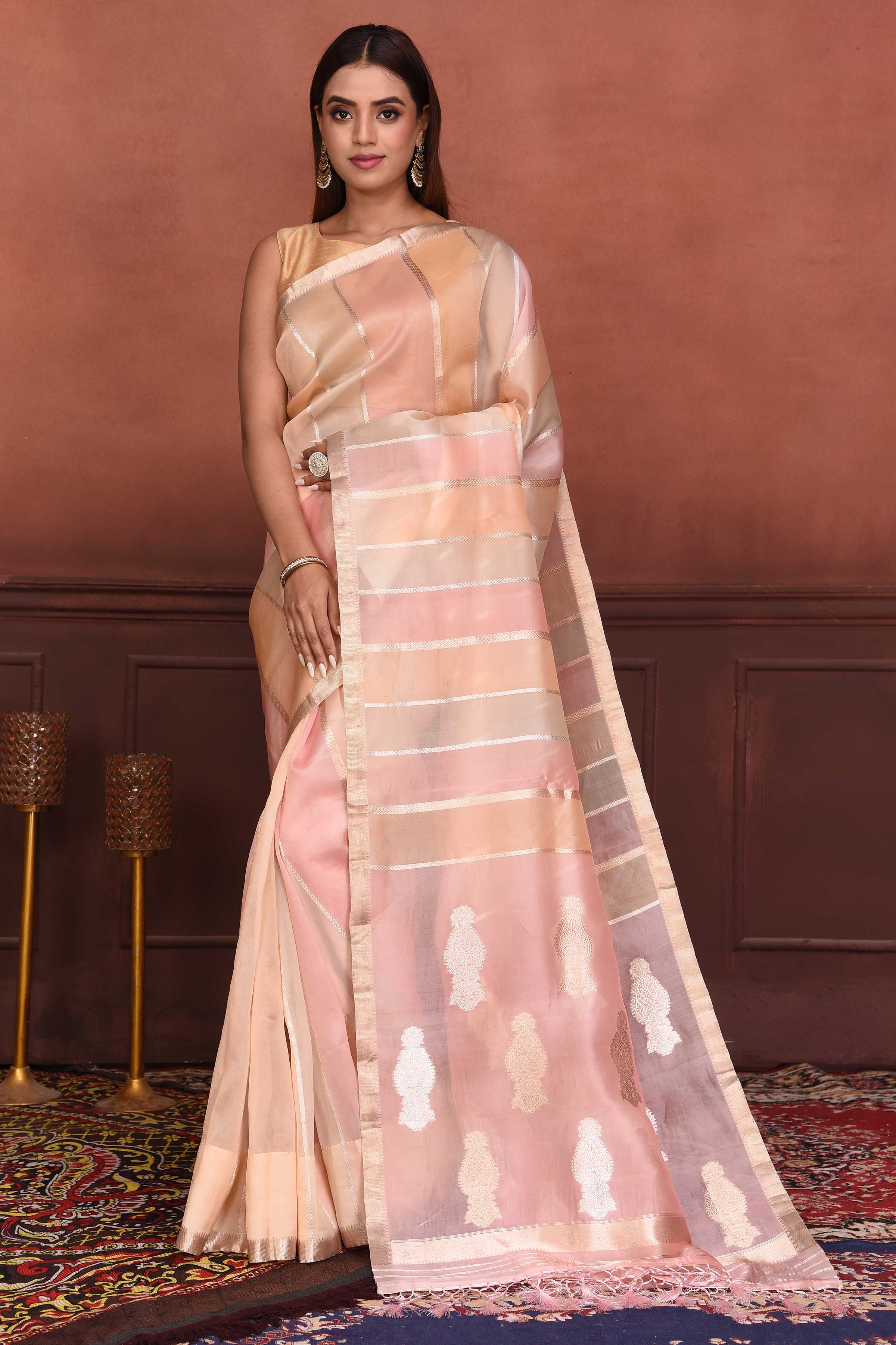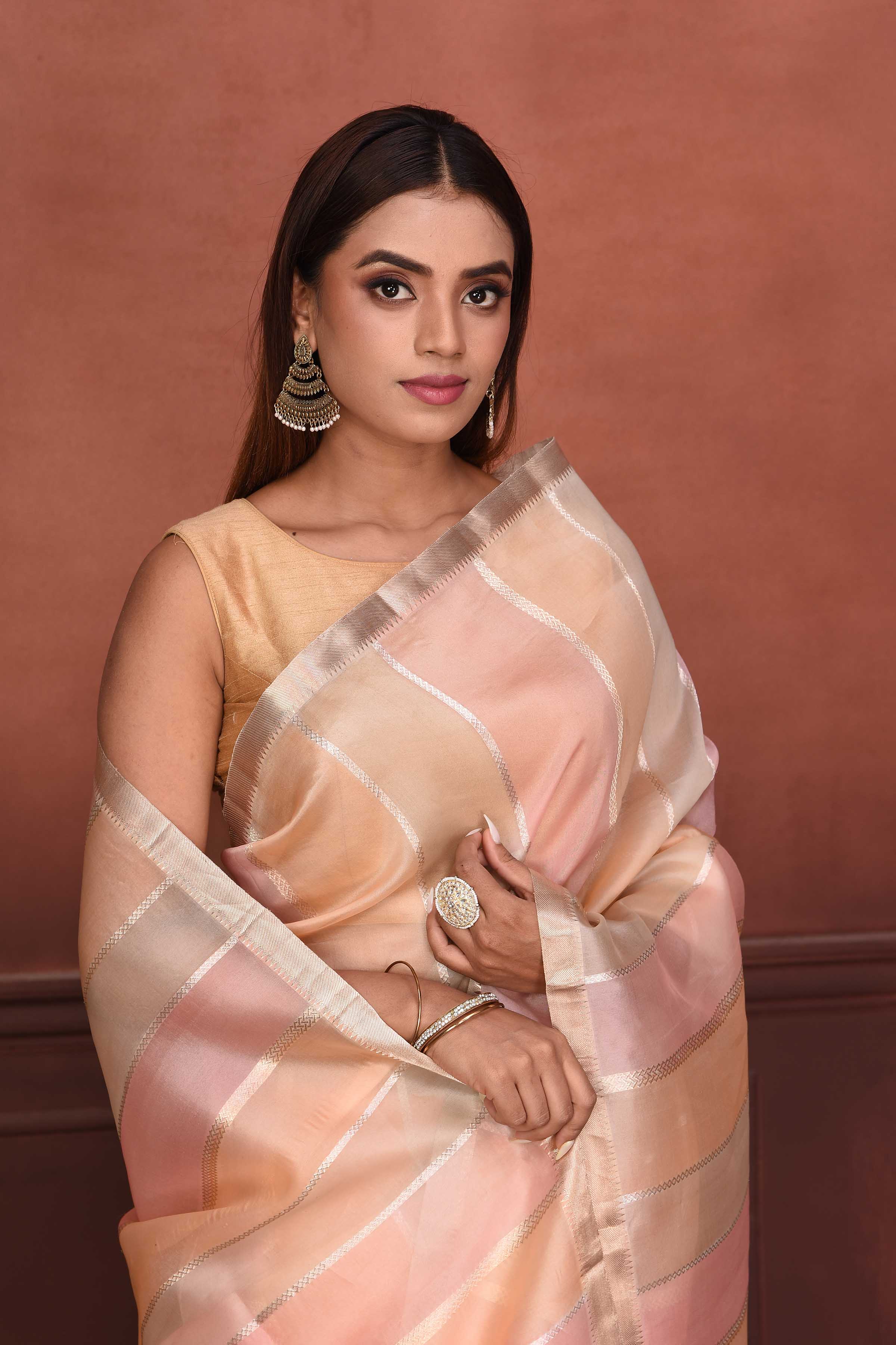 Radiate elegance on festive occasions in this beautiful peach and pink zari stripes organza Banarasi saree with zari buta on pallu. It comes with a matching blouse piece.