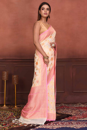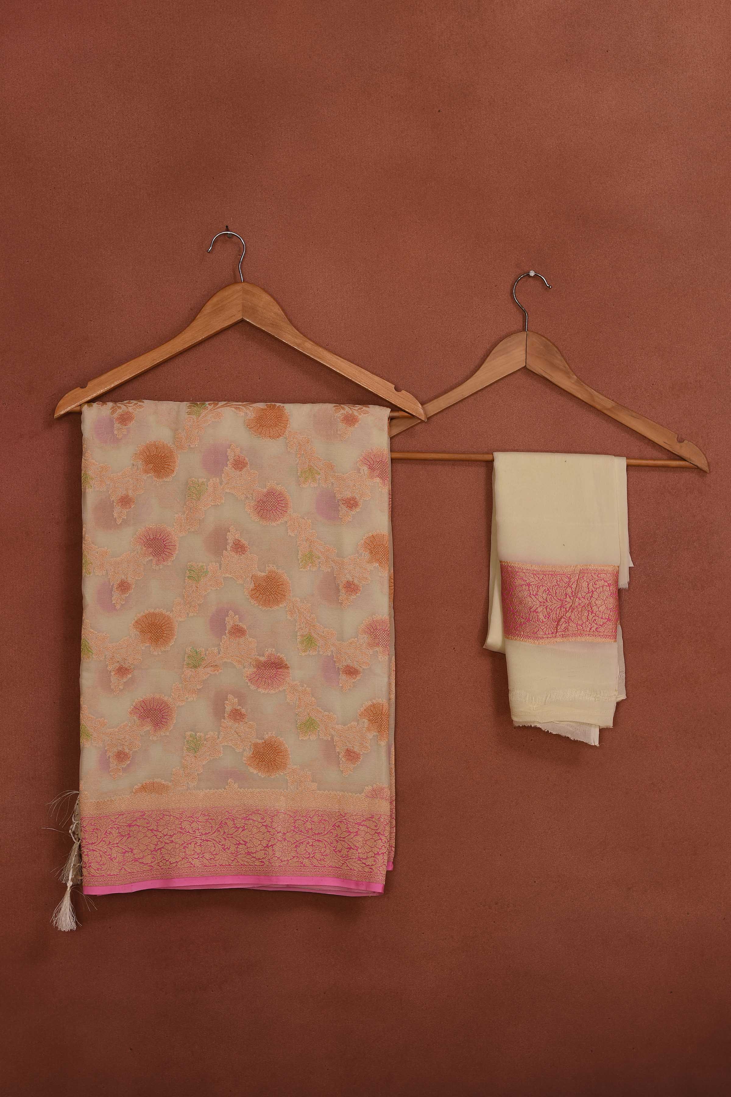 Radiate elegance on festive occasions in this cream georgette Banarasi saree with floral zari work and pink zari border. It comes with a matching blouse piece.