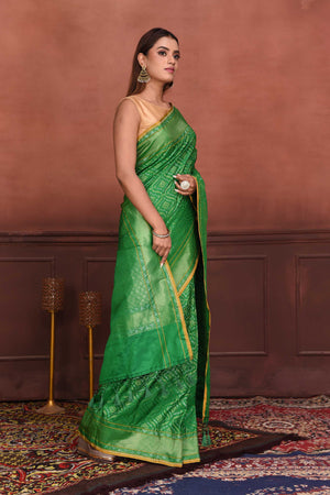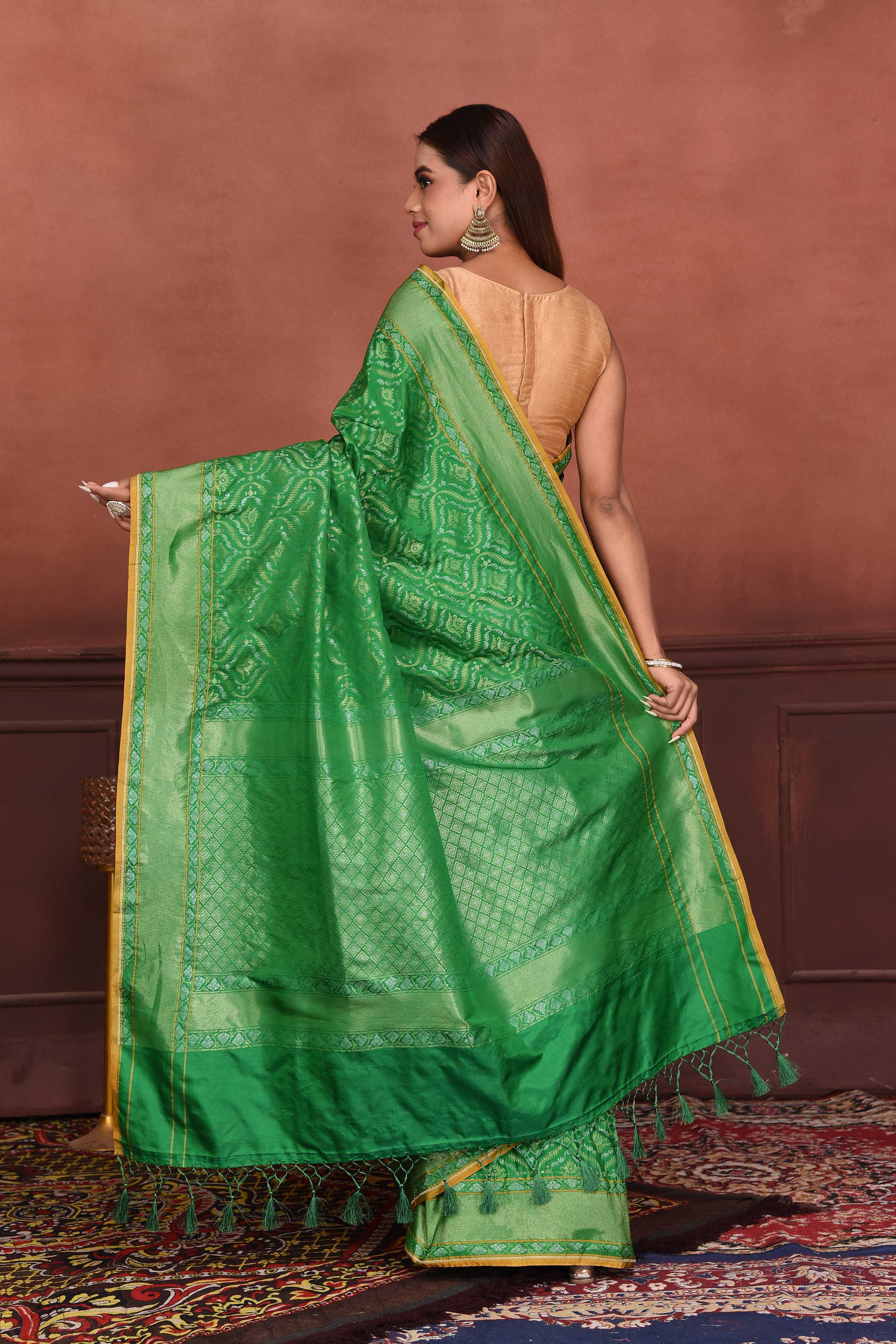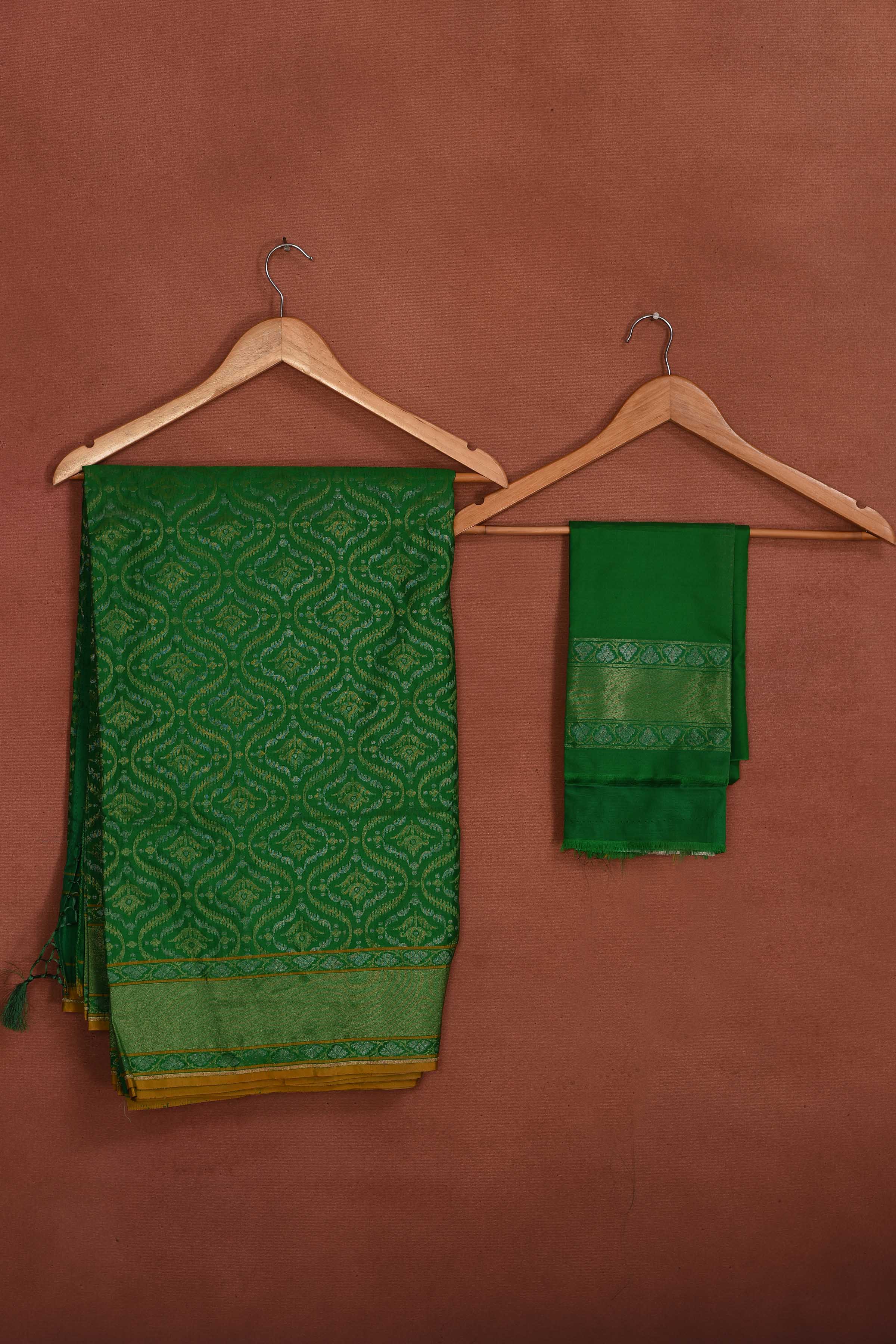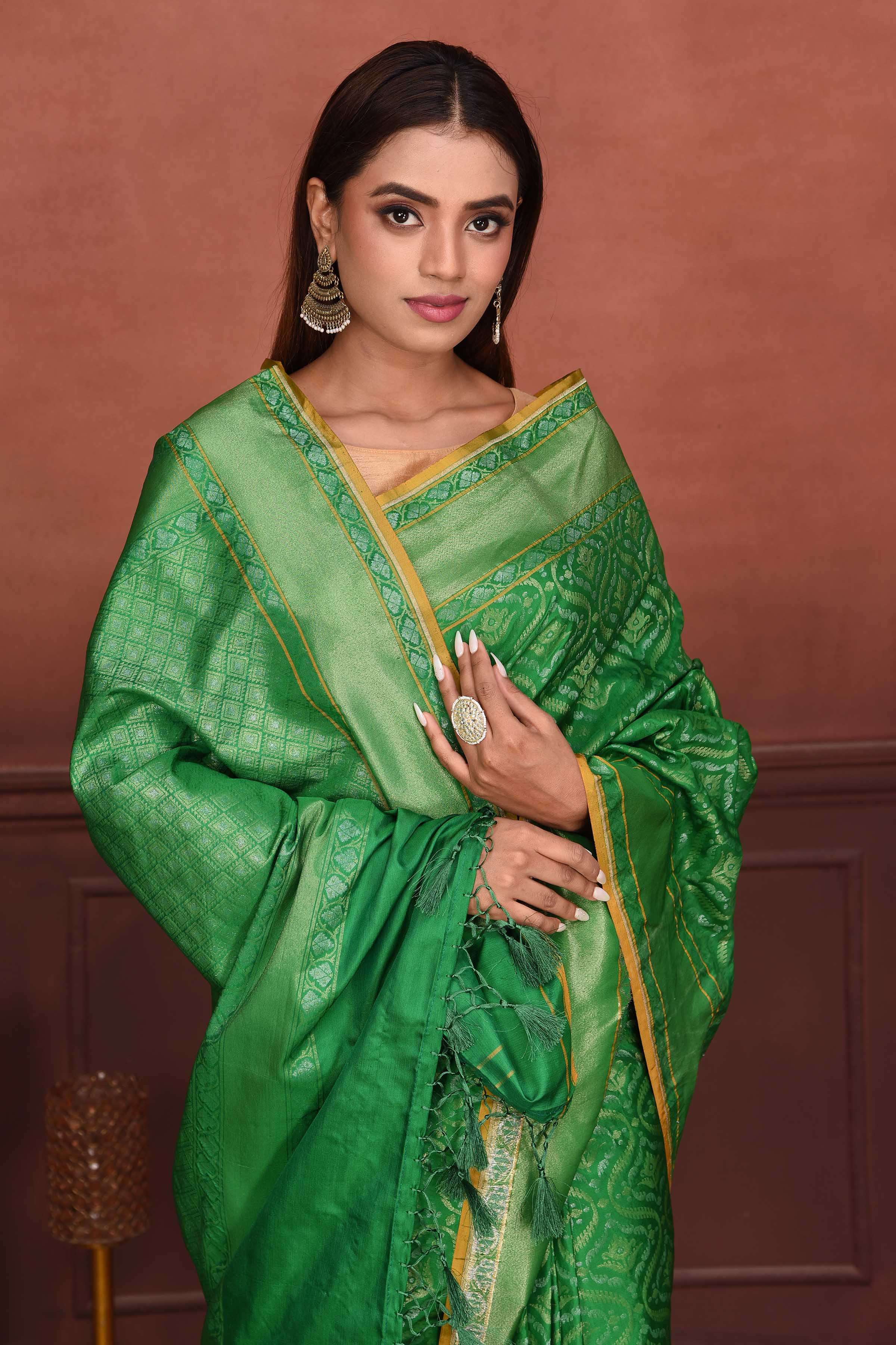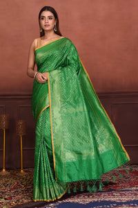 Radiate elegance on festive occasions in this beautiful green Katan silk Banarasi saree with over all zari work. The saree has yellow edging. It comes with a matching blouse piece.