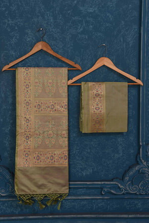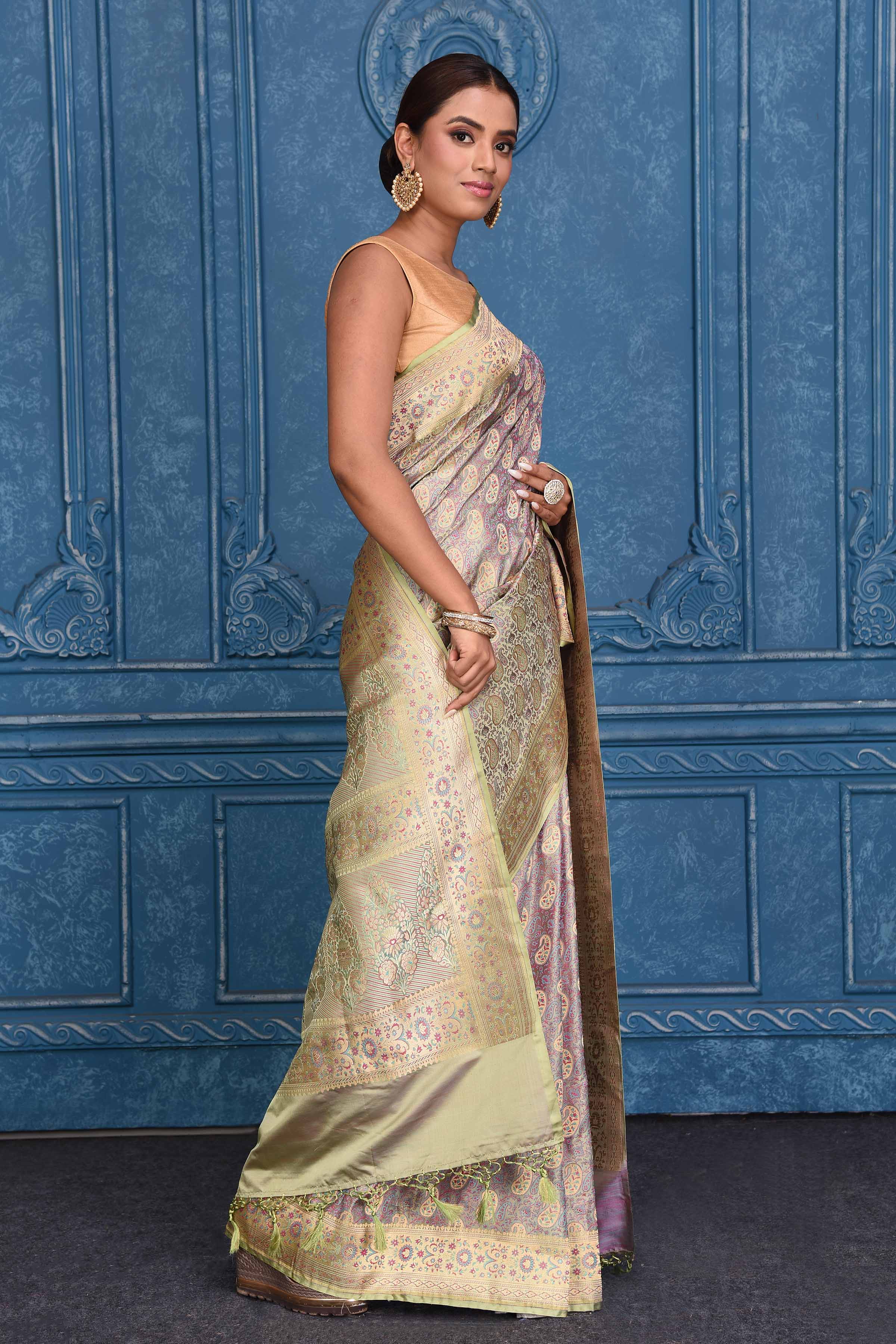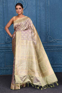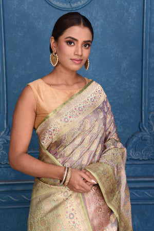 Look elegant on special occasions in this beautiful golden and purple Tanchoi silk Banarasi saree with zari border and buta, It comes with a matching blouse piece. Shop Banarasi saris in USA from Pure Elegance.