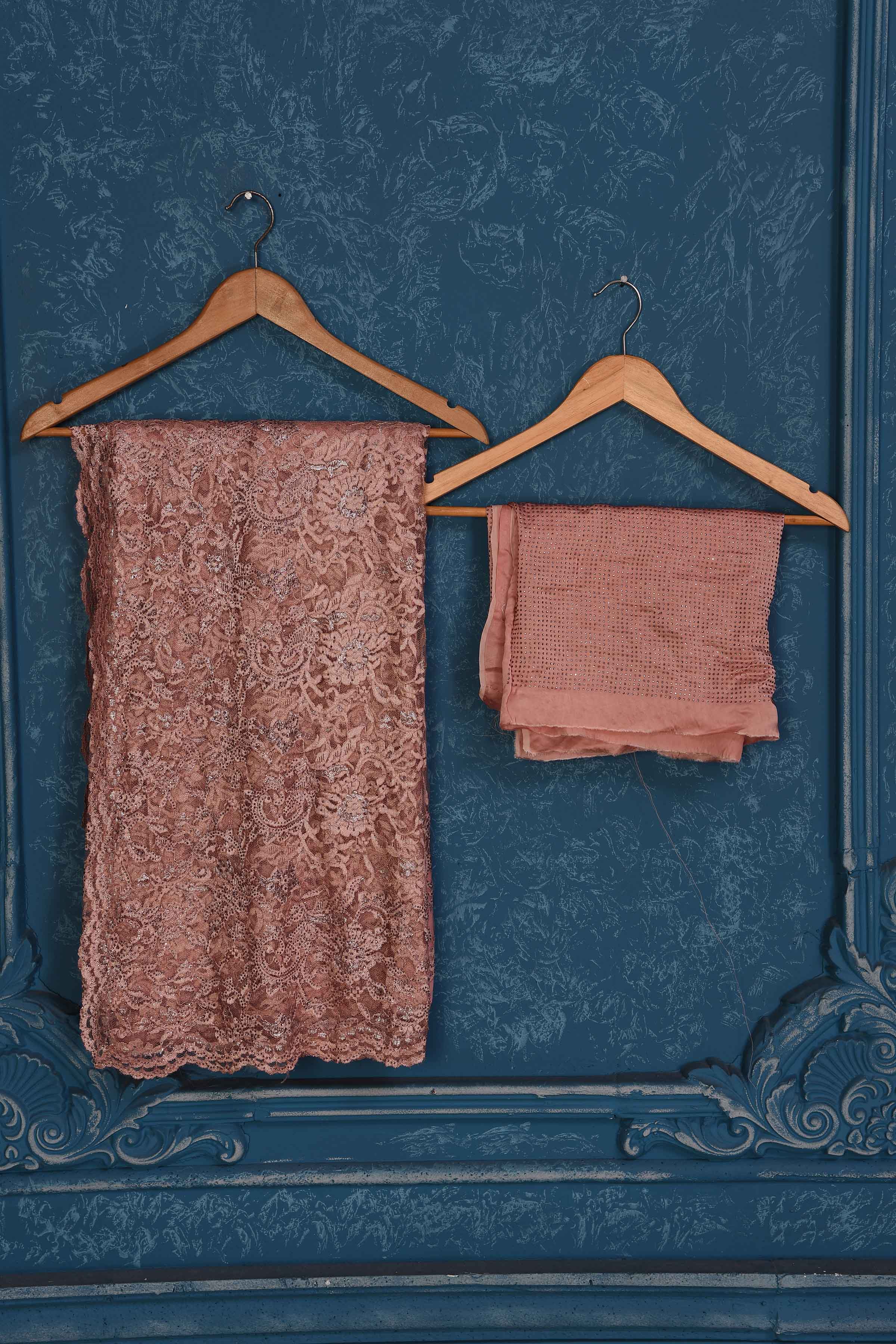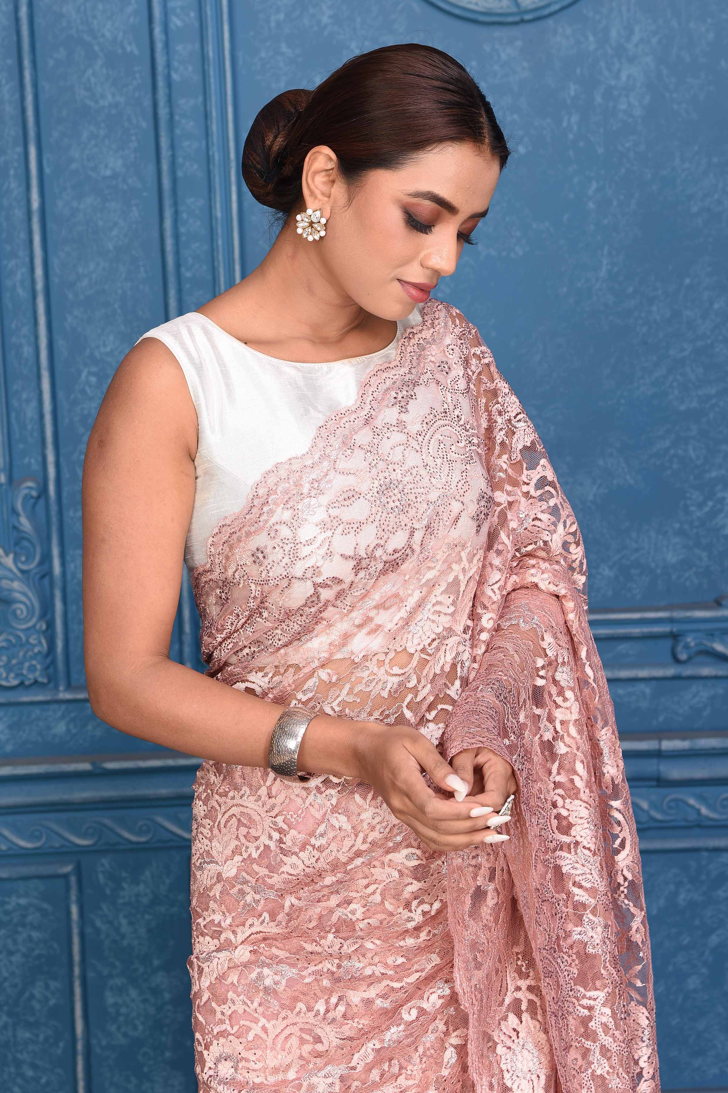 Look your best on special occasions in this dusty pink lace saree. It comes with a matching blouse piece.