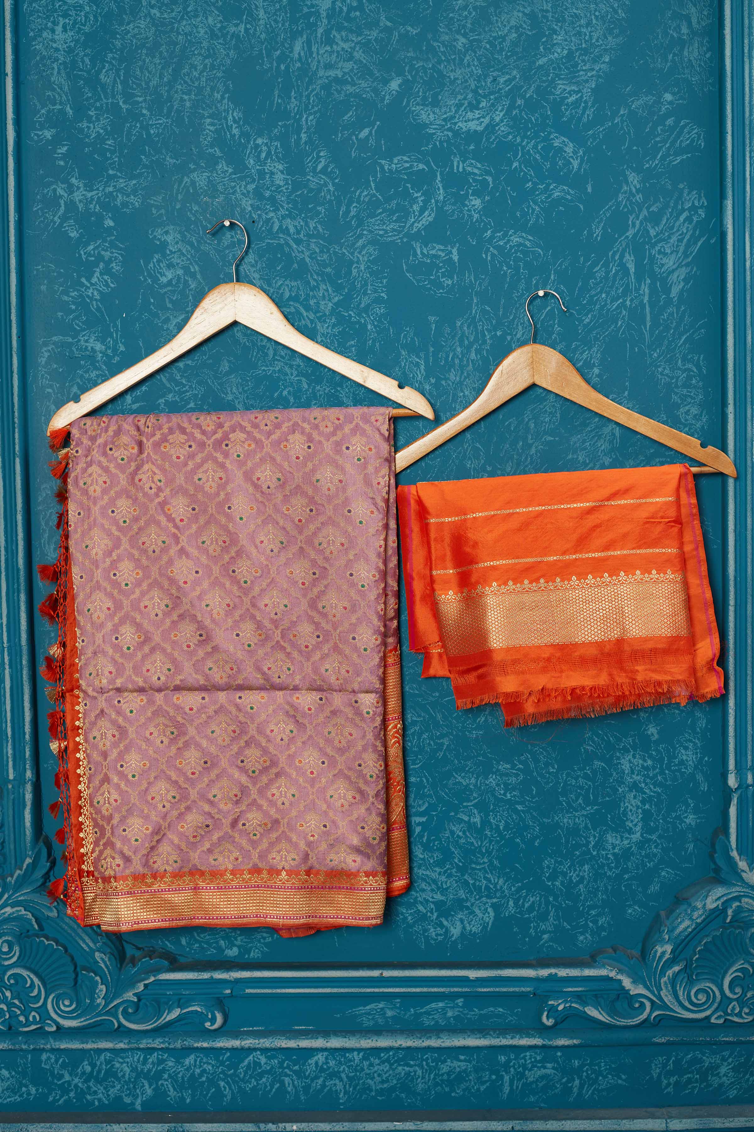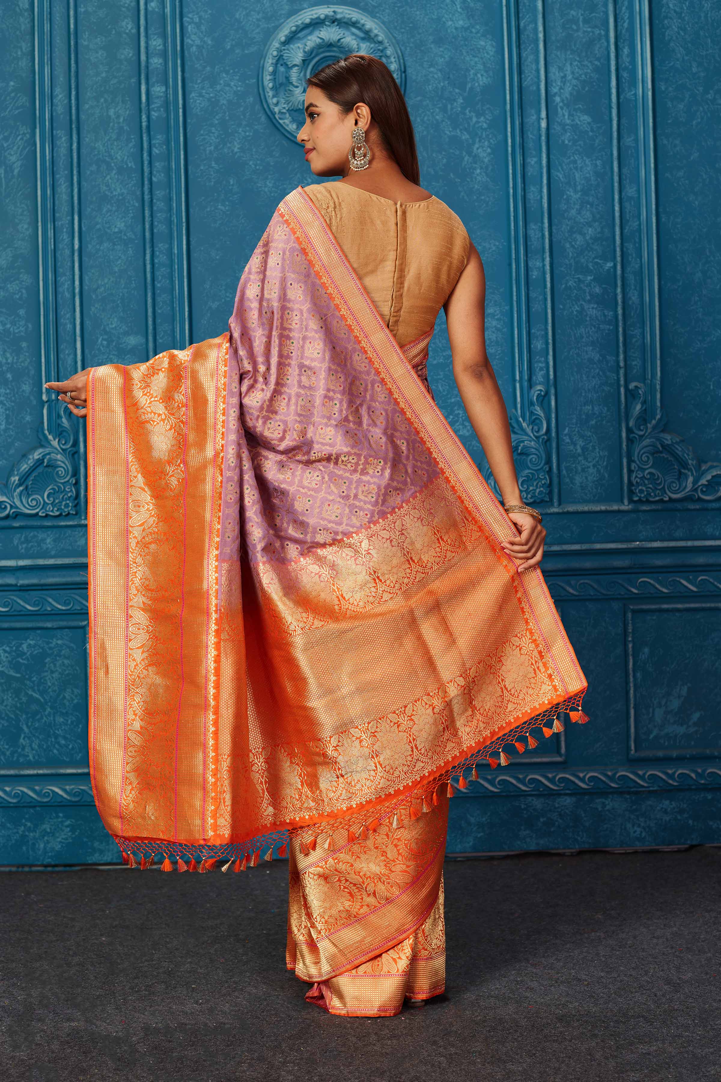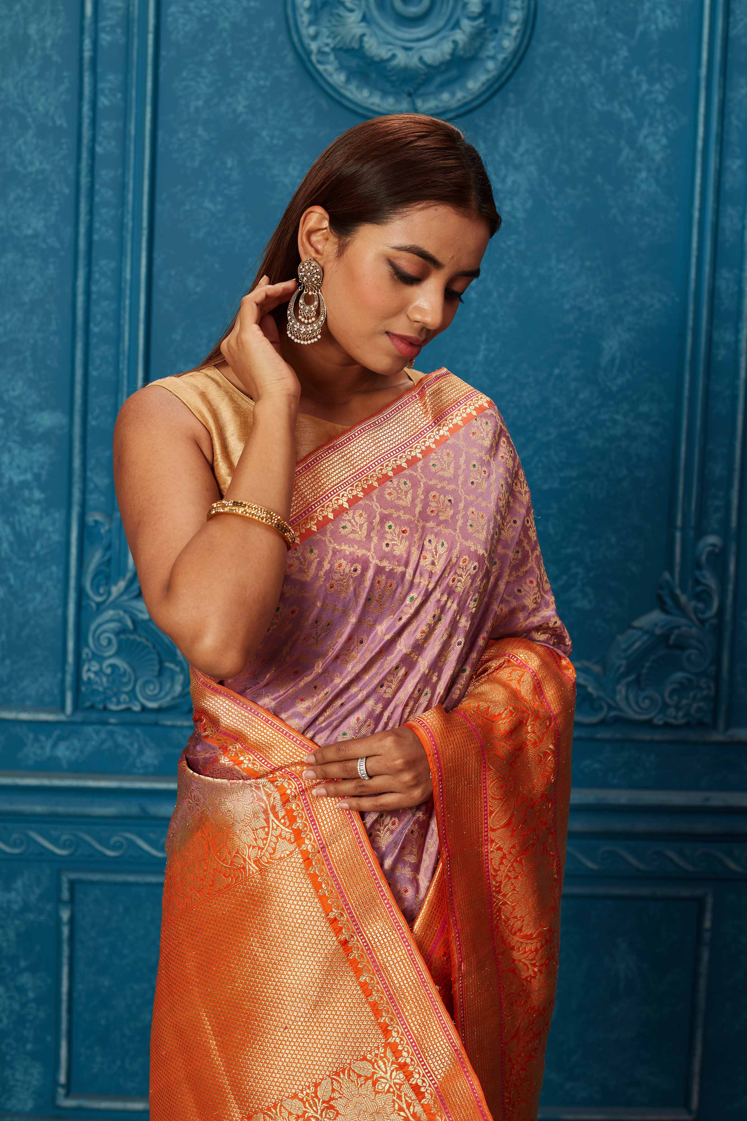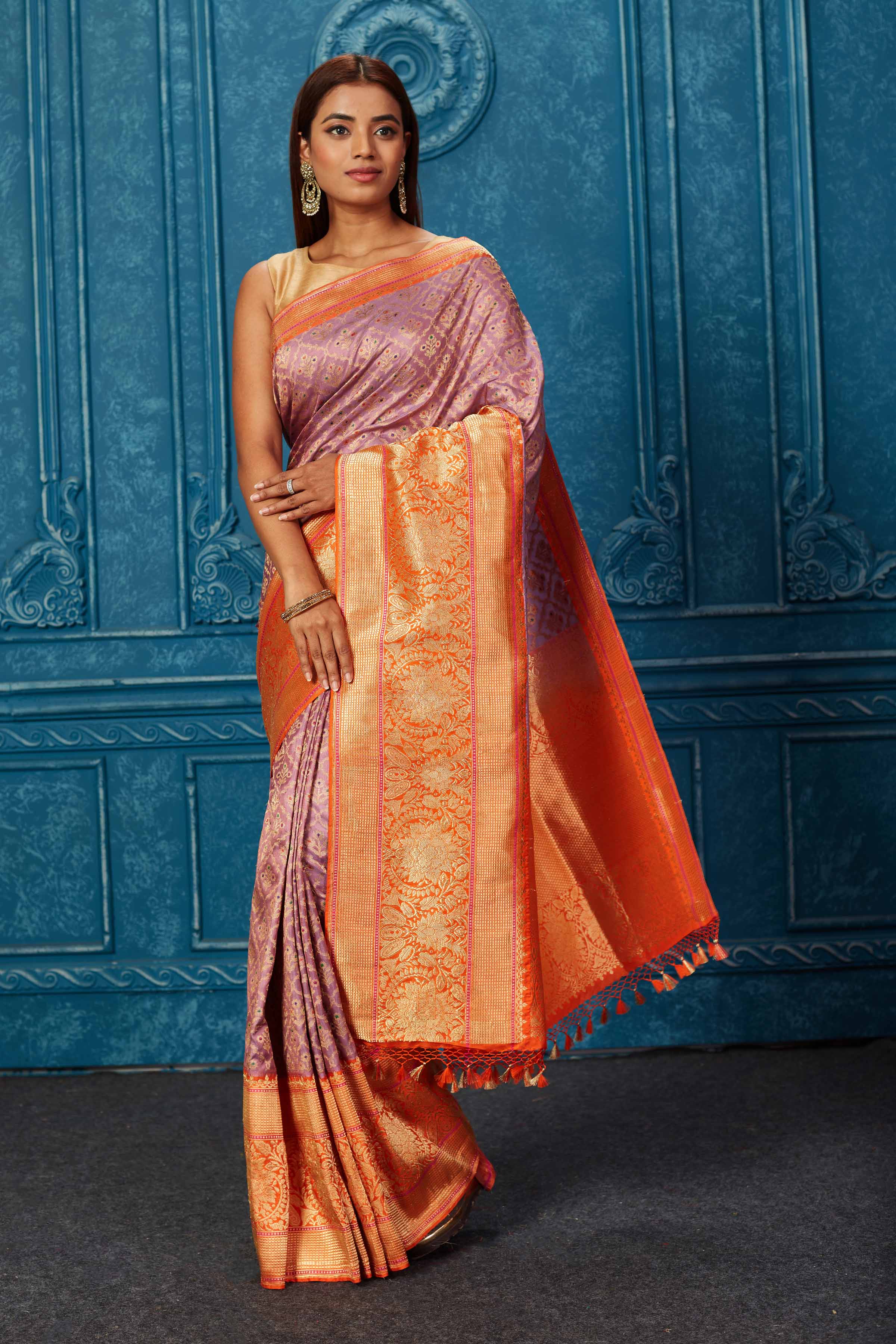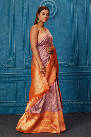 Look your best at weddings and festive occasions in this beautiful lavender Banarasi saree with zari minakari work and orange zari border. It comes with a matching blouse piece.