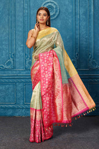 Look your best at weddings and festive occasions in this stunning green checker Banarasi saree with yellow and pink zari border. It comes with a matching blouse piece.