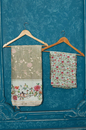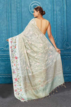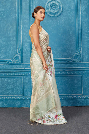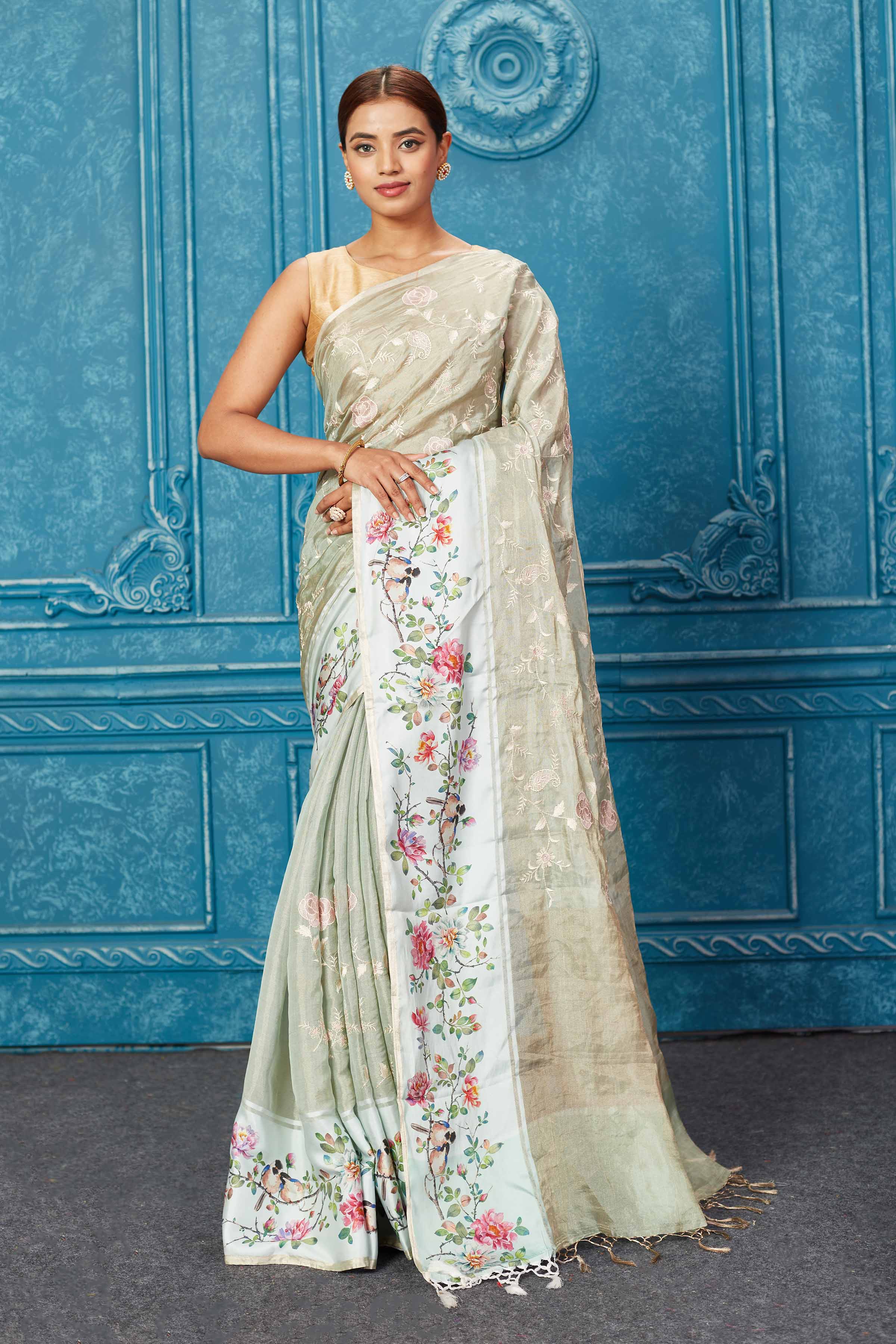 Keep it simple yet elegant on special occasions in this olive green organza tissue silk saree with printed Mashru border. It comes with a matching blouse piece. Shop organza sarees in USA from Pure Elegance.