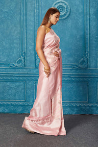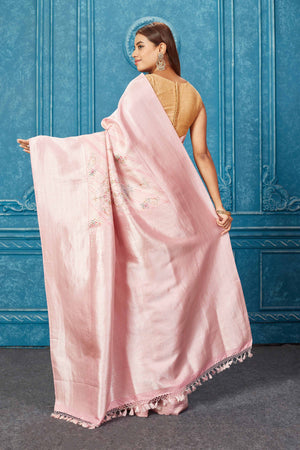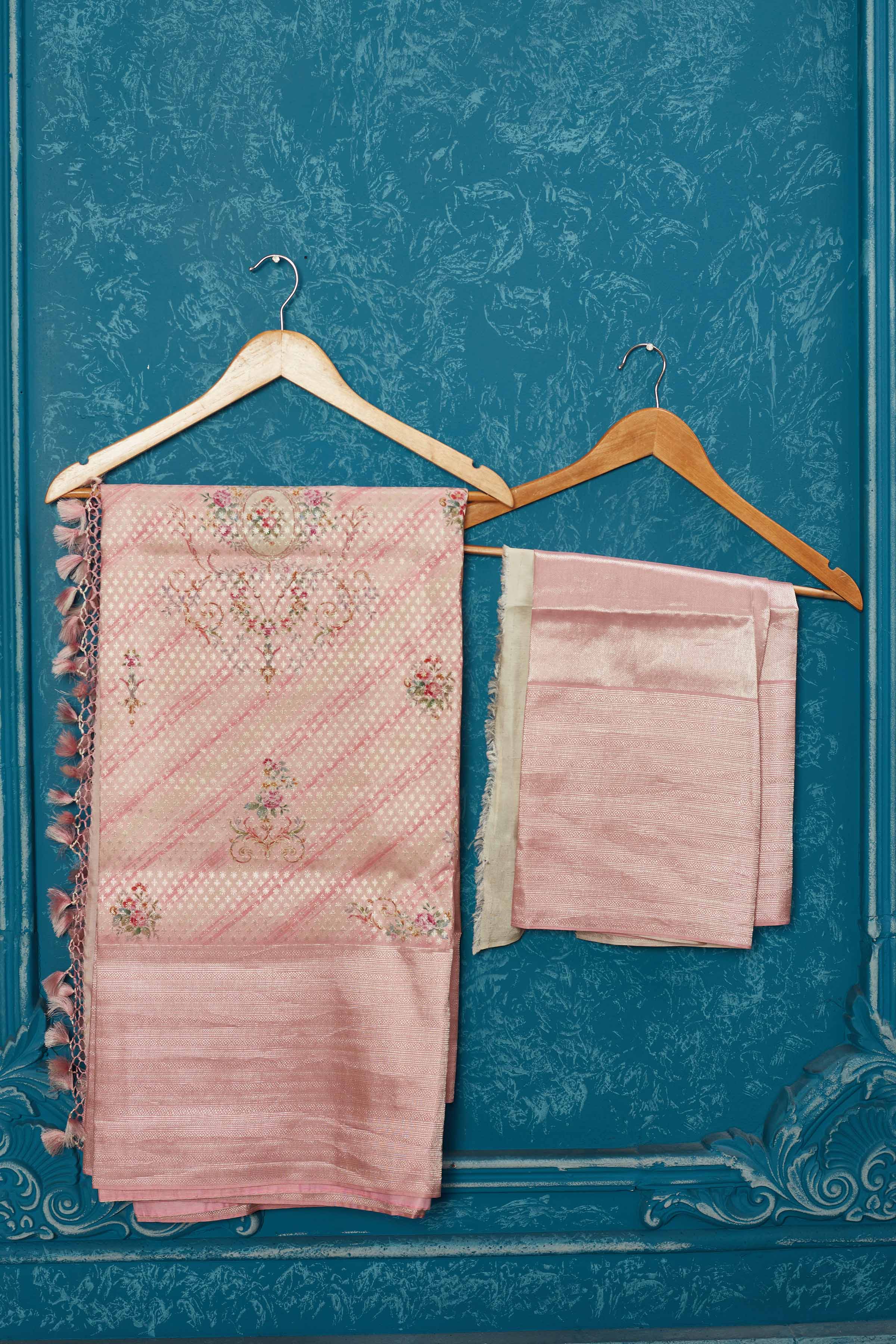 Keep it simple yet elegant on special occasions in this light pink floral Kanchipuram silk saree. It comes with a matching blouse piece. Shop organza sarees in USA from Pure Elegance.