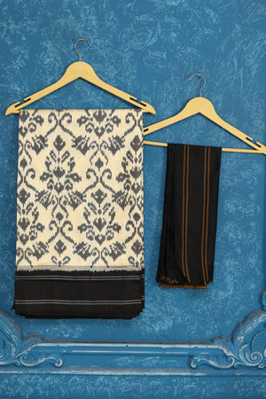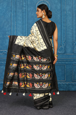 Alluring off-white Pochampally ikkat silk saree with black border is a perfect drape for parties and festive occasions. It comes with a matching blouse piece.