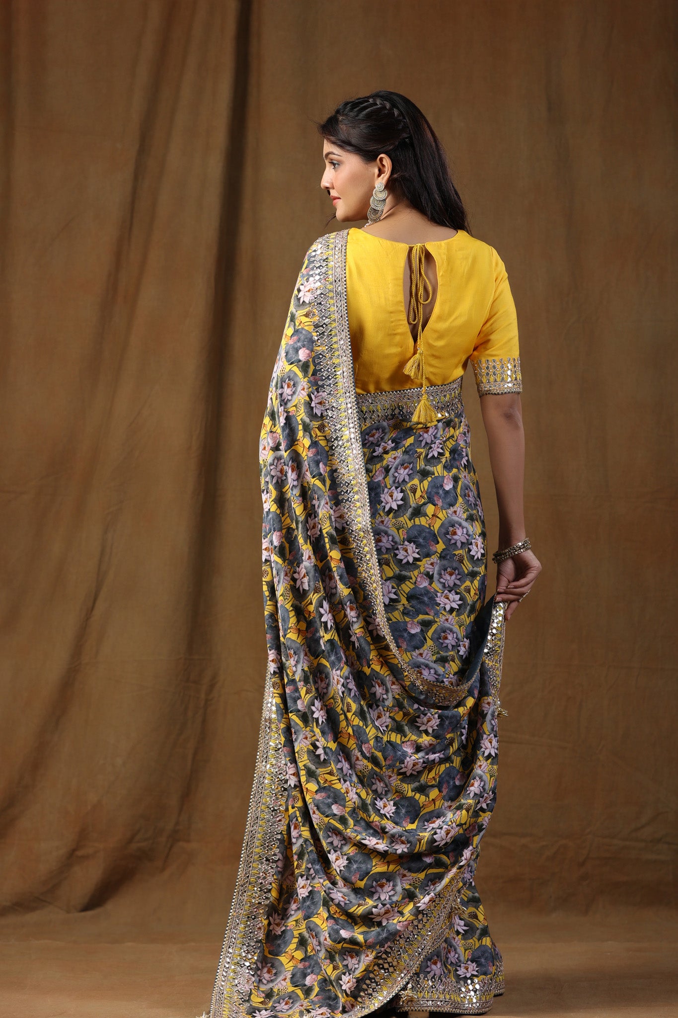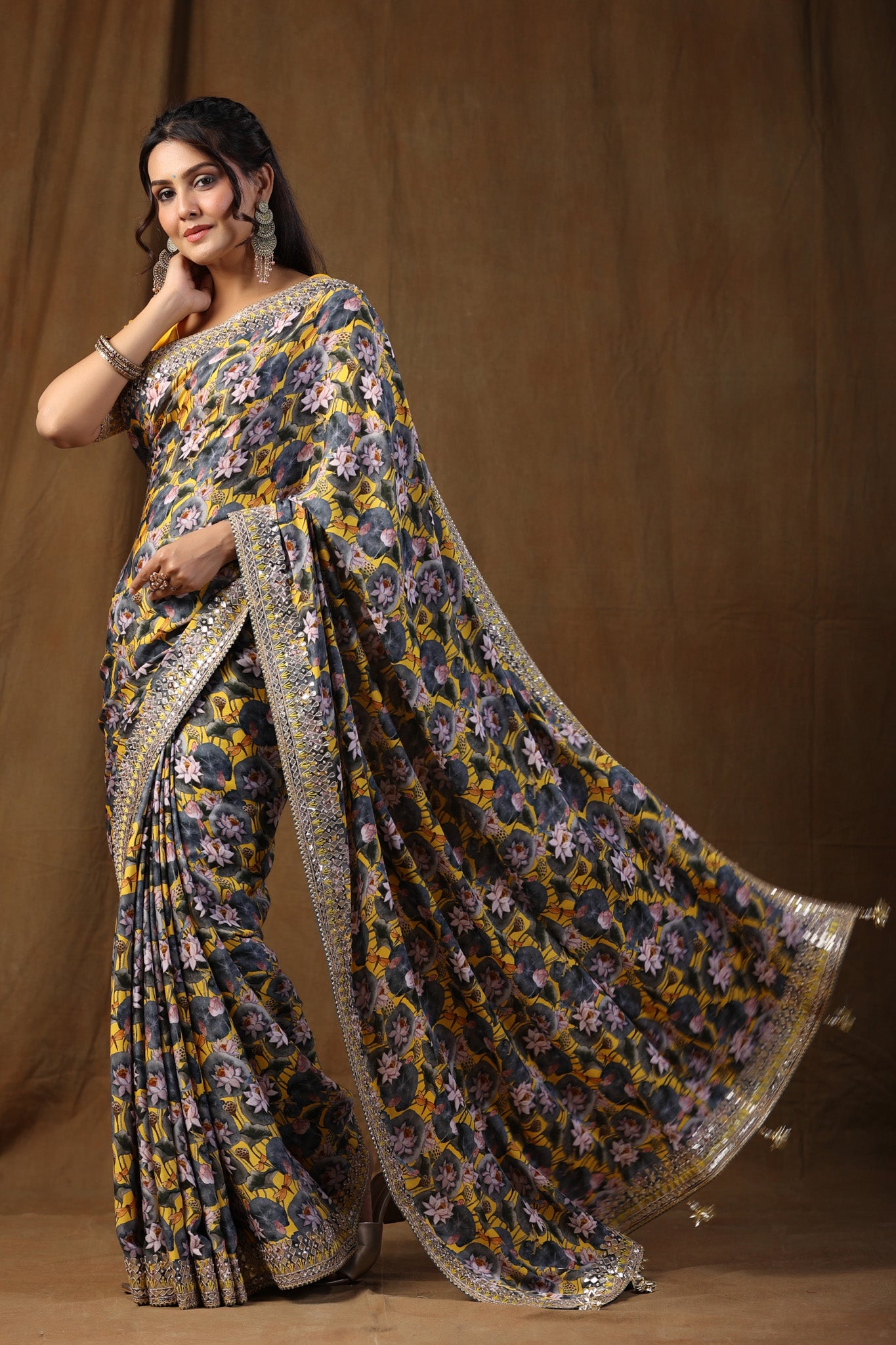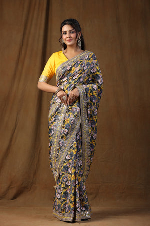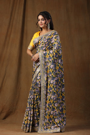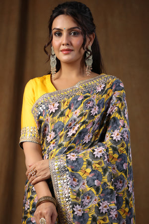 Go for this beautiful yellow and grey floral print crepe silk saree at parties and festive occasions. The saree comes with a yellow saree blouse. Shop designer saree online in USA from Pure Elegance.