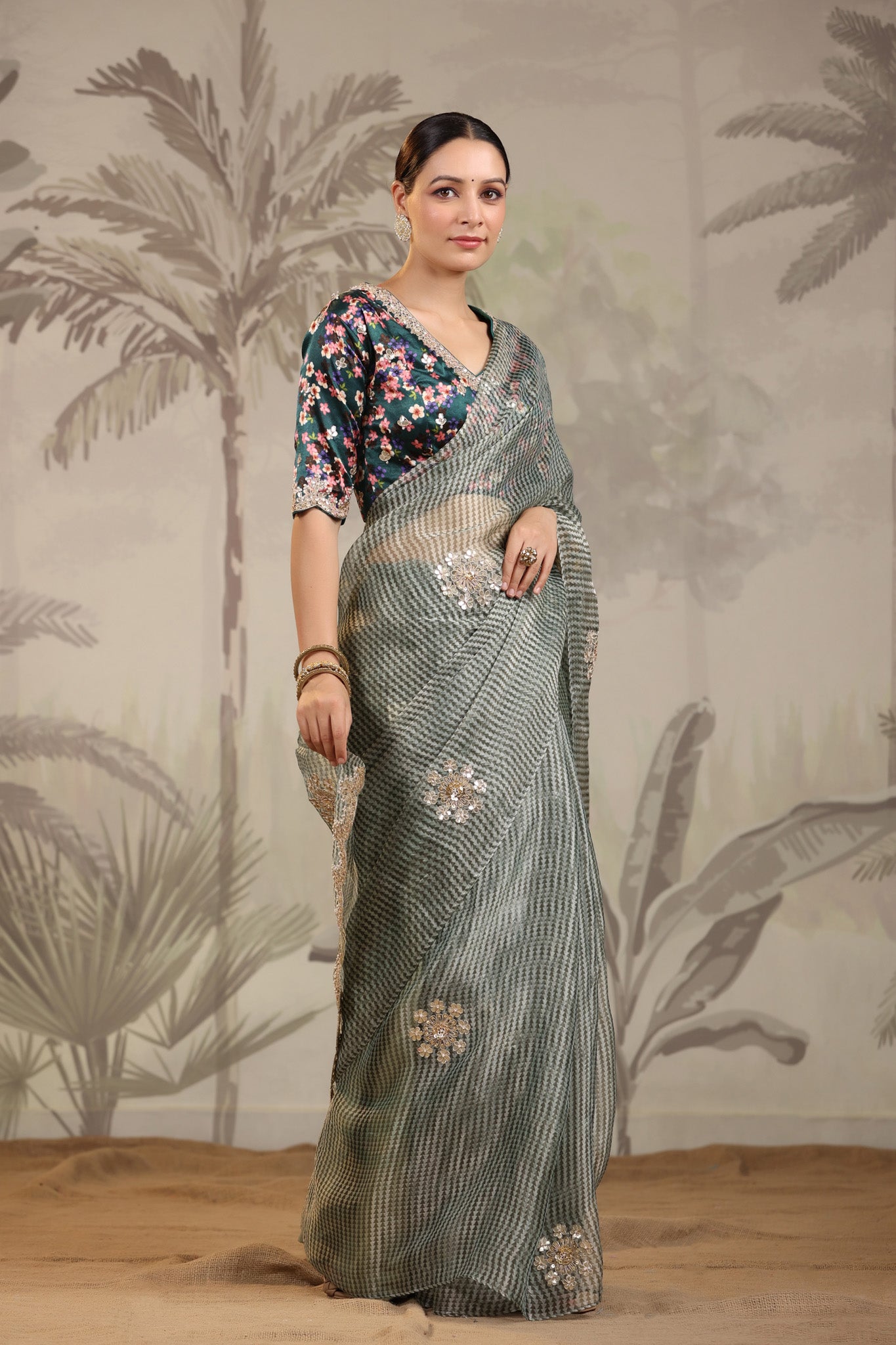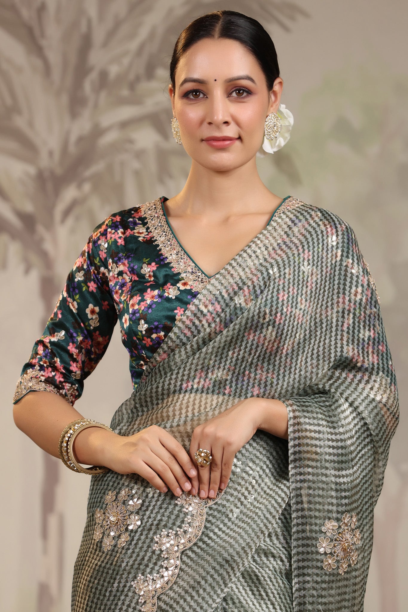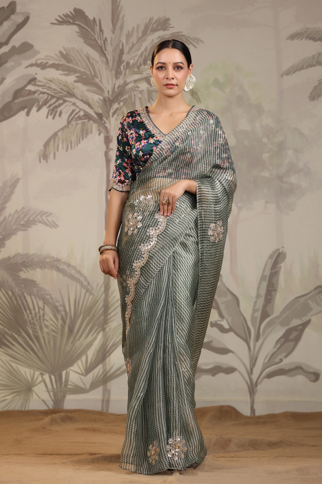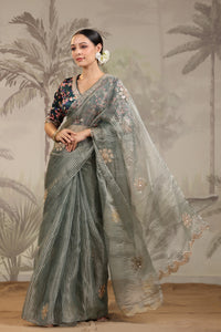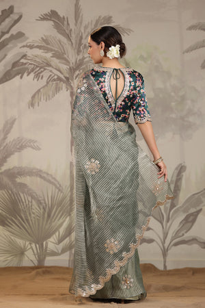 Go for this beautiful light grey embroidered organza silk saree at parties and festive occasions. The saree comes with green printed designer saree blouse. Shop designer saree online in USA from Pure Elegance.