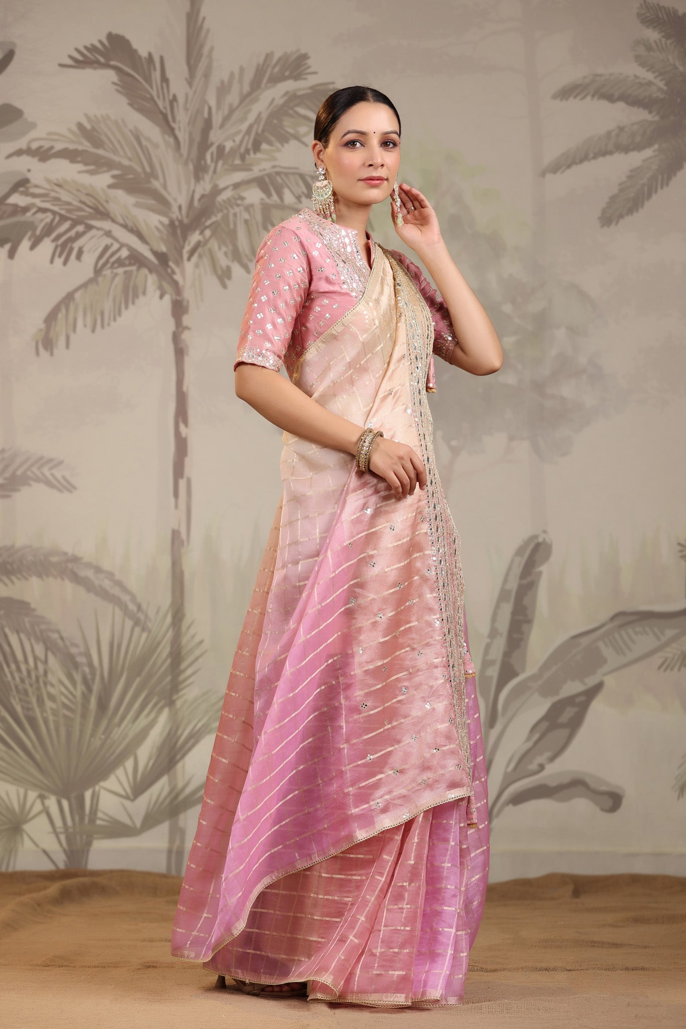 Go for this beautiful peach and pink embroidered tissue silk sari at parties and festive occasions. The saree comes with designer saree blouse. Shop designer saree online in USA from Pure Elegance.