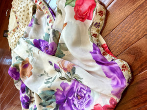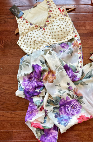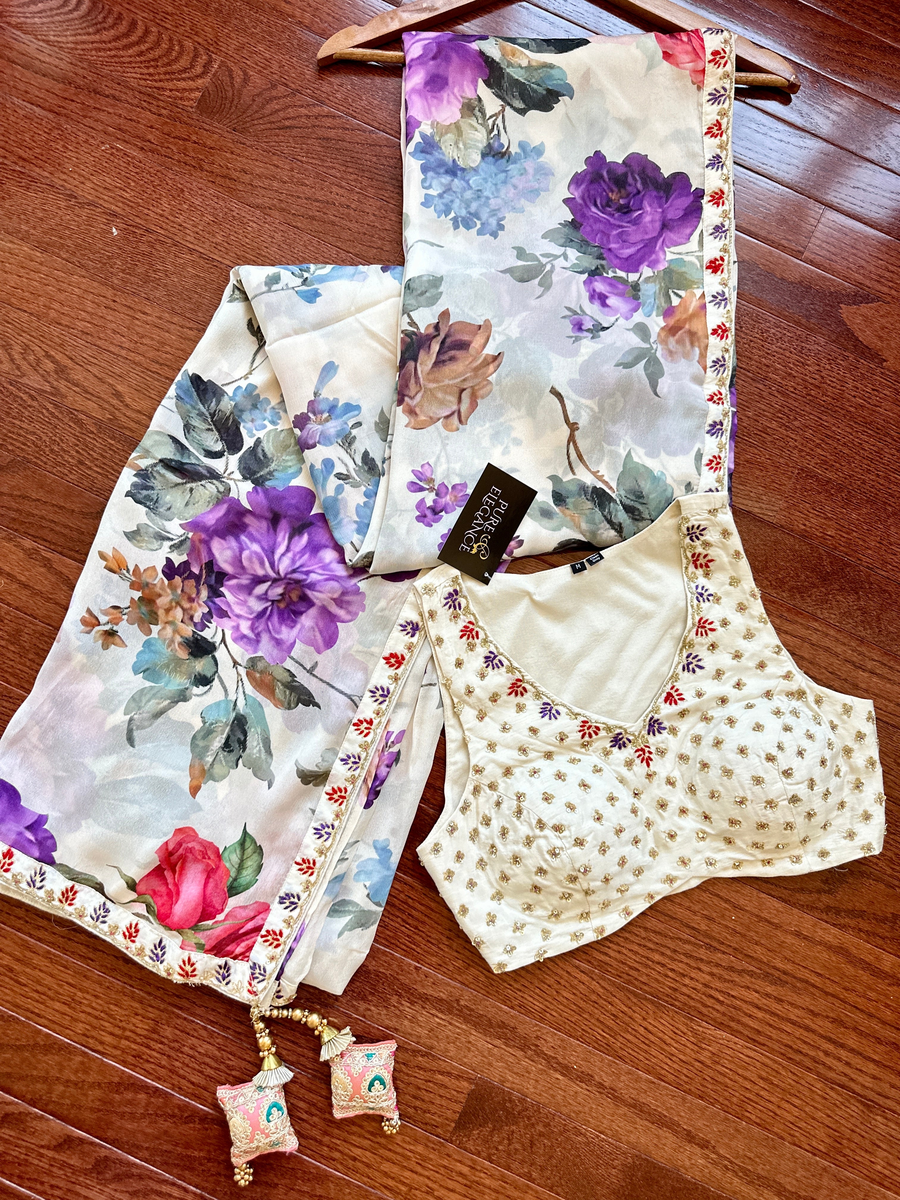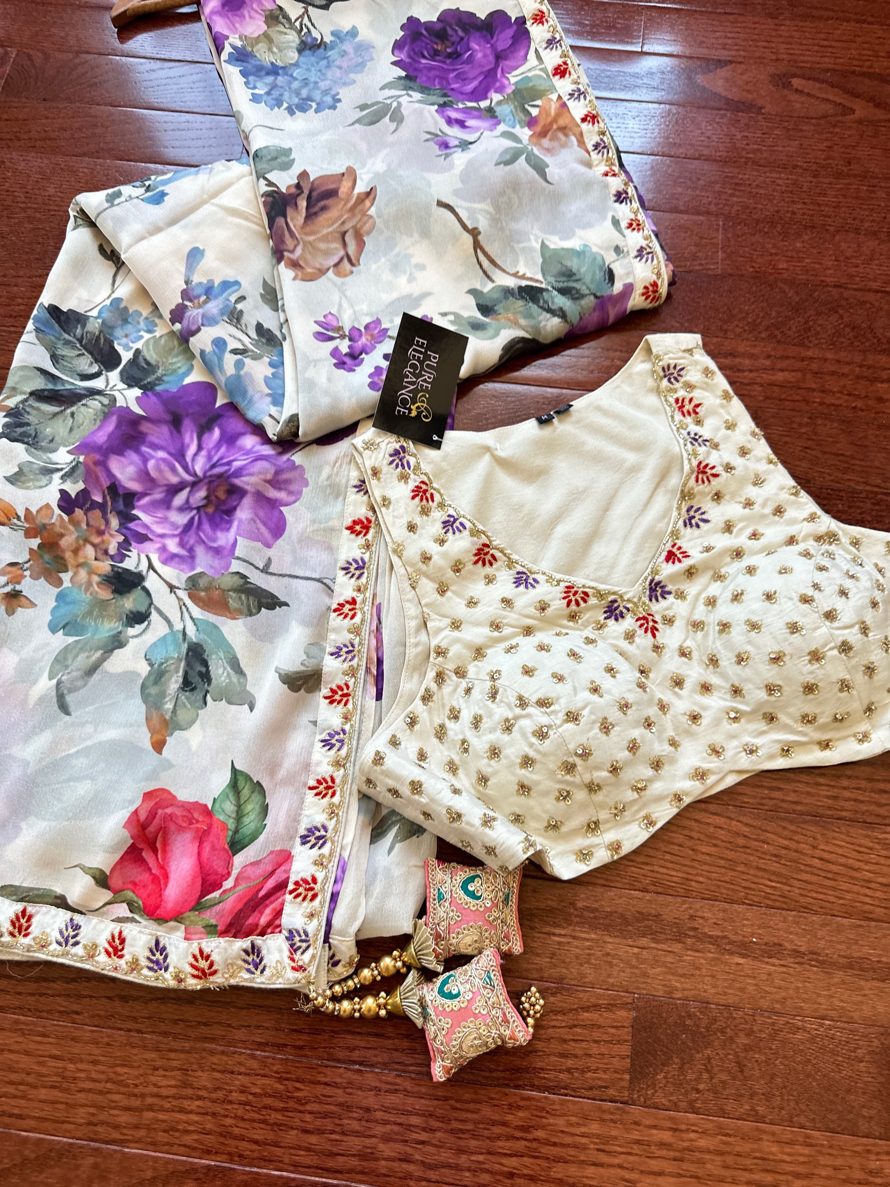 Flaunt your classy look on special occasions in this beautiful cream purple floral georgette saree. It comes with a designer saree blouse