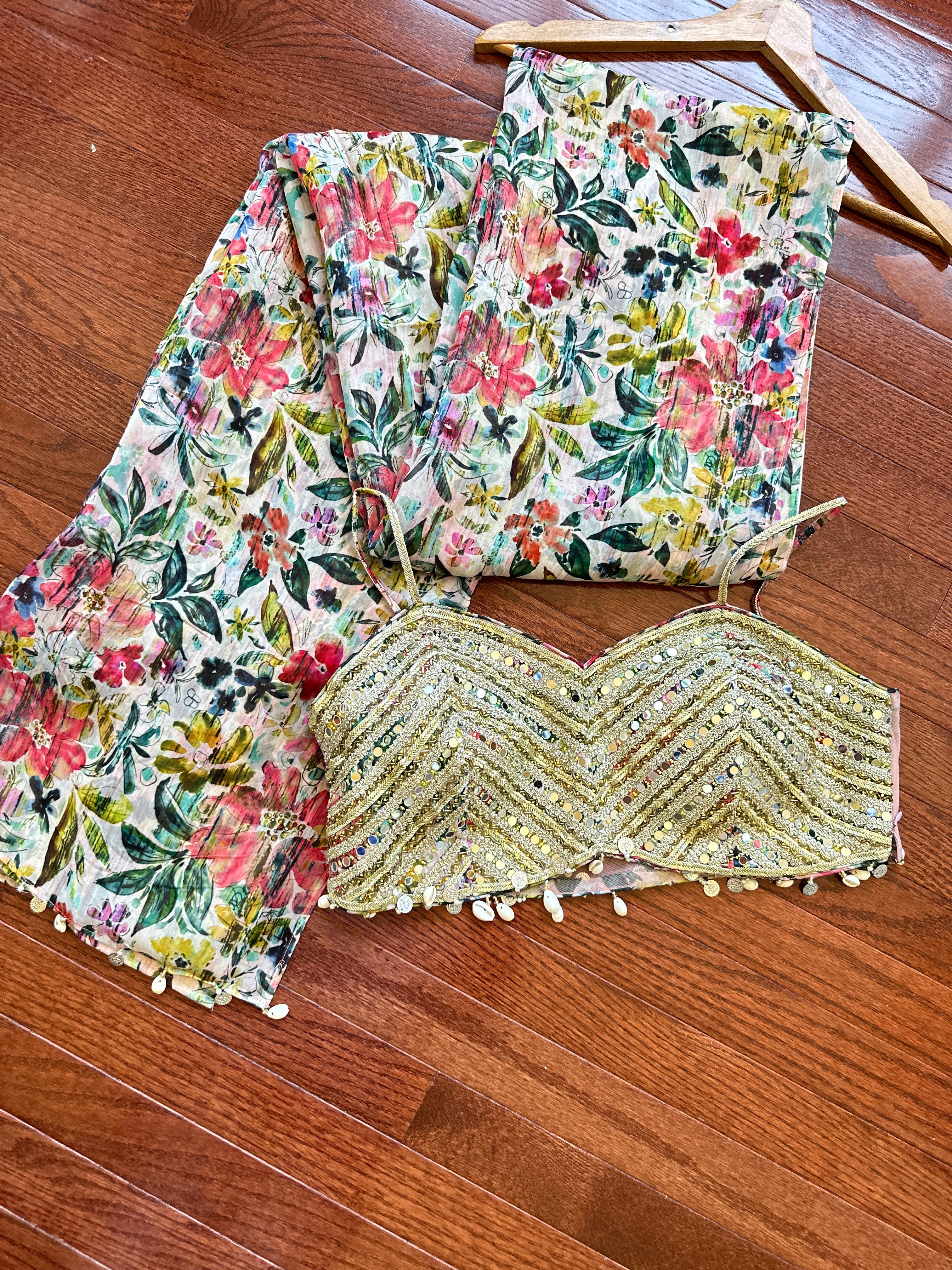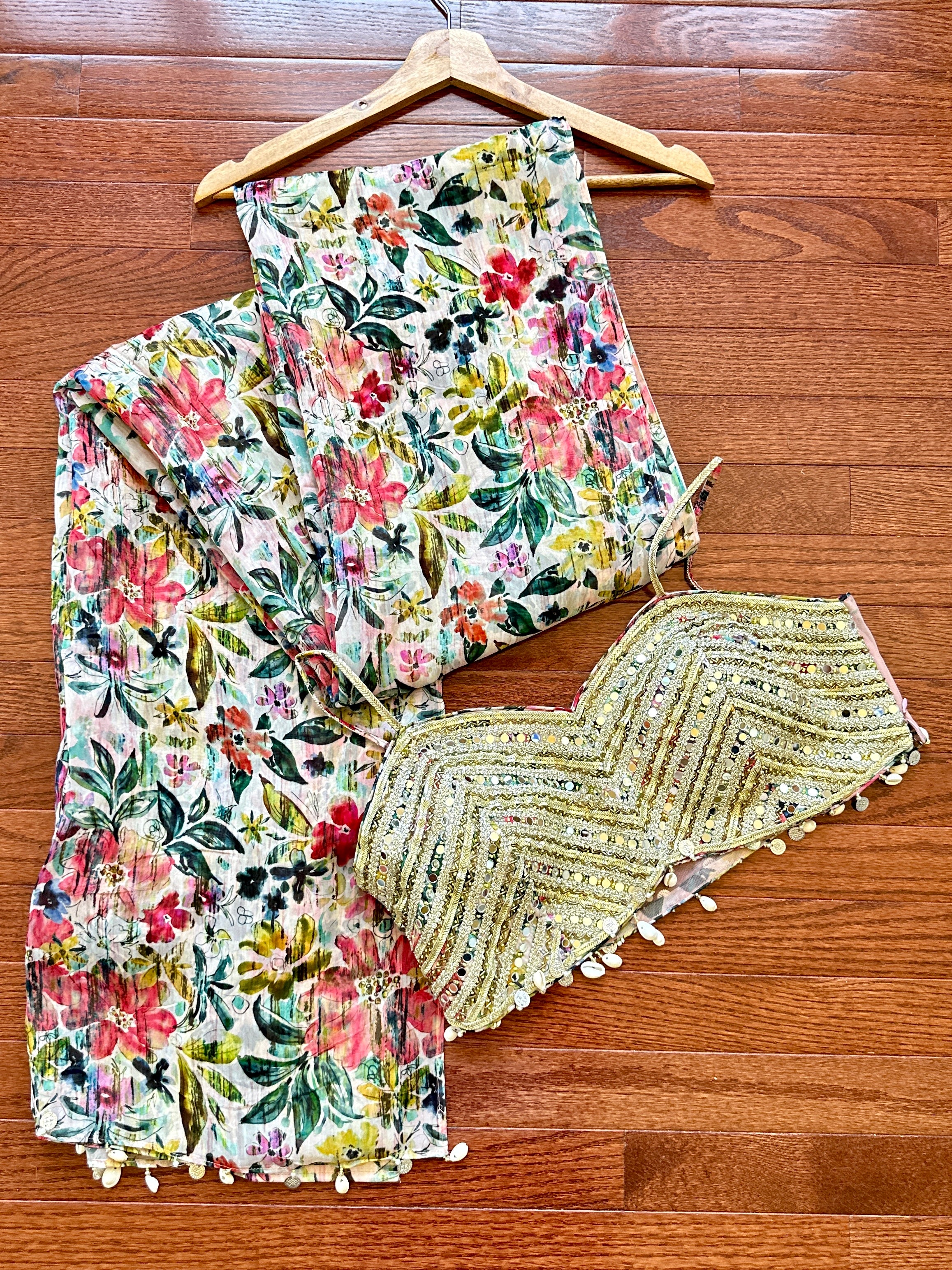 92A012 Multicolor Floral Print Organza Sari With Designer Blouse