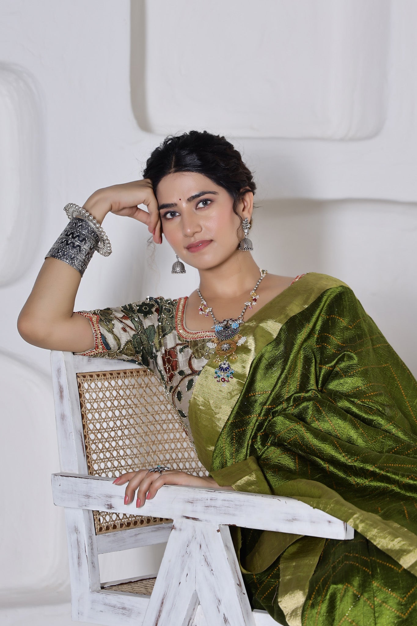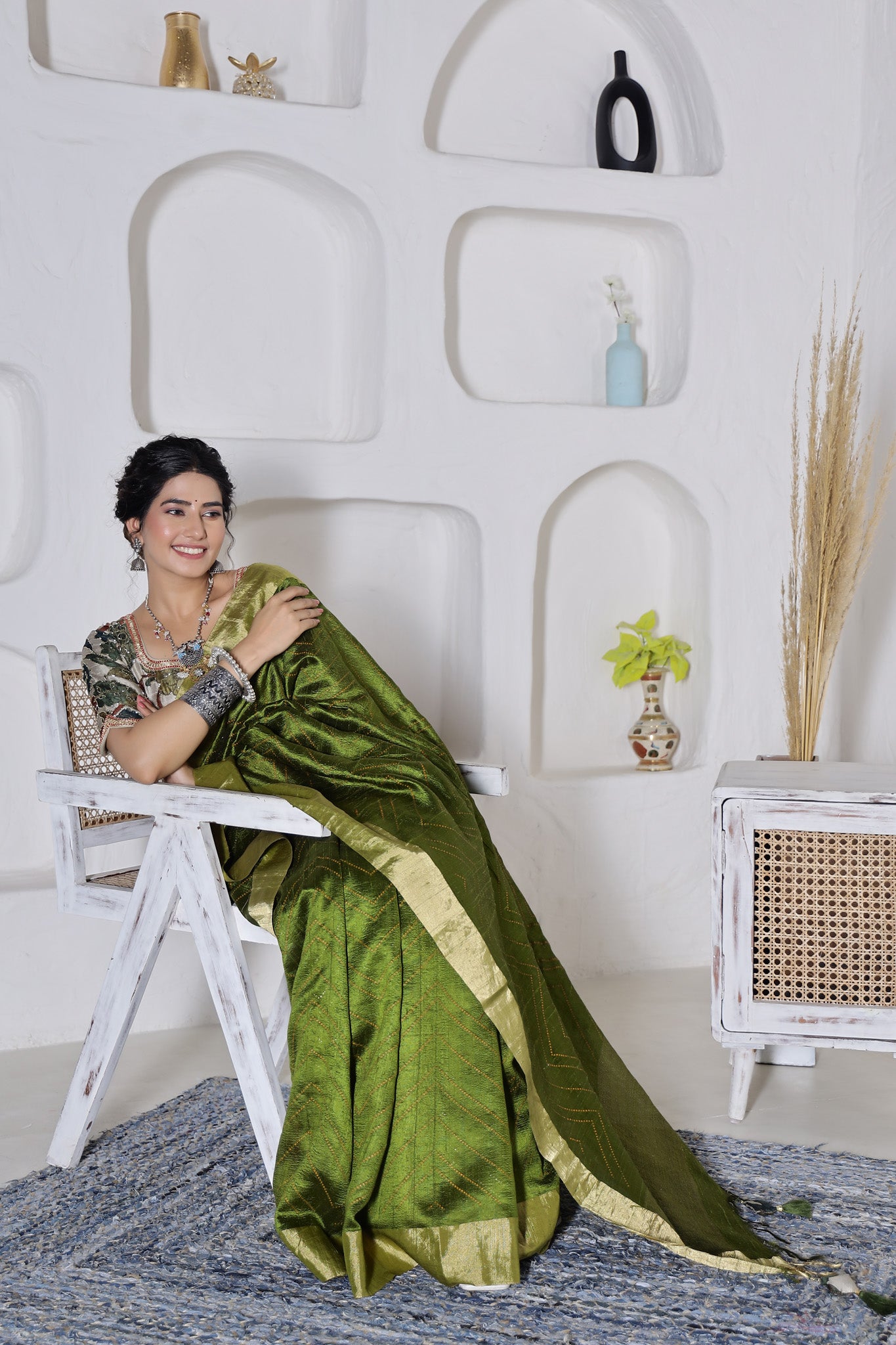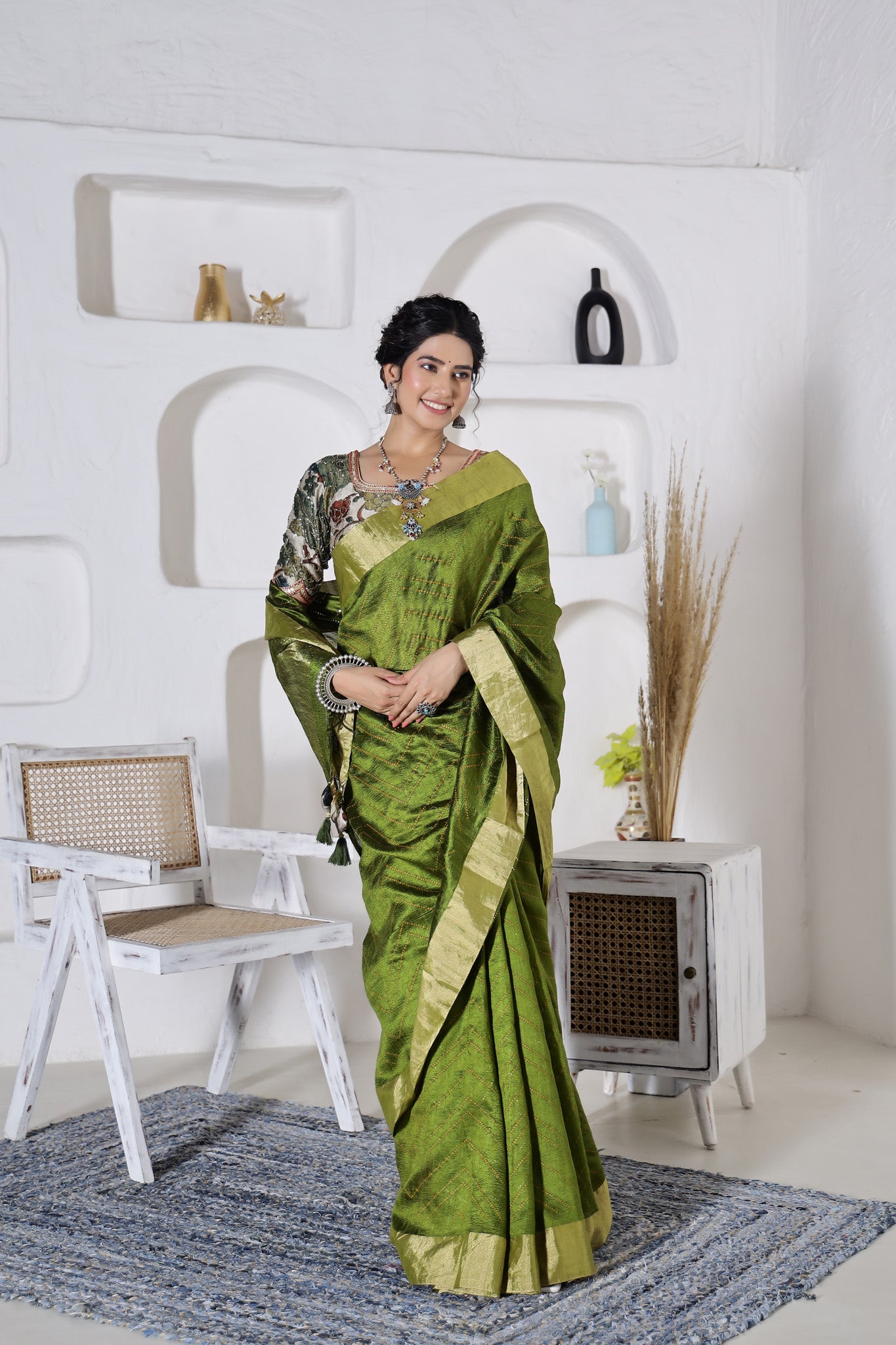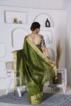 Look royal in this alluring green tussar silk saree with zari border on special occasions. It comes with a beautiful printed embroidered saree blouse.