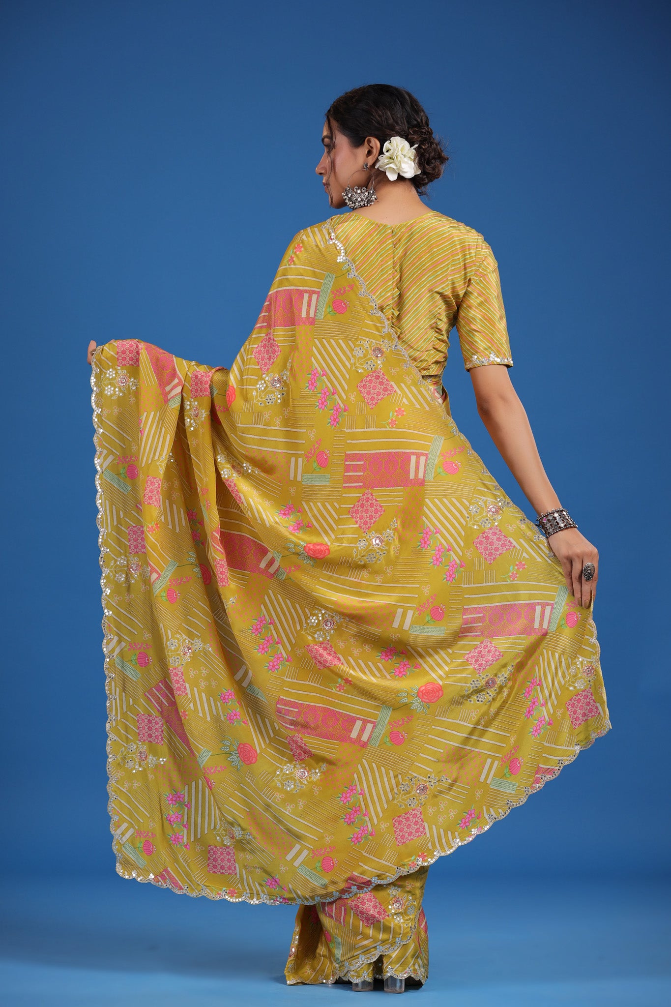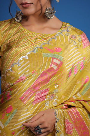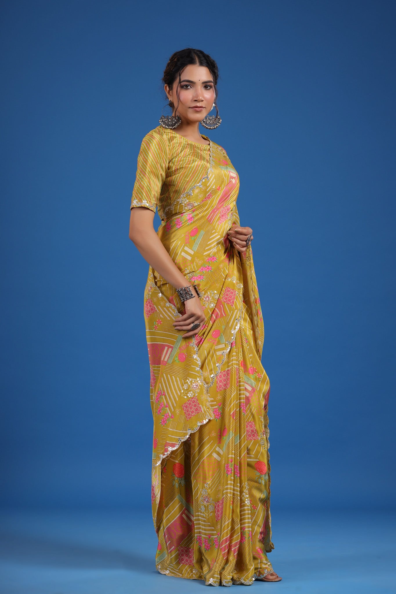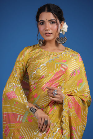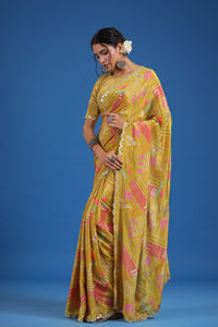 Look classy and stylish on special occasions in this alluring mustard printed crepe georgette sari. It has beautiful scalloped border and comes with a saree blouse piece.