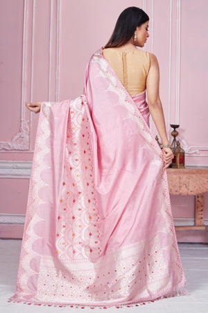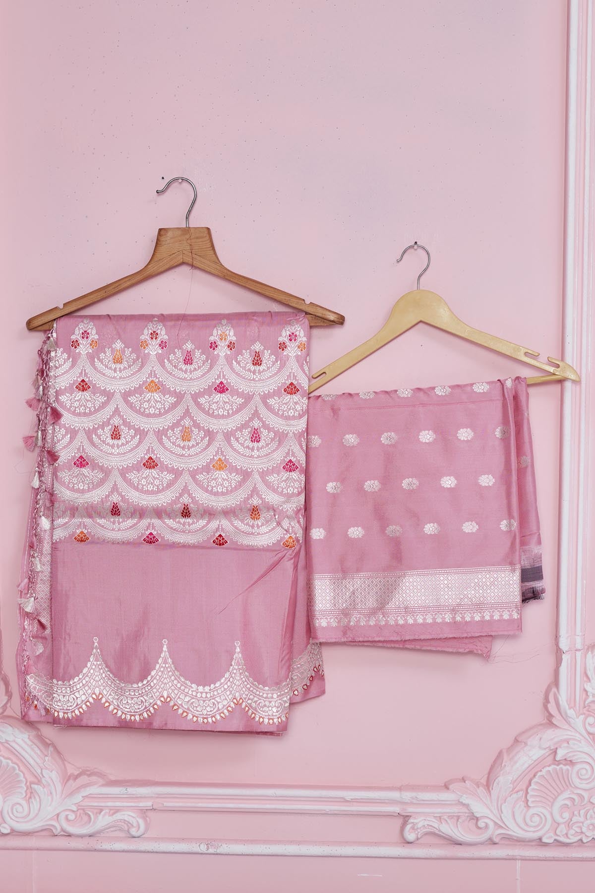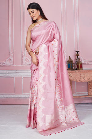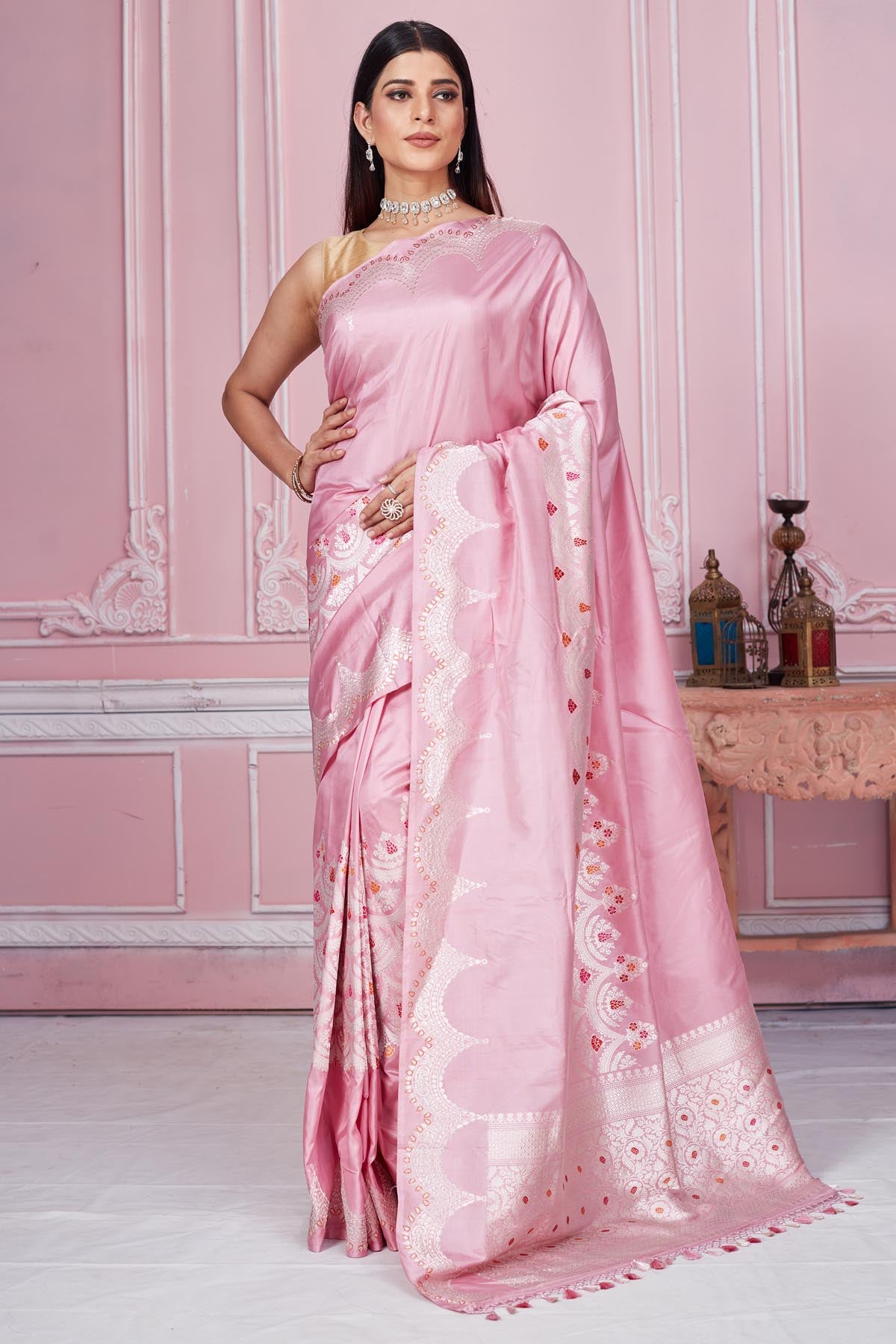 Radiate elegance on special occasions in this light pink Banarasi saree with silver zari minakari border. It comes with a blouse piece.