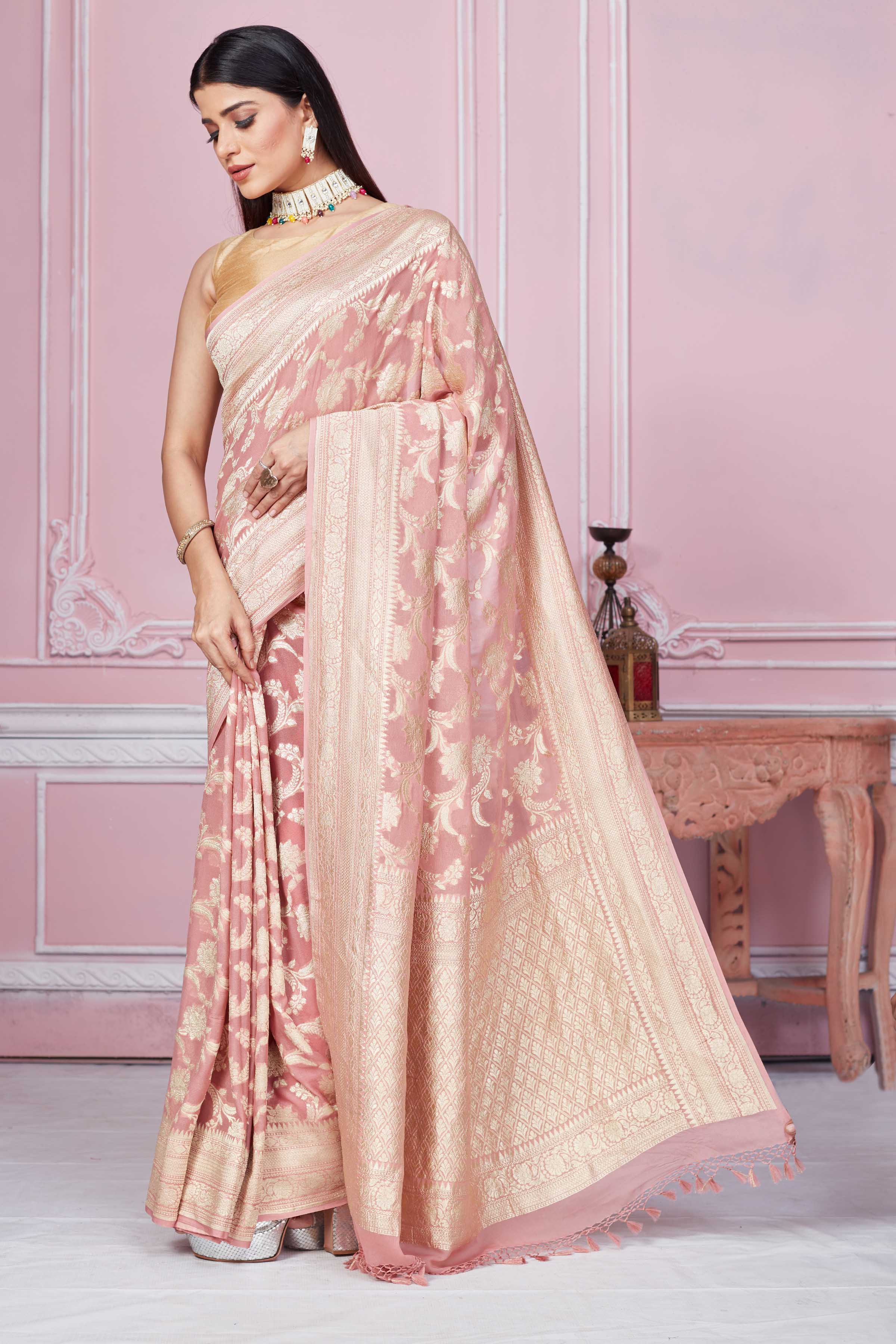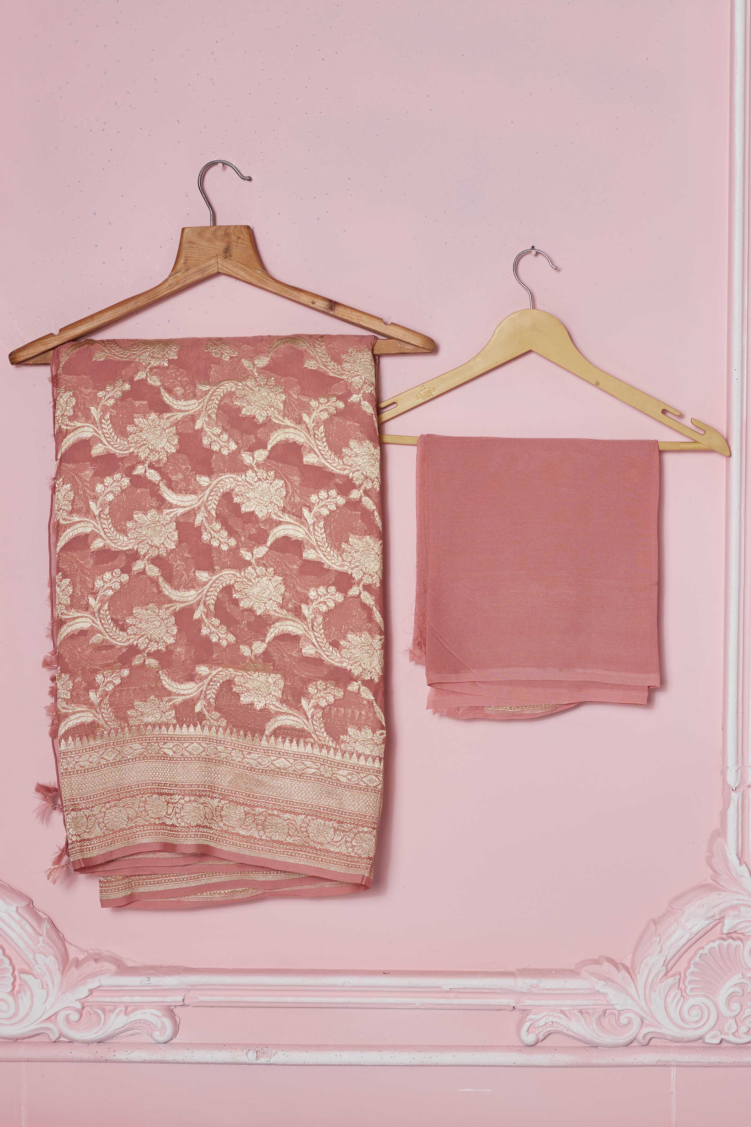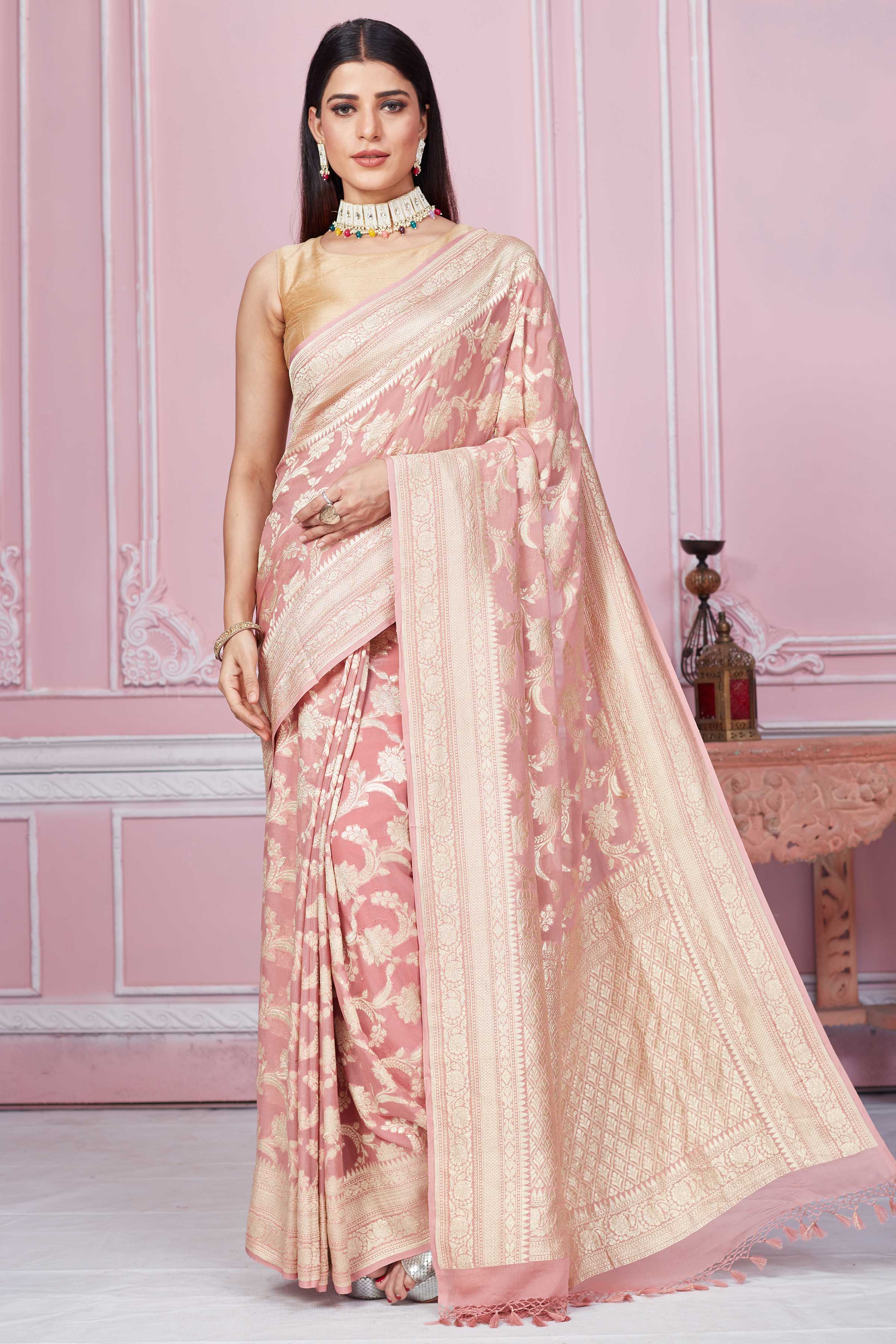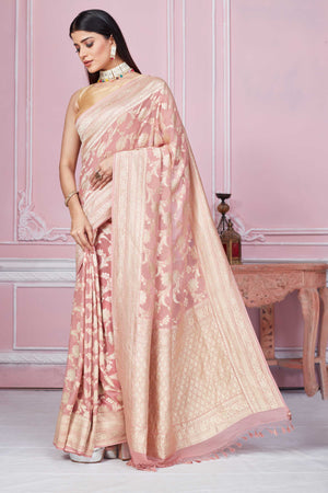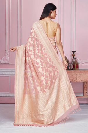 Beautiful dusty pink Banarasi saree with floral zari jaal is a perfect drape for festive occasions. It comes with a matching blouse piece.